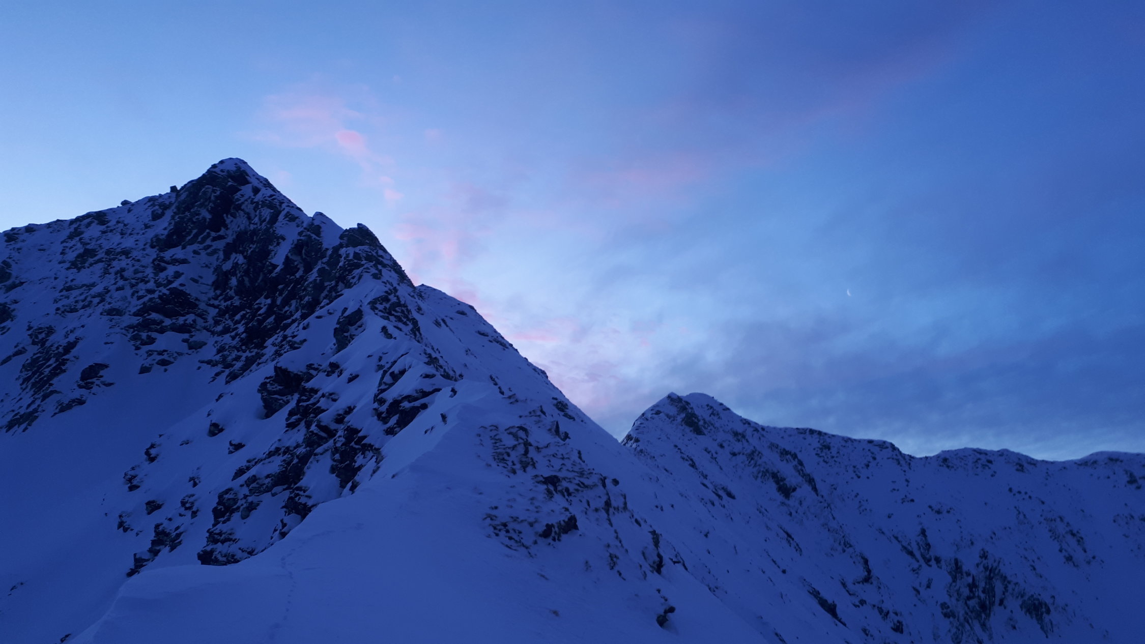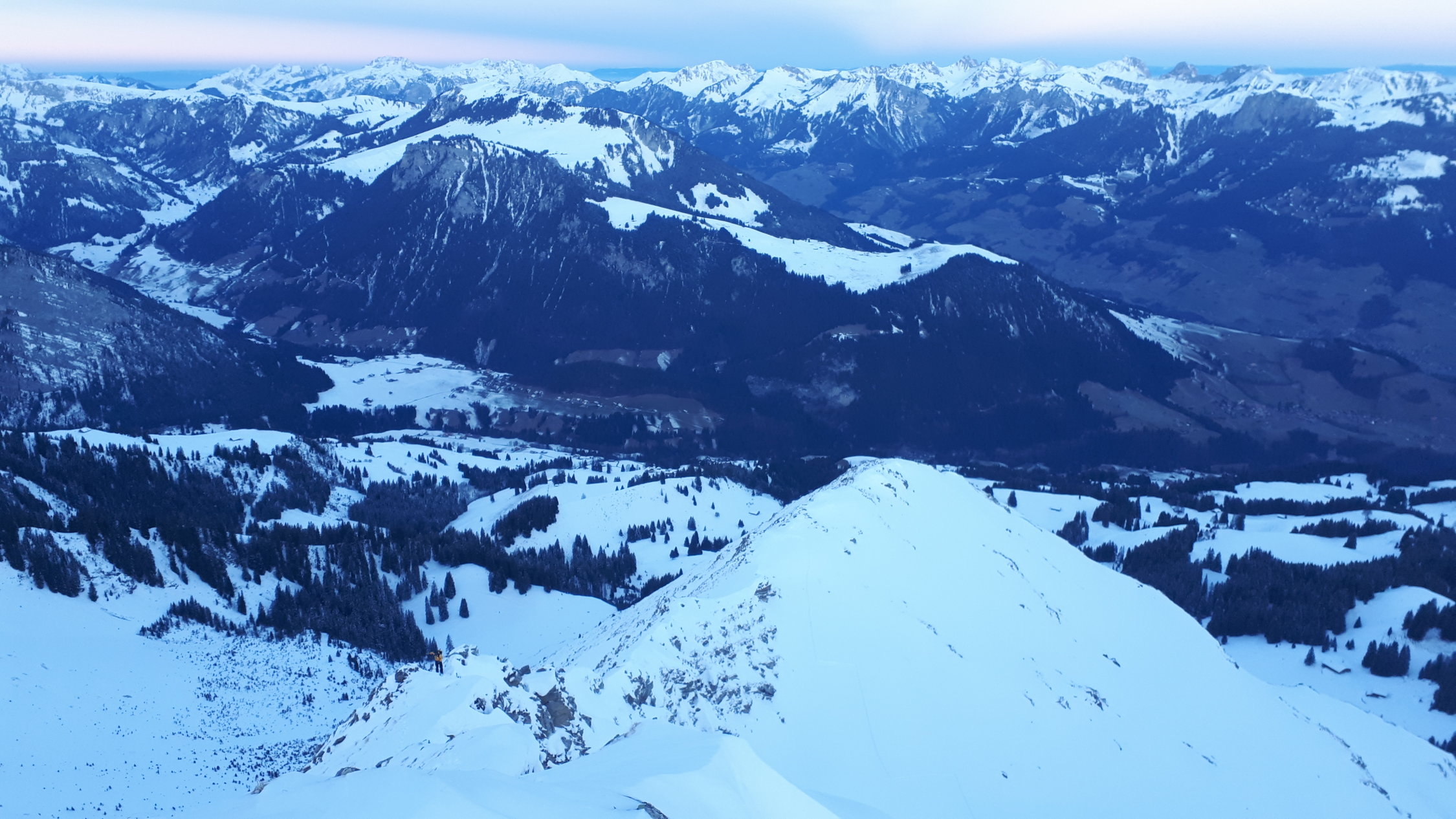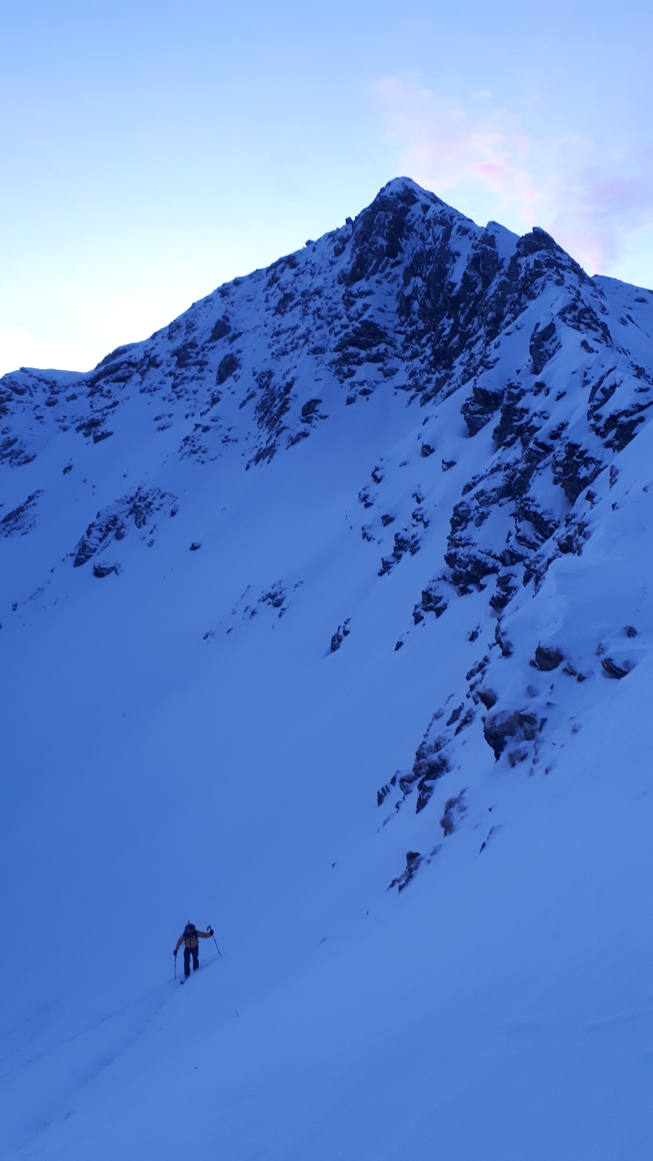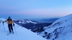 Toujours sympa et belle ambiance ces sorties matinales avant boulot. course pas trop longue avec montée efficace et petite fin alpine sur l arrête.. très belle face et combe à skier, comme les autres du Niesengrat d ailleurs :-) Face du Tschippa doit passer en skiant léger.. encore pas mal de rochers sur le haut