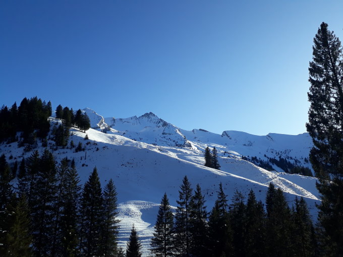 Abfahrt anschliessend erst etwas verblasener Schnee, danach Pulver, bzw. Presspulver bis Chrüzhütte.