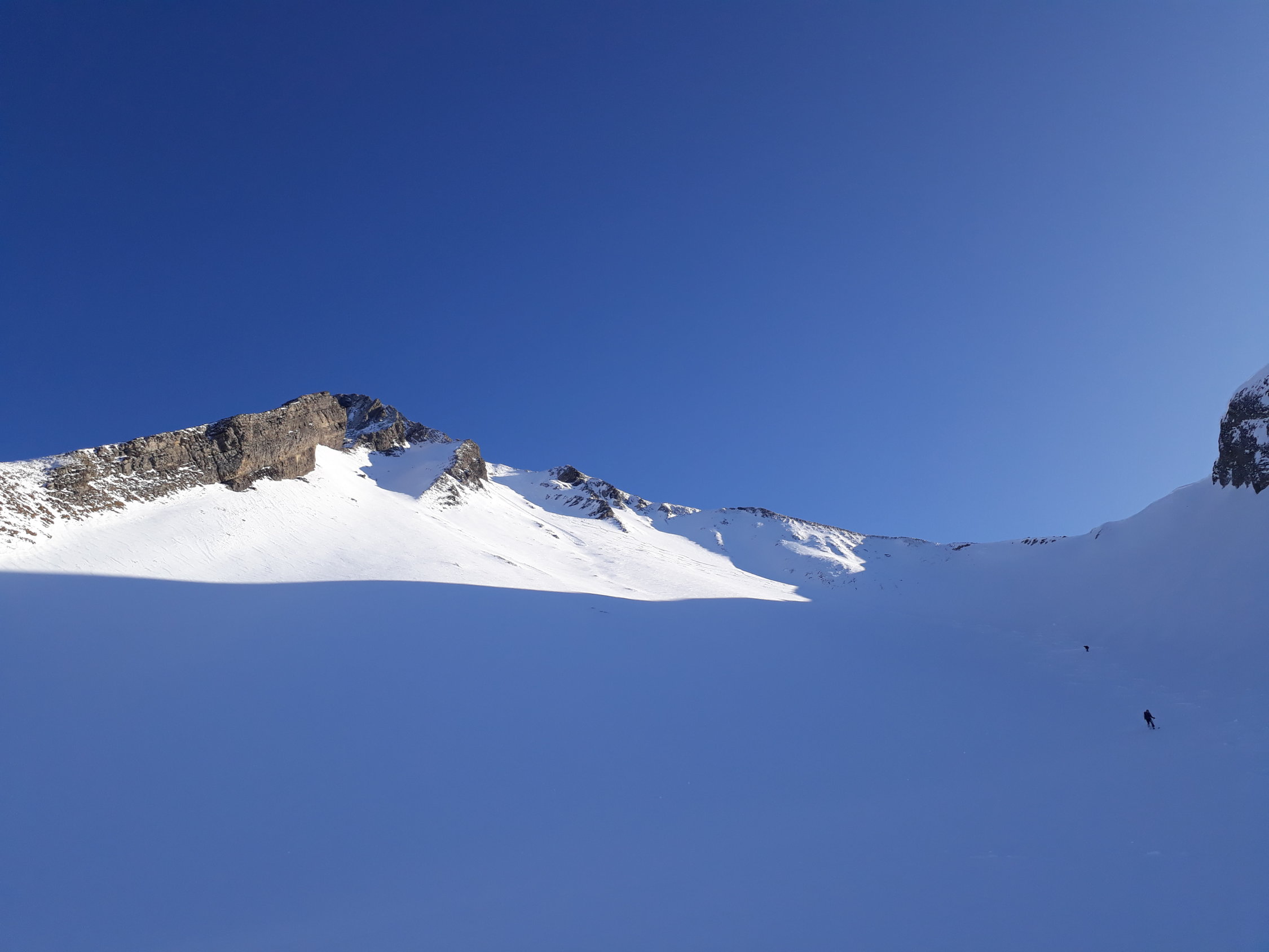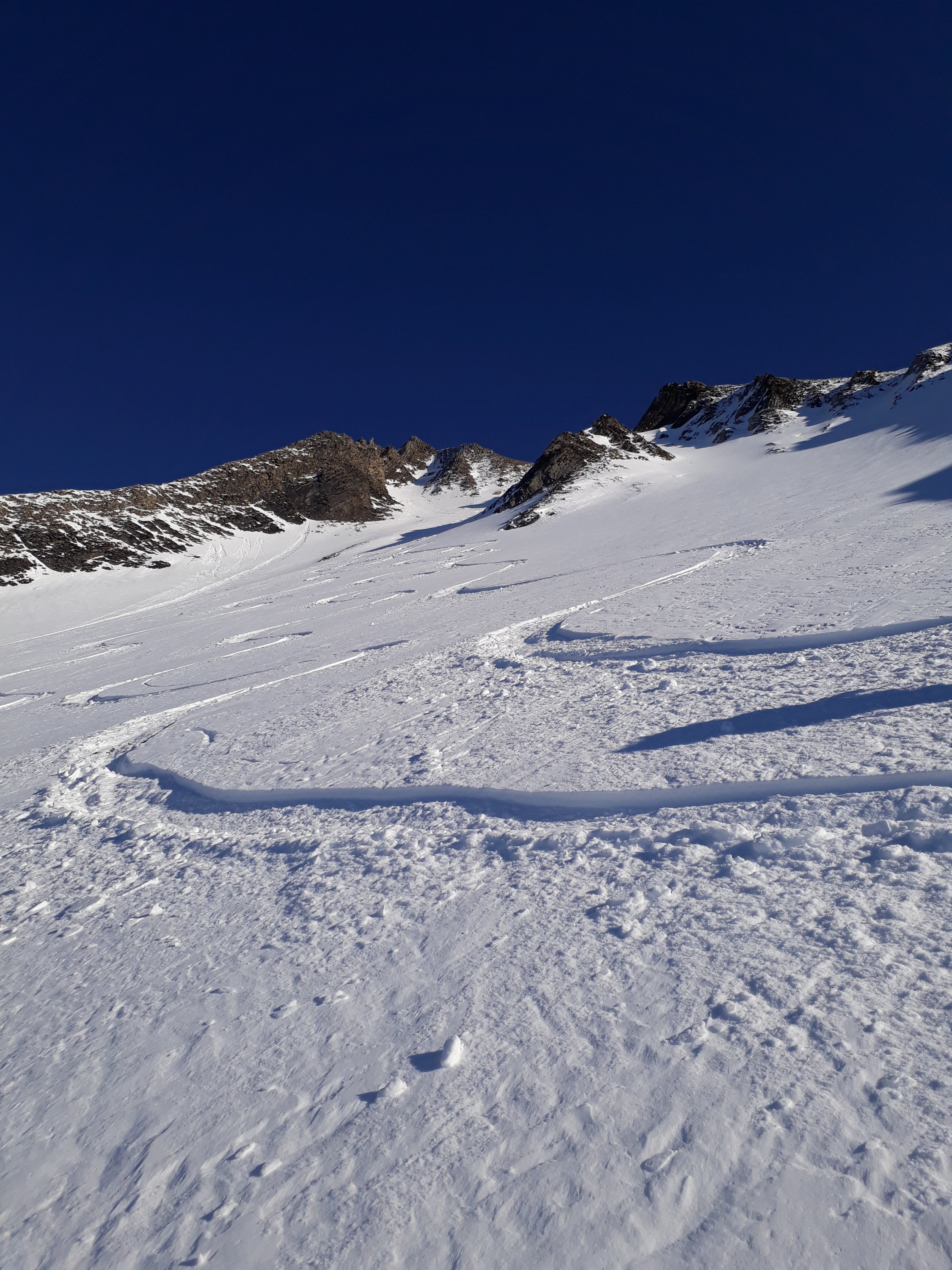 Haben die Abfahrt über den NW Hang gemacht. Beim Einstieg etwas runtergerutscht, da wenig Schnee und teilweise steinig.