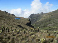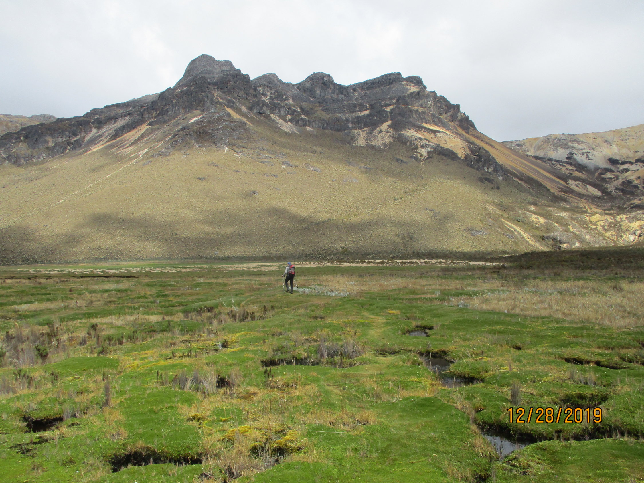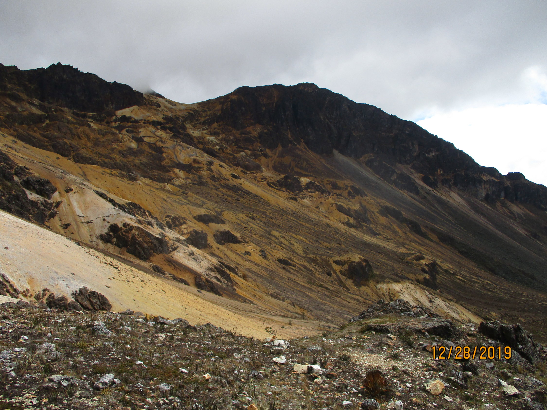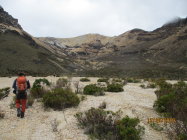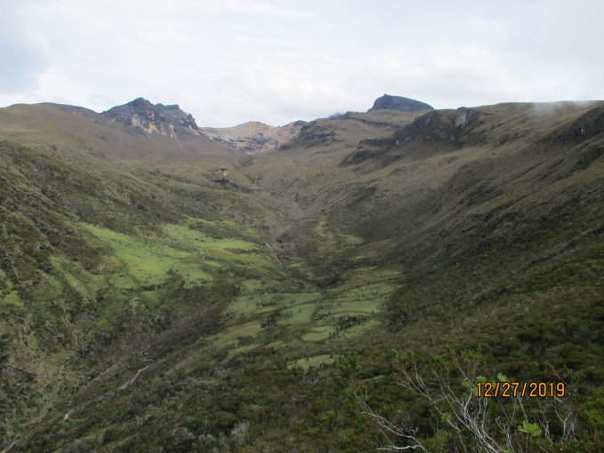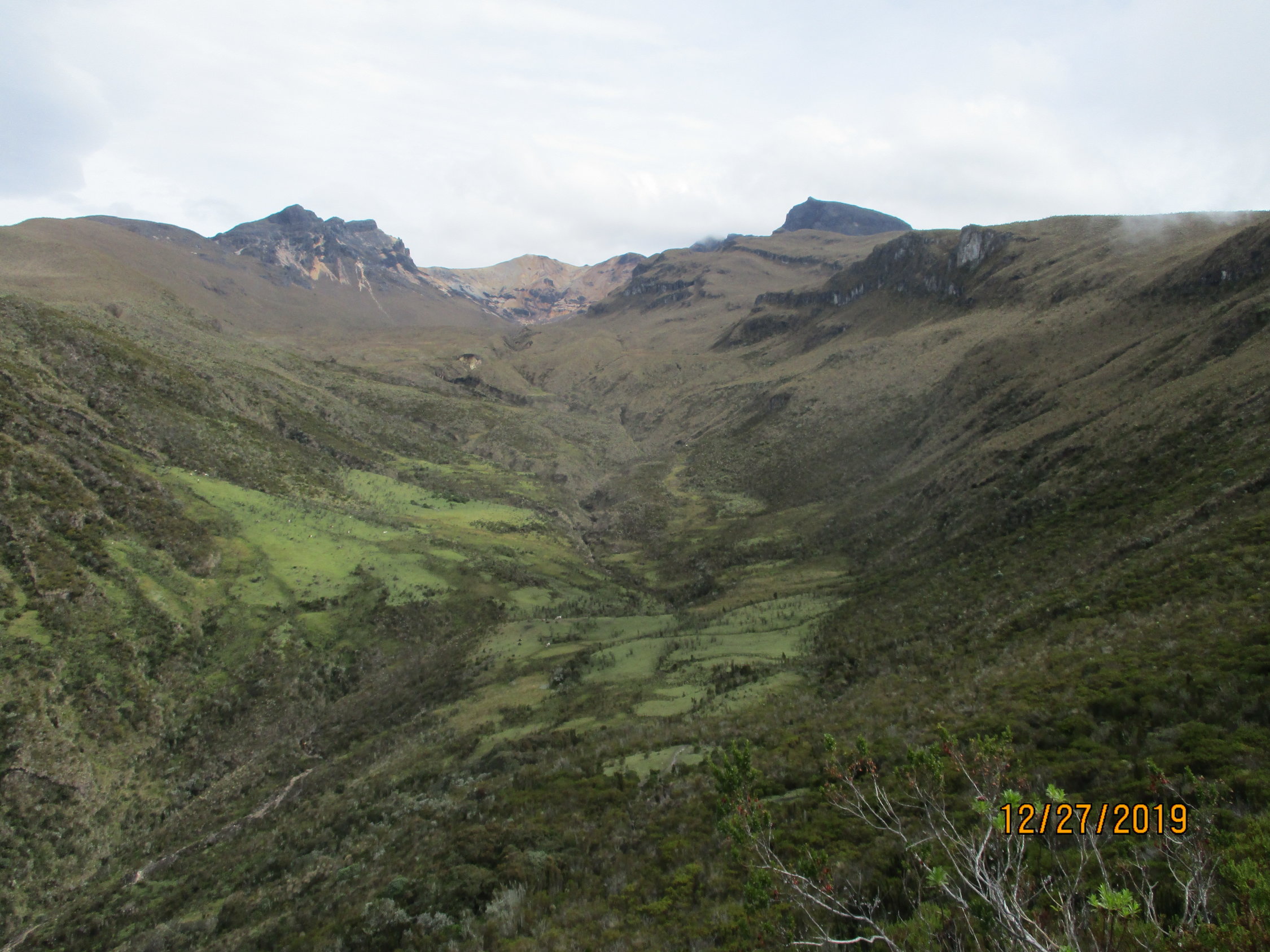Als wir die Sumpfebene erreichen, nehmen wir wir Schwefelgerüche wahr und wie wir unsere Umgebung eingehend betrachten, kommen wir zum Schluß, hier in der Sumpfebene auf einem ehemaligen Vulkankrater zu stehen. Wir sind von einem hufeinsenförmigen Bergkessel umgeben, welcher den Kraterrand bildet. Dieses gesamte Gebilde ist wohl der Paramillo del Quindío, unser Paramillo del Quindío Norte nur eine von mehreren Erhöhungen auf dem Kraterrand. Der Paramillo del Quindío Norte ist dabei ganz sicher nicht der höchste Punkt, wir können mindestens drei weitere Bergspitzen ausmachen, die höher, aber mit Sicherheit schwerer erreichbar sind. Der Hauptgipfel befindet sich südlich von uns, in diese Richtung geblickt auf der linken Seite des Kraterrandes. Auf der anderen Seite des Kraterrandes ist eine Erhebung mit "Cuchilla Berlin" benannt.