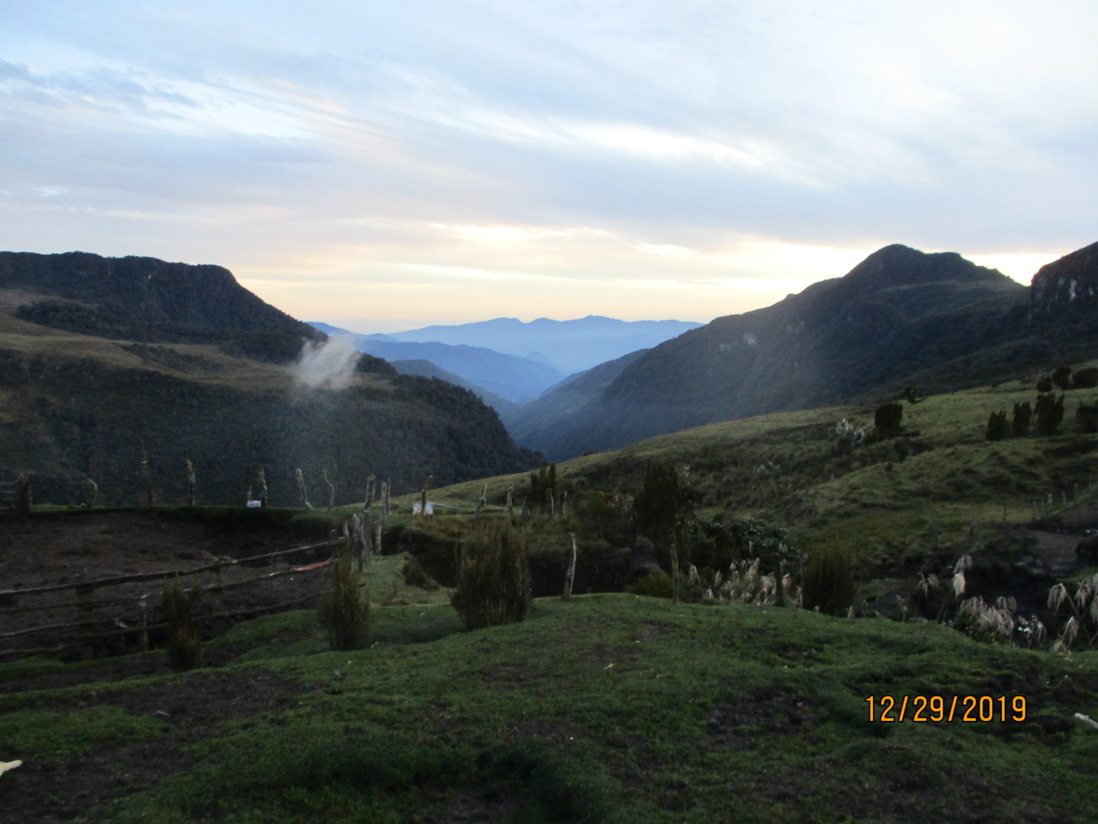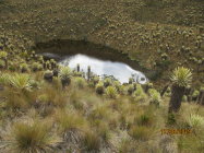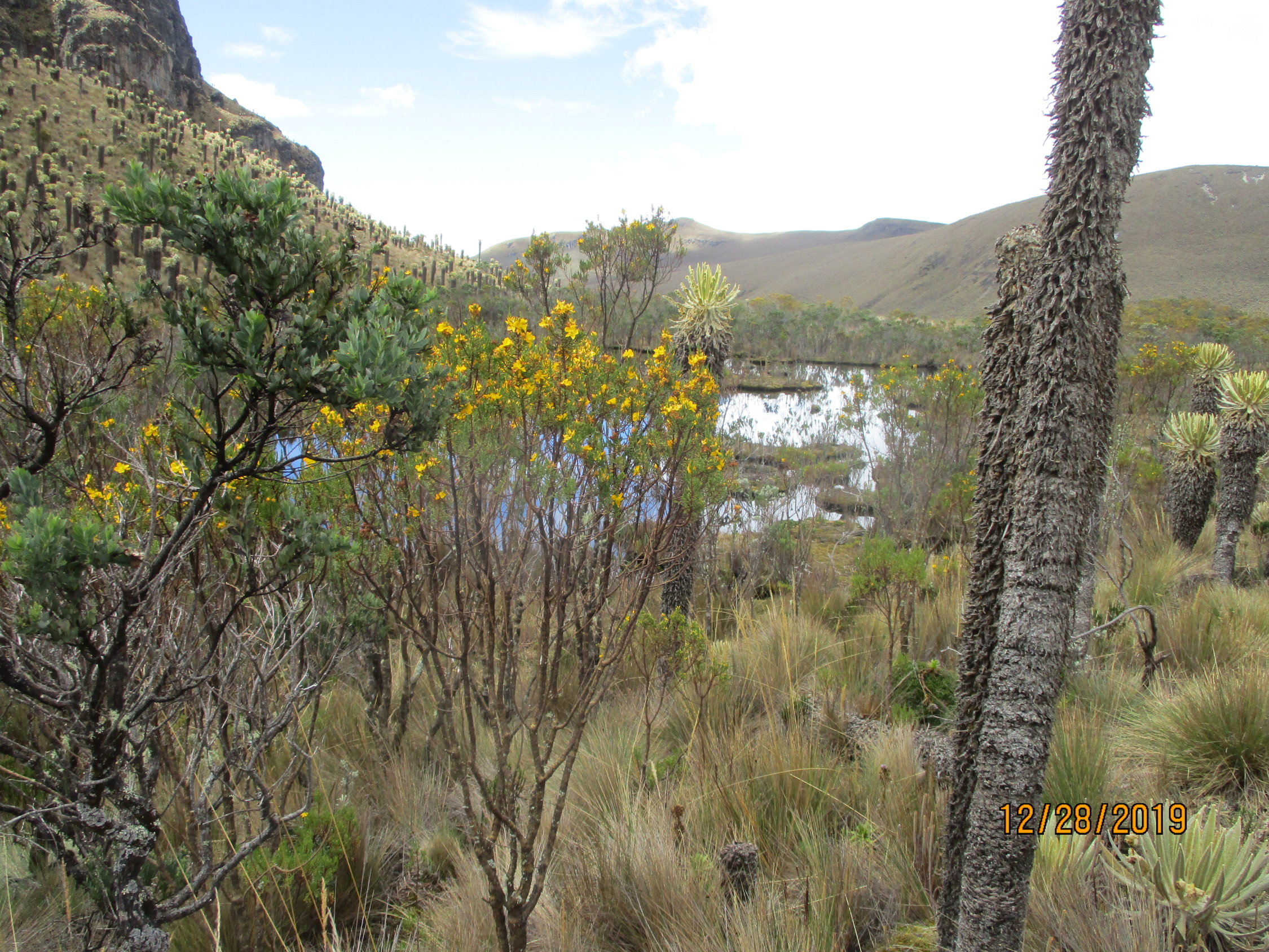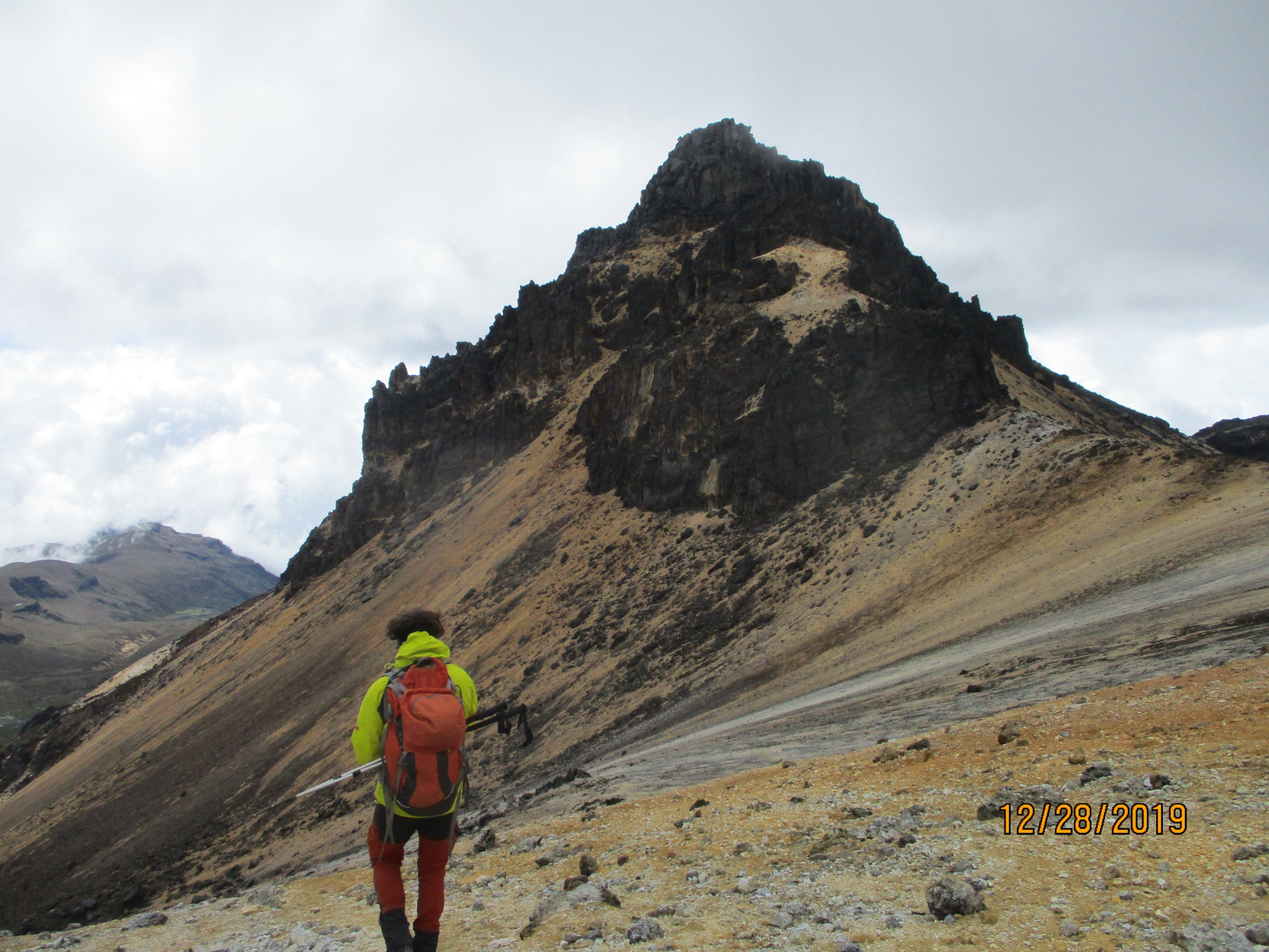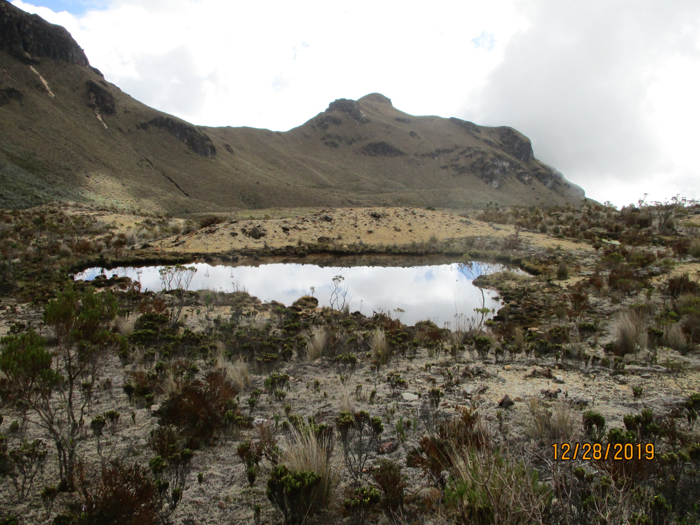 Als wir die Sumpfebene erreichen, nehmen wir wir Schwefelgerüche wahr und wie wir unsere Umgebung eingehend betrachten, kommen wir zum Schluß, hier in der Sumpfebene auf einem ehemaligen Vulkankrater zu stehen. Wir sind von einem hufeinsenförmigen Bergkessel umgeben, welcher den Kraterrand bildet. Dieses gesamte Gebilde ist wohl der Paramillo del Quindío, unser Paramillo del Quindío Norte nur eine von mehreren Erhöhungen auf dem Kraterrand. Der Paramillo del Quindío Norte ist dabei ganz sicher nicht der höchste Punkt, wir können mindestens drei weitere Bergspitzen ausmachen, die höher, aber mit Sicherheit schwerer erreichbar sind. Der Hauptgipfel befindet sich südlich von uns, in diese Richtung geblickt auf der linken Seite des Kraterrandes. Auf der anderen Seite des Kraterrandes ist eine Erhebung mit "Cuchilla Berlin" benannt.
