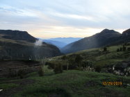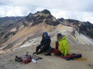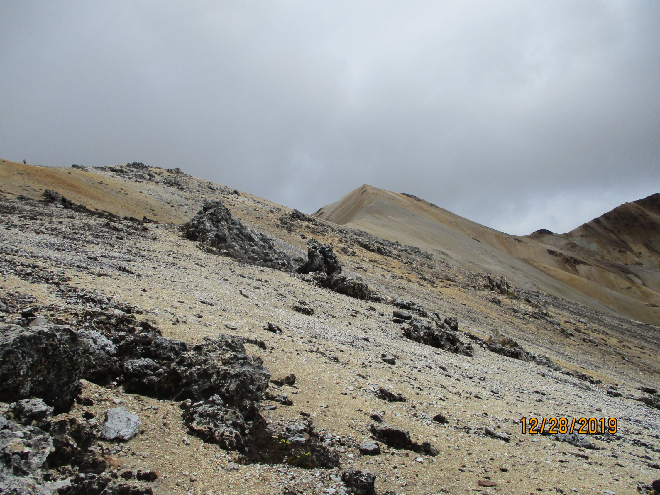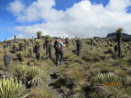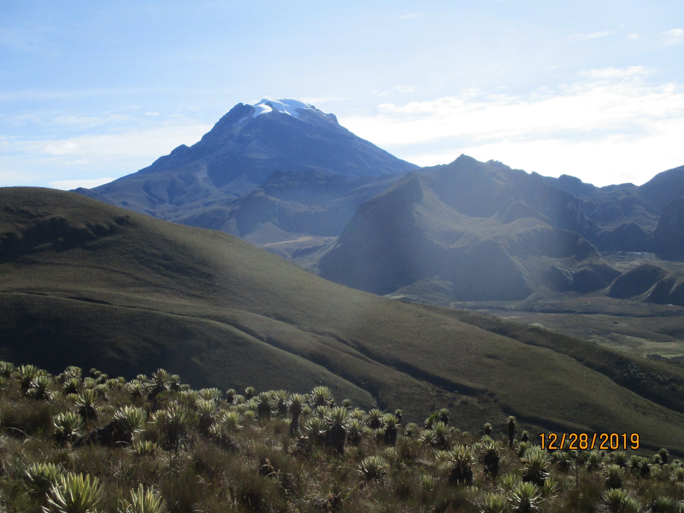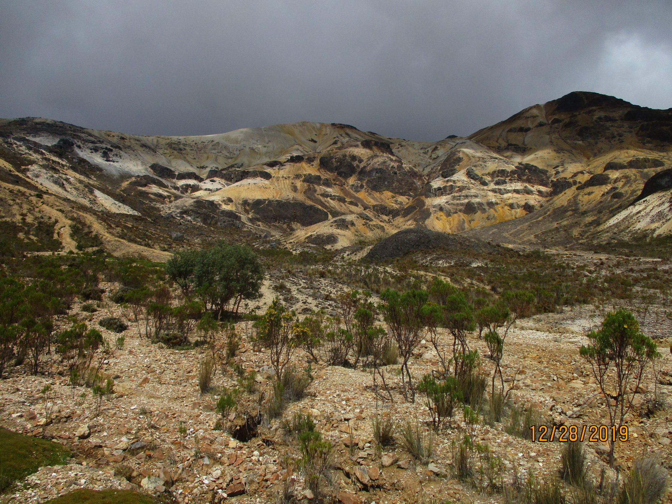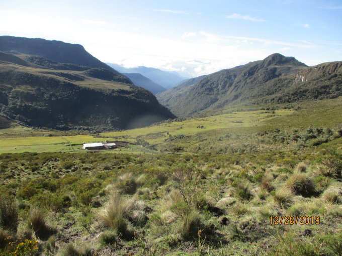 Als wir die Sumpfebene erreichen, nehmen wir wir Schwefelgerüche wahr und wie wir unsere Umgebung eingehend betrachten, kommen wir zum Schluß, hier in der Sumpfebene auf einem ehemaligen Vulkankrater zu stehen. Wir sind von einem hufeinsenförmigen Bergkessel umgeben, welcher den Kraterrand bildet. Dieses gesamte Gebilde ist wohl der Paramillo del Quindío, unser Paramillo del Quindío Norte nur eine von mehreren Erhöhungen auf dem Kraterrand. Der Paramillo del Quindío Norte ist dabei ganz sicher nicht der höchste Punkt, wir können mindestens drei weitere Bergspitzen ausmachen, die höher, aber mit Sicherheit schwerer erreichbar sind. Der Hauptgipfel befindet sich südlich von uns, in diese Richtung geblickt auf der linken Seite des Kraterrandes. Auf der anderen Seite des Kraterrandes ist eine Erhebung mit "Cuchilla Berlin" benannt.