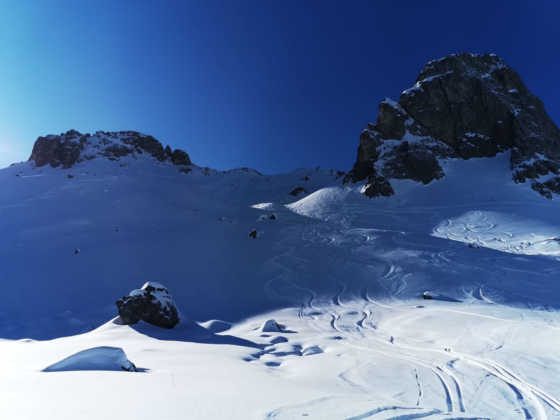 Abfahrt ab Steinmann direkt in den Nordosthang, trotz einiger Spuren immer noch toller Pulver bis fast zum letzten Steilhang vor dem Berghaus Edelweiss. Auf dem Weg/Strasse zurück nach Engi und bei Rütiwald über die Wiese zurück nach Litzirüti.