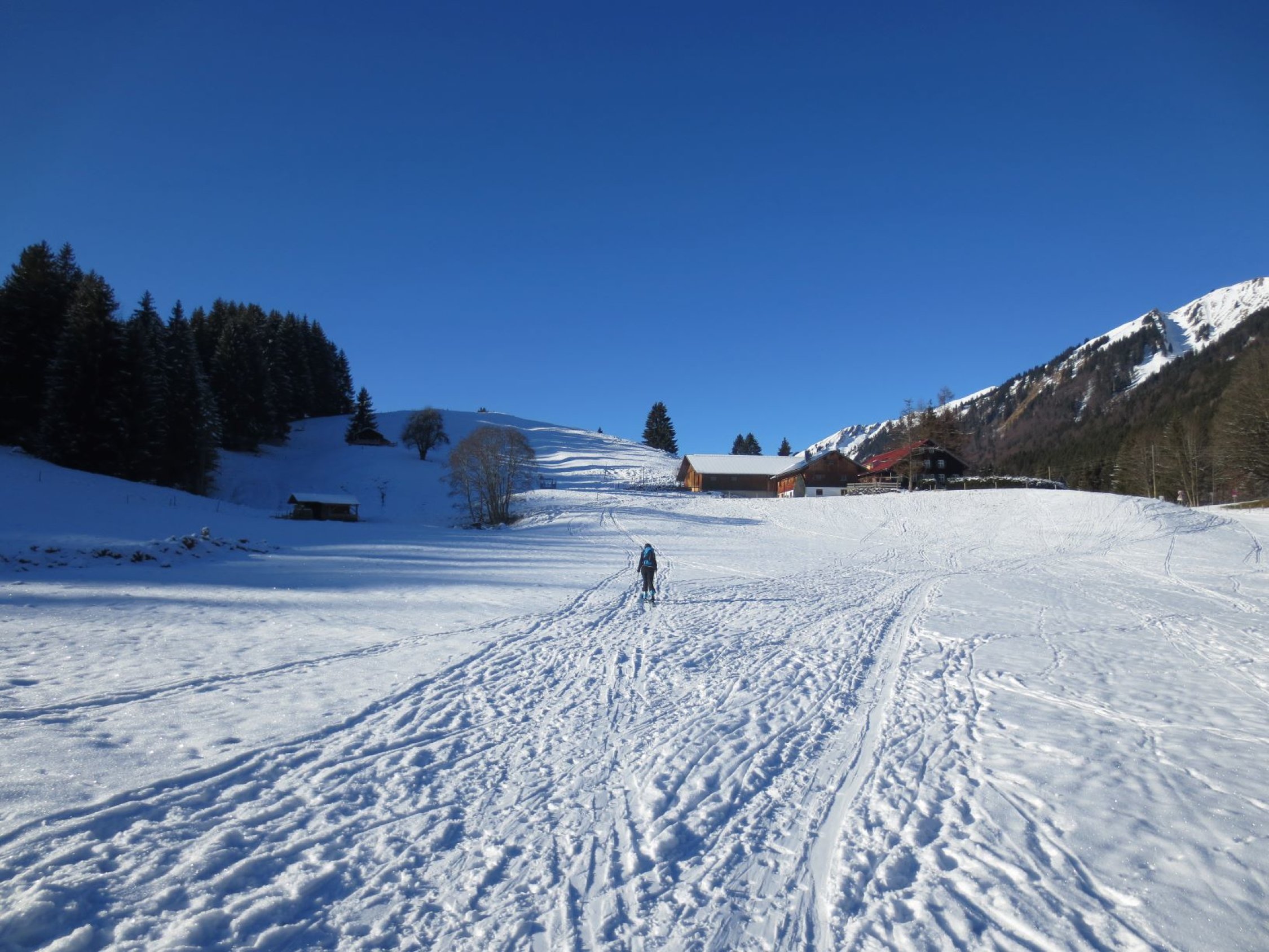 Ab Säge gerade ausreichend Schnee für den Aufstieg. Mit der Höhe wird die Schneeauflage immer besser. Ab Birkach Alpe Top Verhältnisse. Im Gipfelhang gute 30cm Pulver. Schon viele Spuren drin aber noch gut zu fahren. Allerdings ein kurzes Vergnügen. Rückweg über Rappengeschwender Alpe (geschlossen) und auf der Rodelbahn zurück ins Tal. Schnee bis zur Schranke, danach noch 15min Ski tragen zum PP.