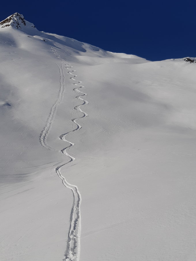 Wenn man nicht auf die Gehrenspitze oder den Schafberg direkt geht, sondern auf die umliegenden Erhebungen hat es mehr als genug Platz für eigene Spuren- alles im Traum Pulver. Von den Hauptgipfeln alles schon ziemlich zerfahren. Die oberen 500 bis 600 Höhenmeter Traum Pulver. unten raus dann teilweuse etwas ruppig. In Firn oder weichem Nassschnee.