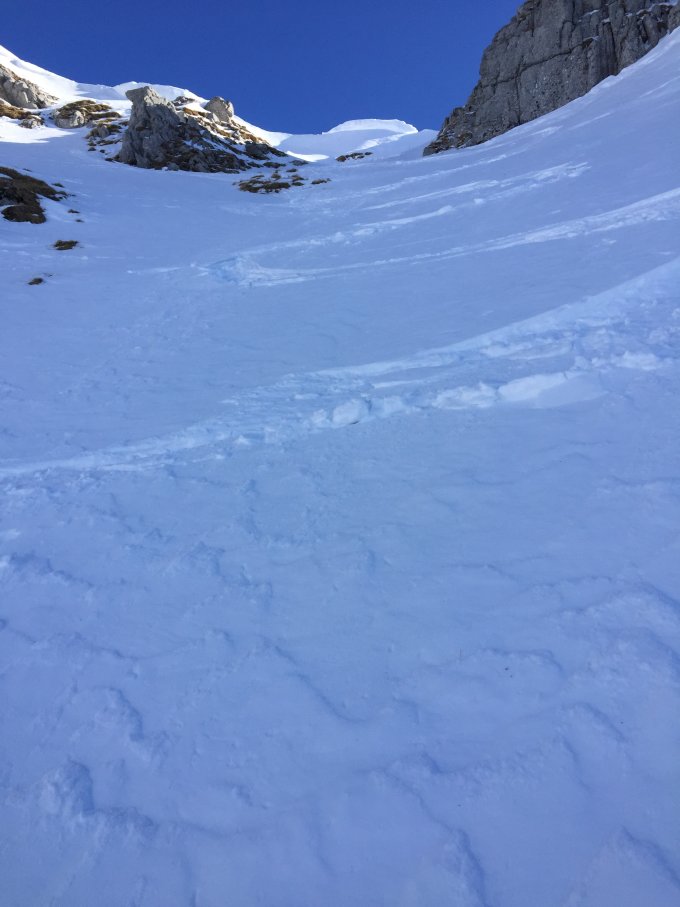 der Neuschnee vom vergangenen Freitag ist allgemein gut mit dem Altschnee verbunden. Harscheisen sind trotzdem nützlich, vor allem für den Abschnitt unterhalb Kaisereggpass. Schlusshang zum Gipfel Frühlingsschnee.