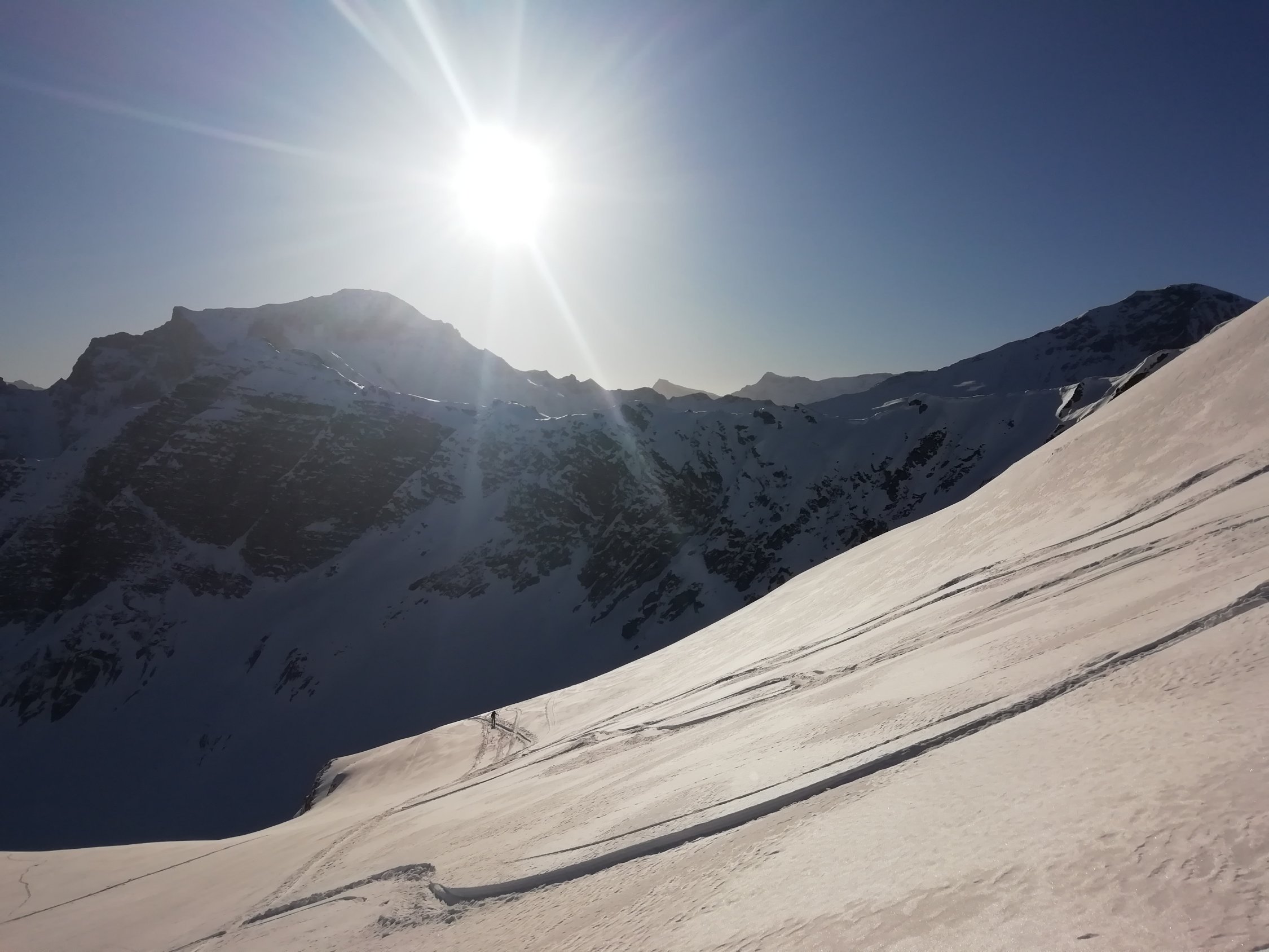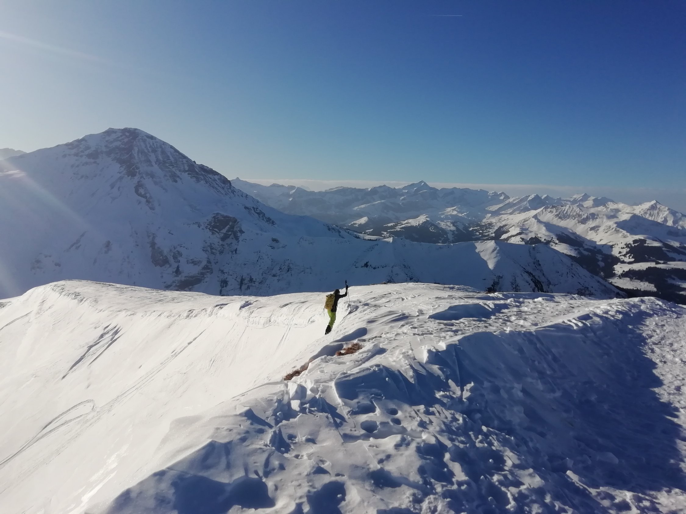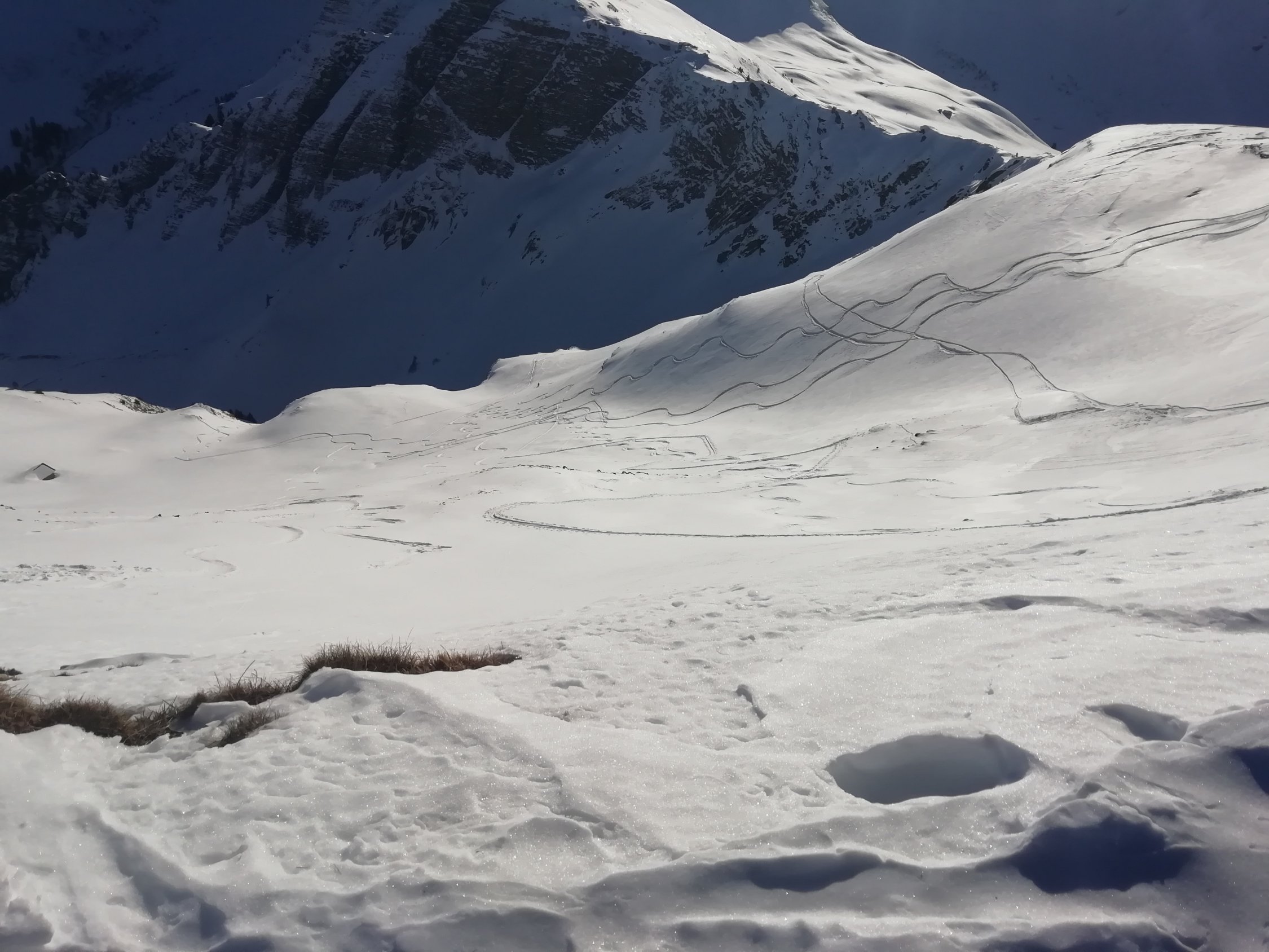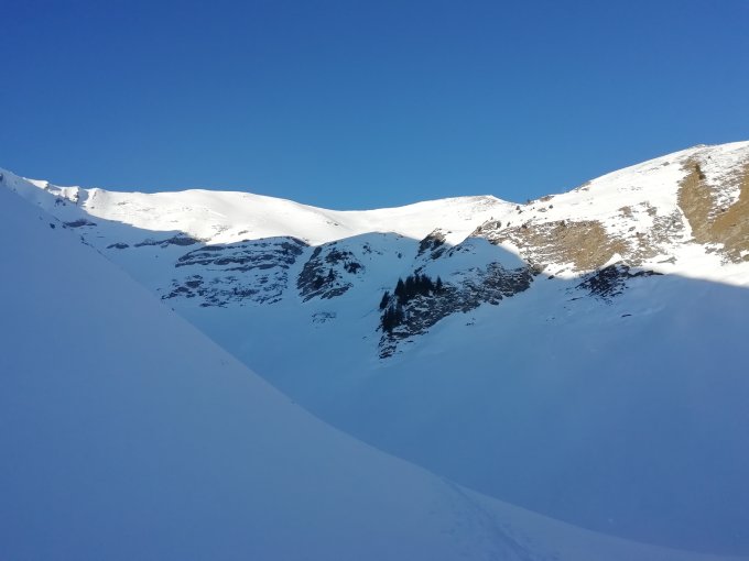 Durchgehend gute Spur, oberster Hang etwas von der Sonne geprägt, sonst durchgehend guter Pulver, unterster Steilhang mit Lawinenunterlage etwas mit Vorsicht zu genießen.