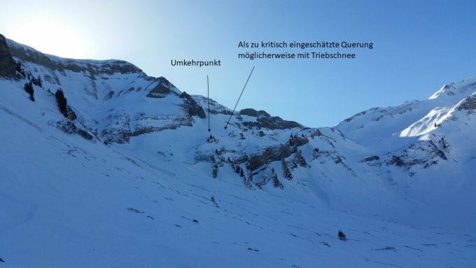 Triebschnee in der letzten Mulde hätte einen beim Abrutschen über eine Felsabsatz getragen. Siehe Foto. Die Abfahrt dann zwar ohne Steinkontakt, aber eher ungemütlich. Hart, Winddeckel, nur im untersten Bereich ein paar Presspulverschneeschwünge möglich. Wir waren überrascht, wie stark der Wind hier den Schnee geprägt hat. Wetter war allerdings top, unglaublich warm in der Sonne!