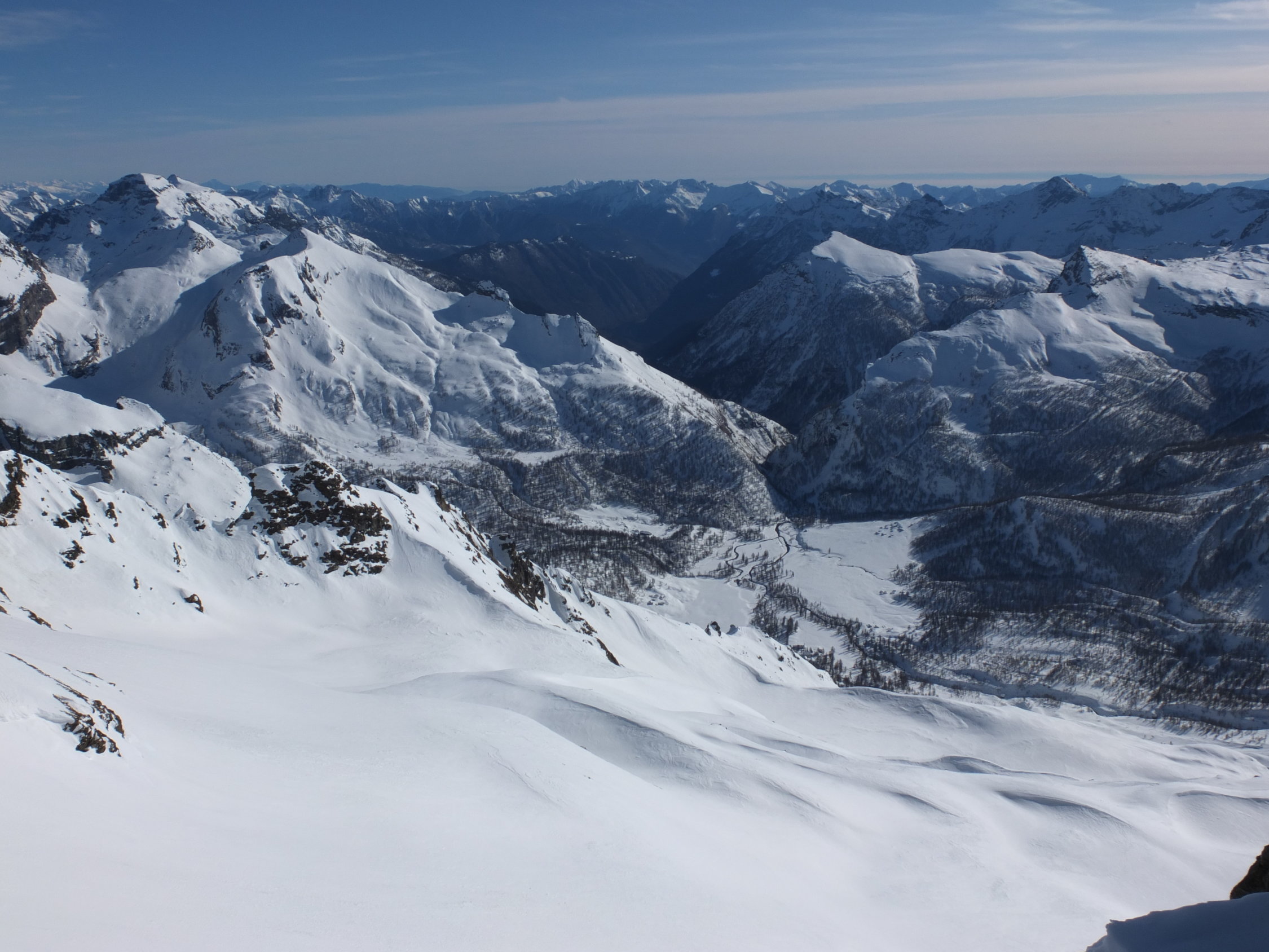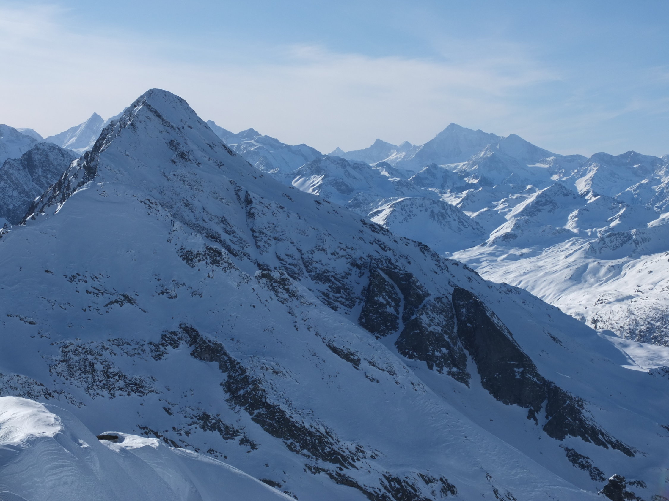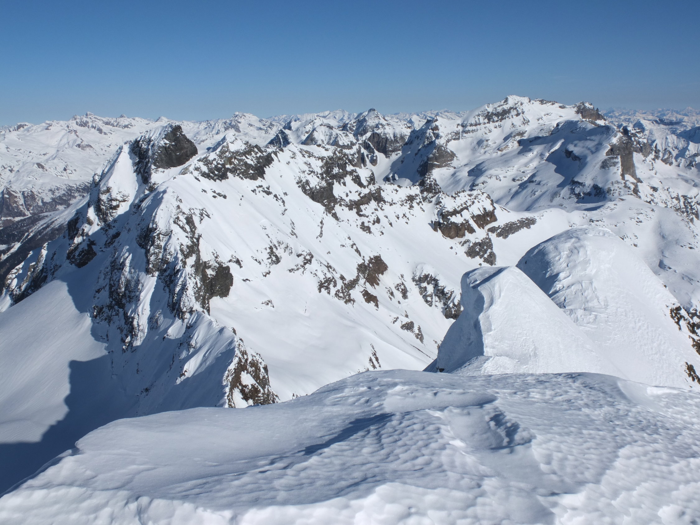 Pulver gibt's auf dieser Tour kaum noch, der Schnee ist sehr hart, aber gut zu fahren. Der Gipfelgrat ist mit Pickel und Steigeisen gut zu gehen, aber sehr ausgesetzt.