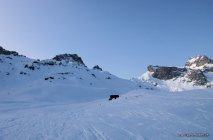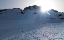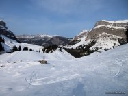 Abfahrt: Rasch wechselnd - mal kurz pulverig, dann verfahren, tragend und kurz auch Bruchharsch. Fahrbar, jedoch kein grosses Vergnügen. Die Strasse hinunter pistenhaft und hart. Eine kurze schneefreie Stelle.