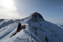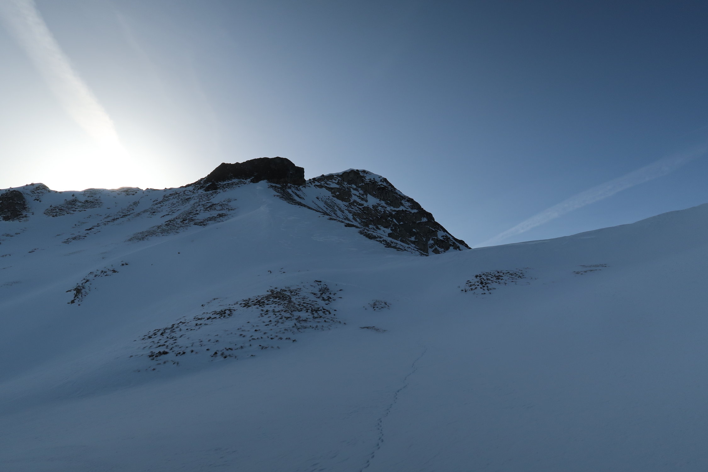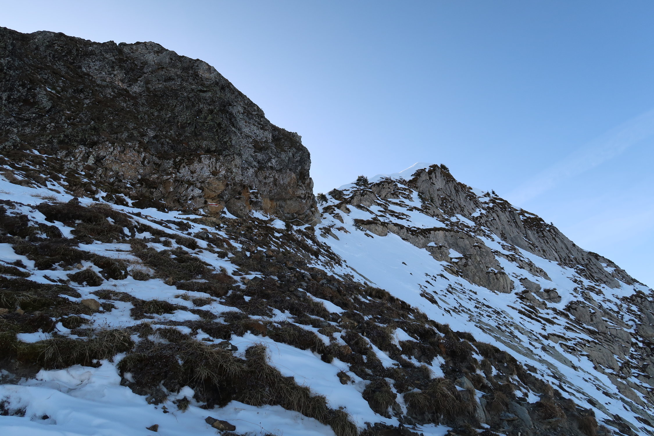 Für den Fussaufstieg zum Gipfel sind aktuell weder Steigeisen noch Pickel notwendig. In der Querung ist der Schnee zwar teilweise recht hart, hier hat es jedoch ein Fixtau. Sonst guter Trittschnee. Auf dem Schlussgrat zum Gipfel sind einige versteckte Löcher, können jedoch umgangen werden.