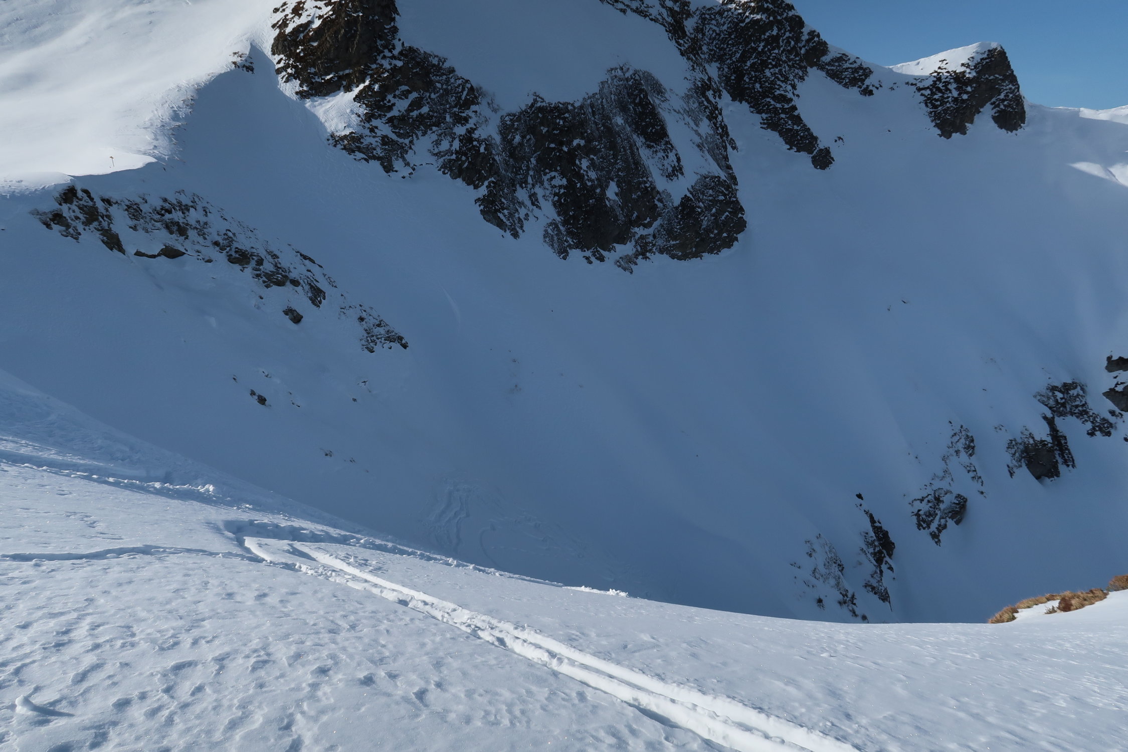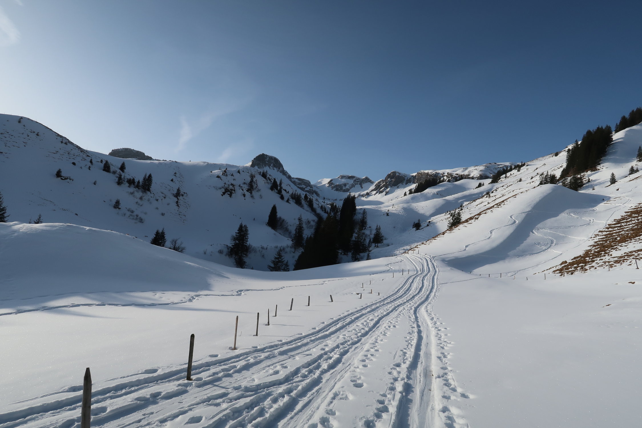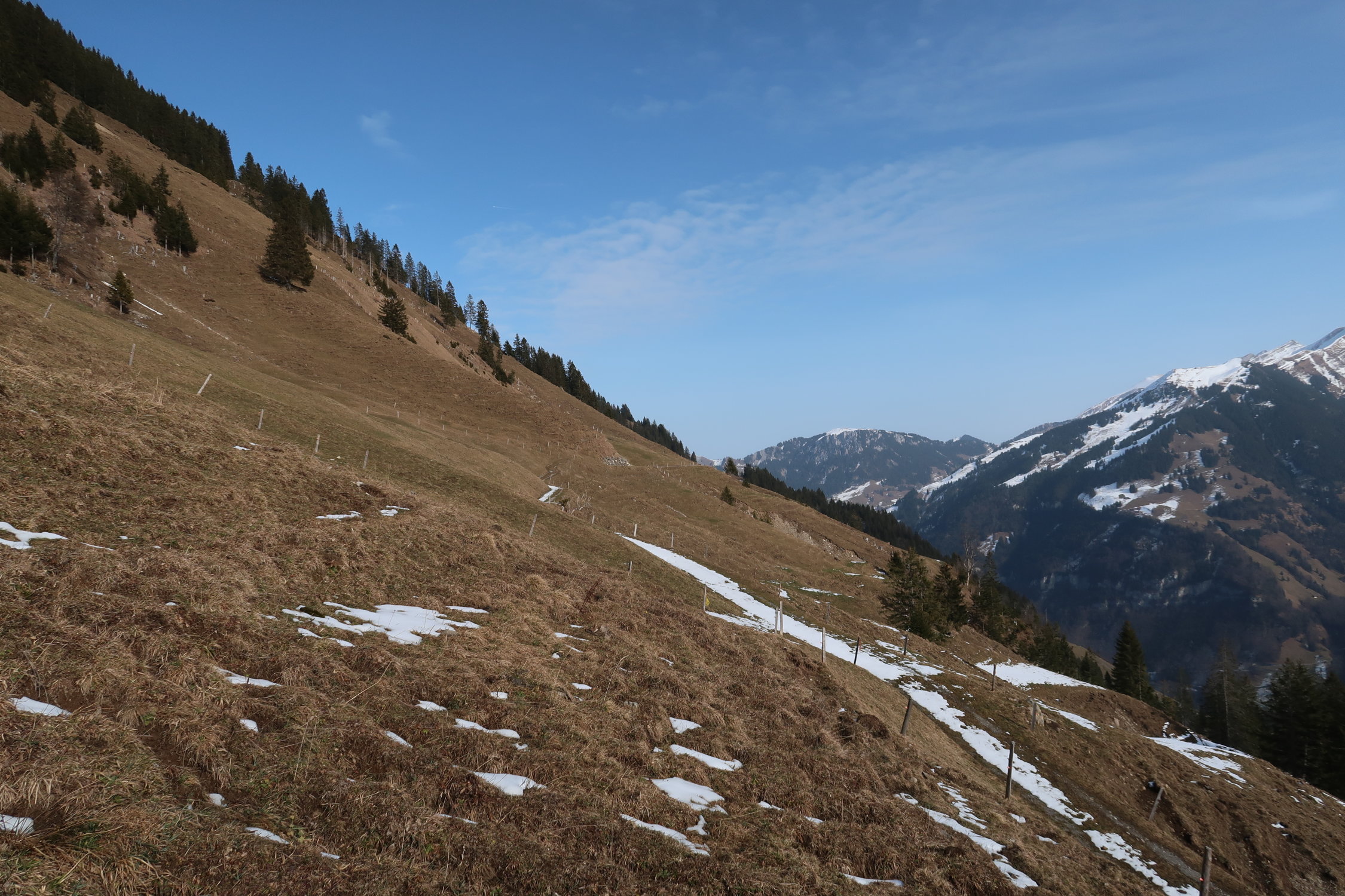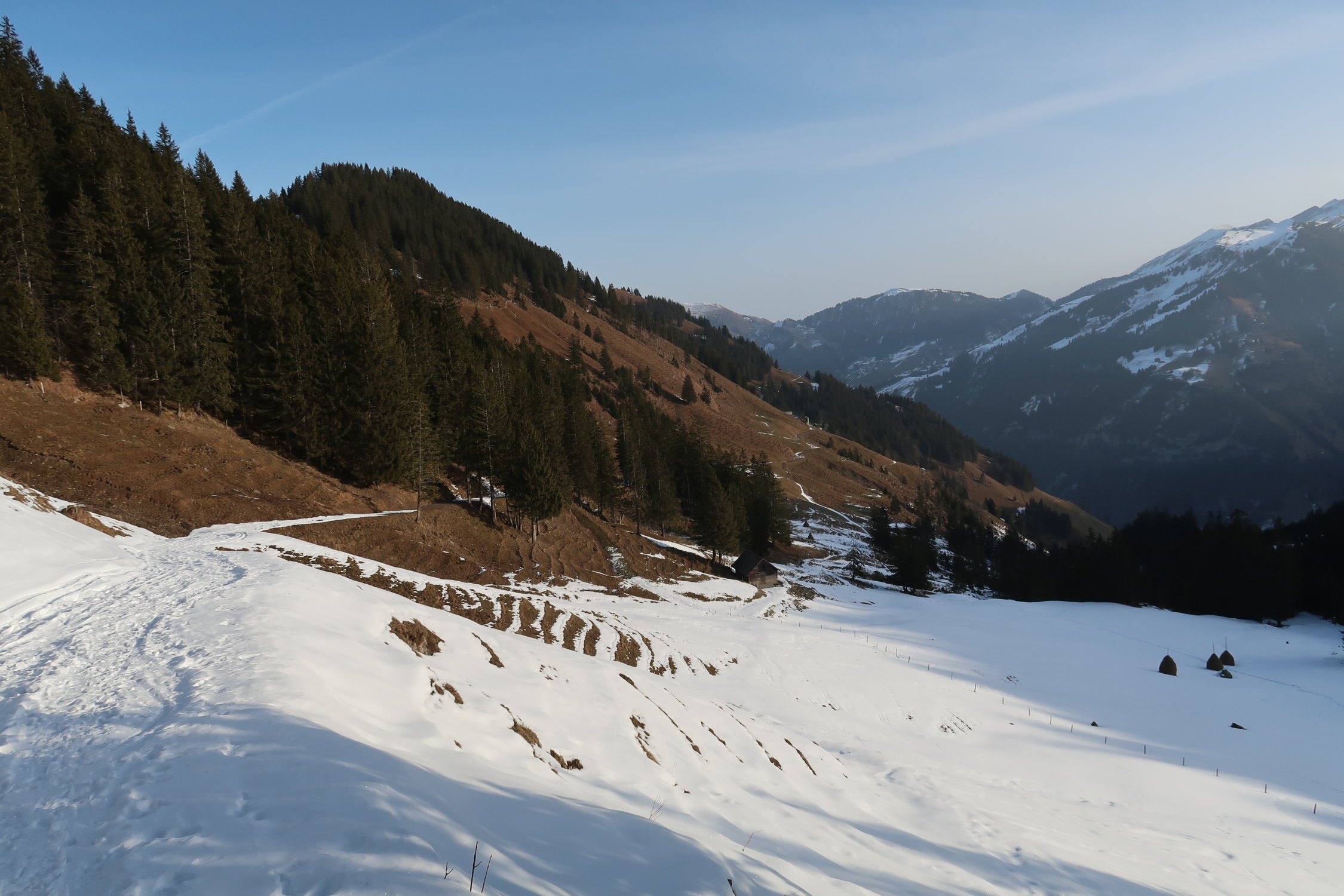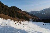 Insgesamt liegt aber in der Region doch noch ziemlich wenig Schnee. Teils ist unter dem Pulver auch kaum eine Unterlage. Bodenkontakte können nicht immer vermieden werden, das Gelände ist aber meist grasig. Ältere Ski sind aber dennoch nicht verkehrt.