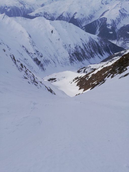 Guter Schnee im Talgrund sowie oben im Couloir. Im Mittelteil teils sehr hart windgepresst. Absolut gute Lawinensituation, kein Triebschnee (oder uralt).