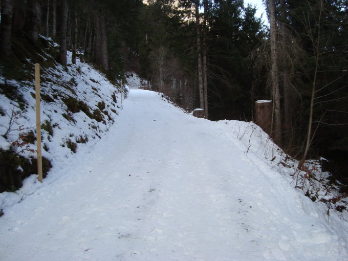 Die ersten 200 Laufmeter der Waldstrasse sind noch recht dünn mit Schnee gedeckt, dementsprechend sind da einige Fellkiller gegenwärtig. Danach aber zunehmend besser.