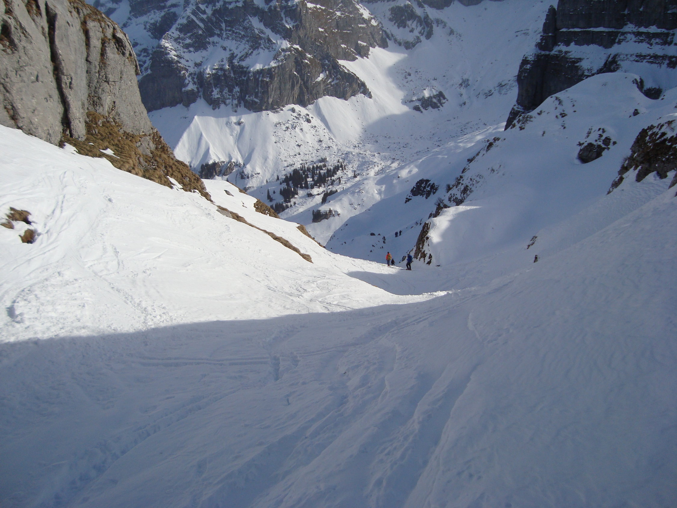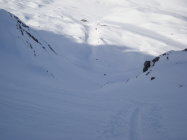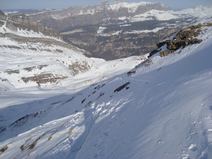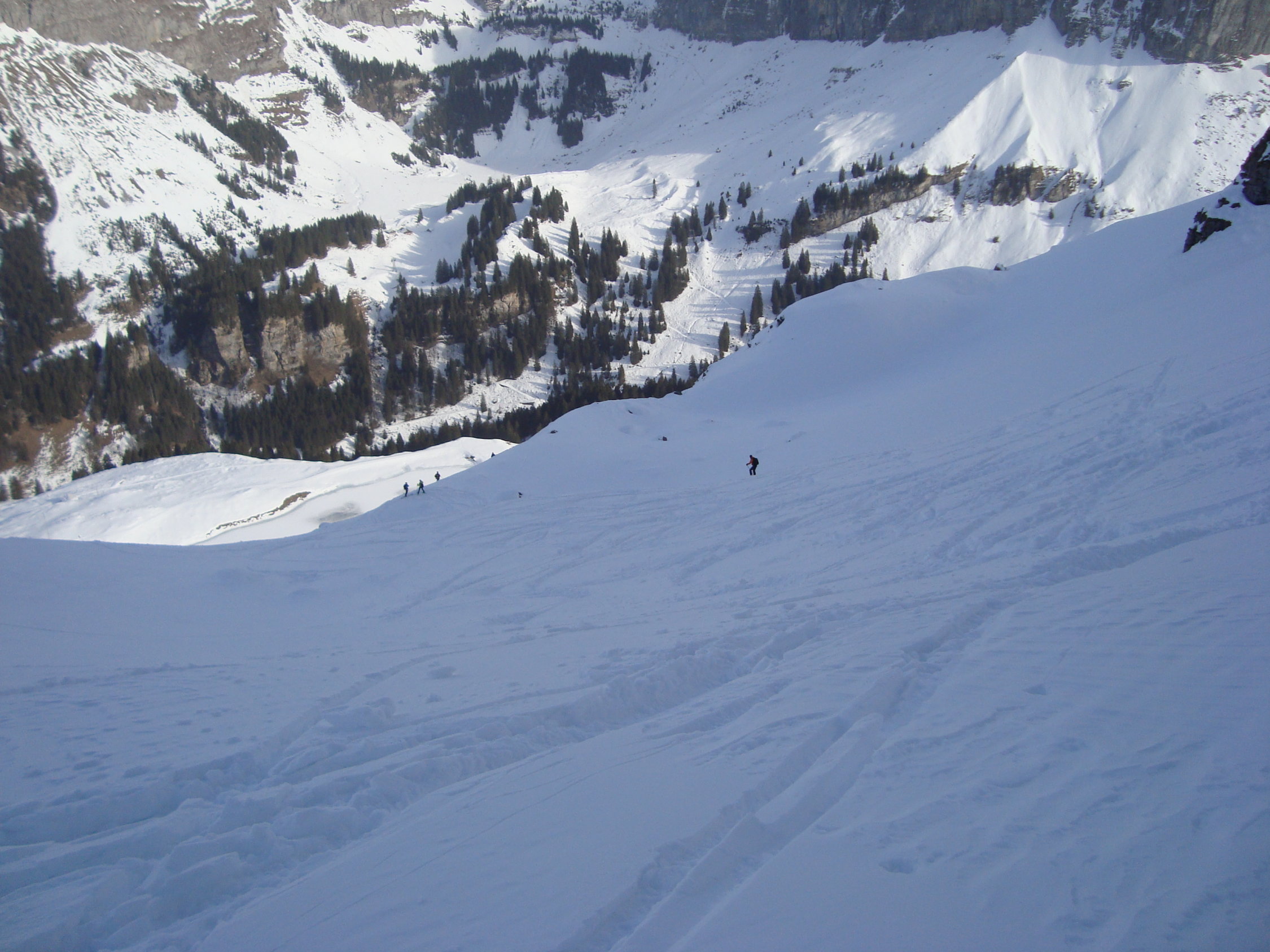 Wie die Luzerner, wählte ich die steile SO-Abfahrt am Alpler Stock vorbei und Waldi/Hinterste Hütte nach Vorläubli/Eggen. Die Rinnen und Hänge dieser Abfahrtvariante waren grösstenteils mit Pulver bestückt, ab und an in den Sonnensektoren leicht gedeckelt. Alles war sehr gut zu fahren, eine wahre Freude.