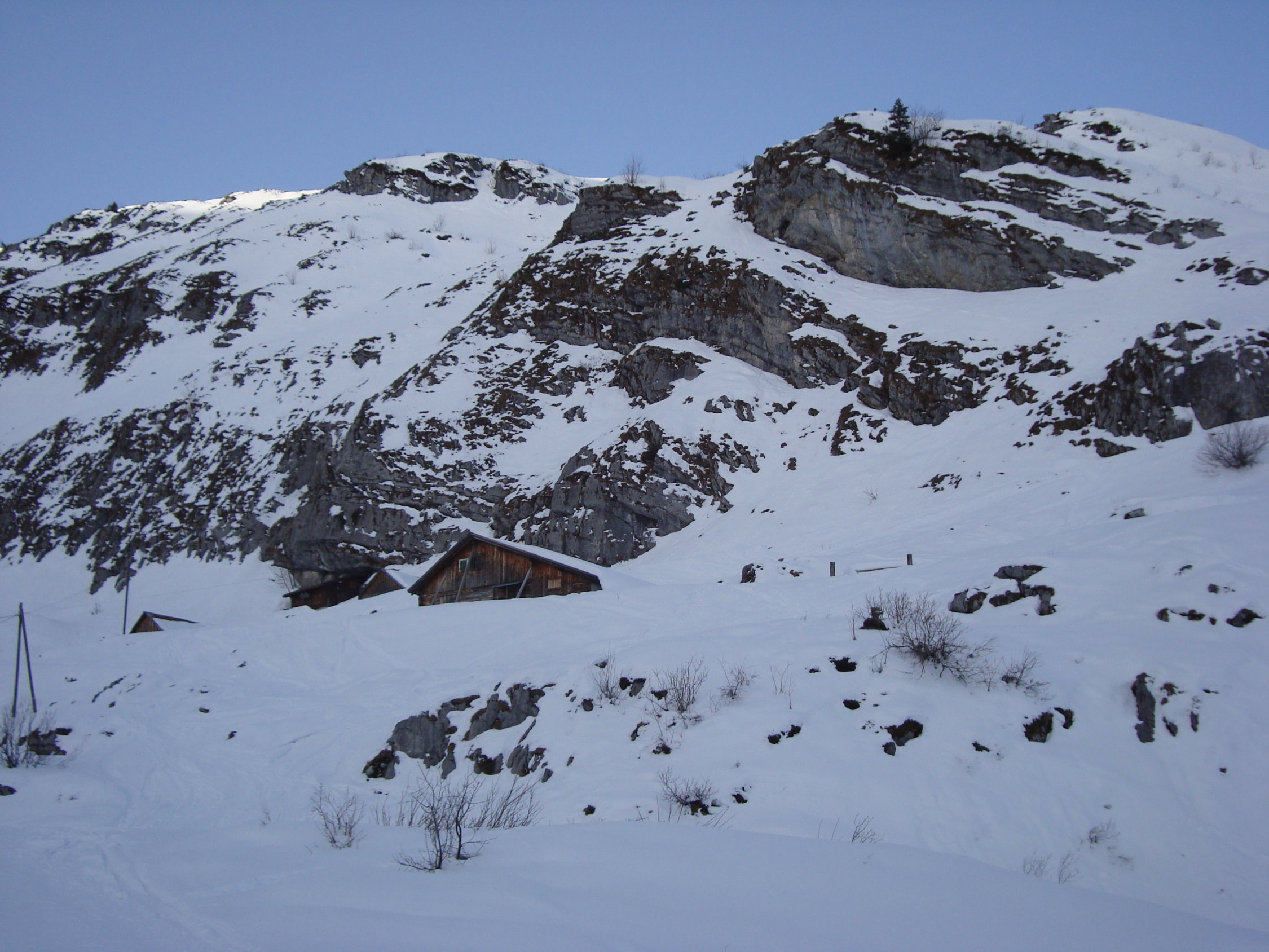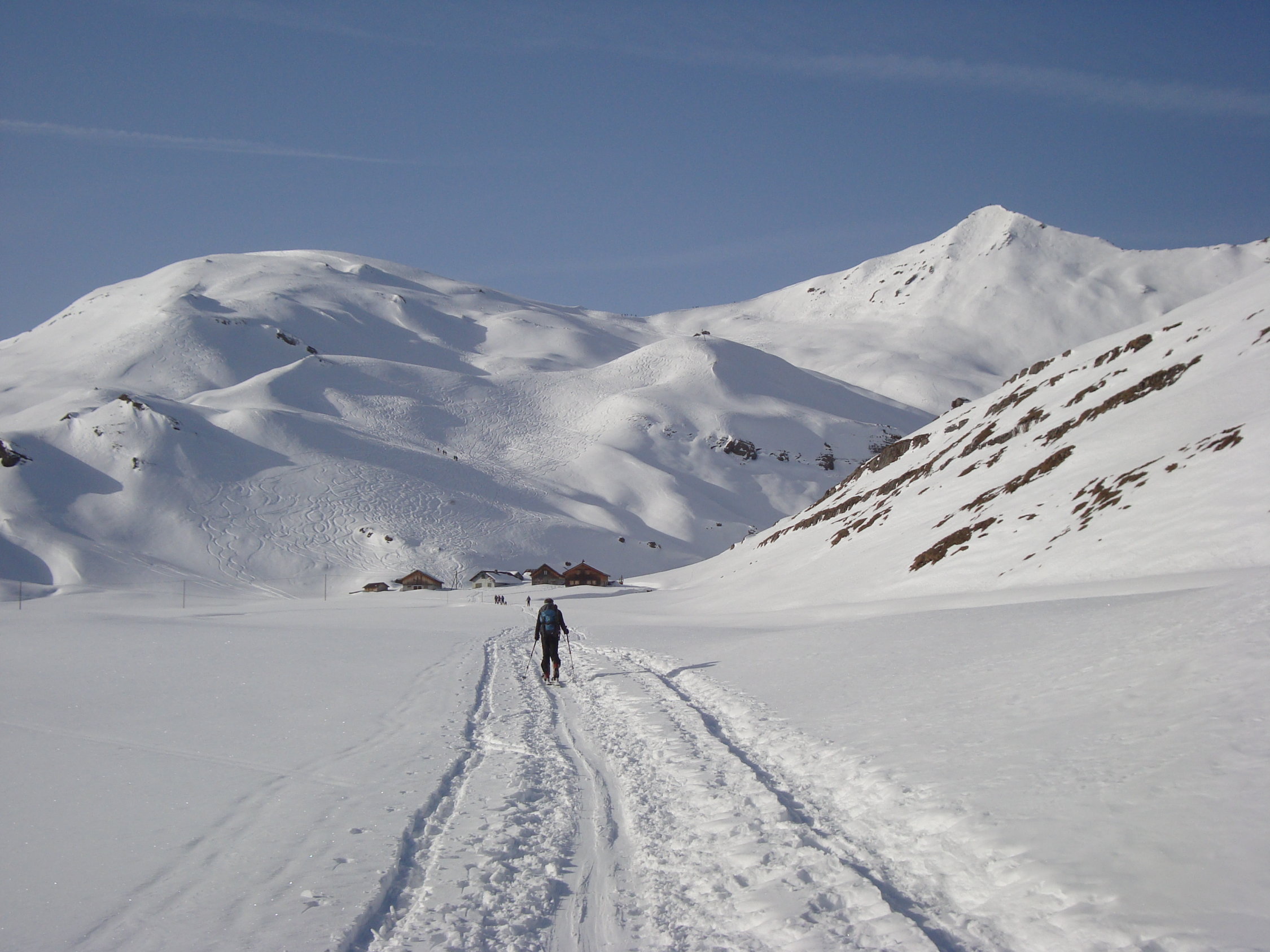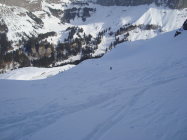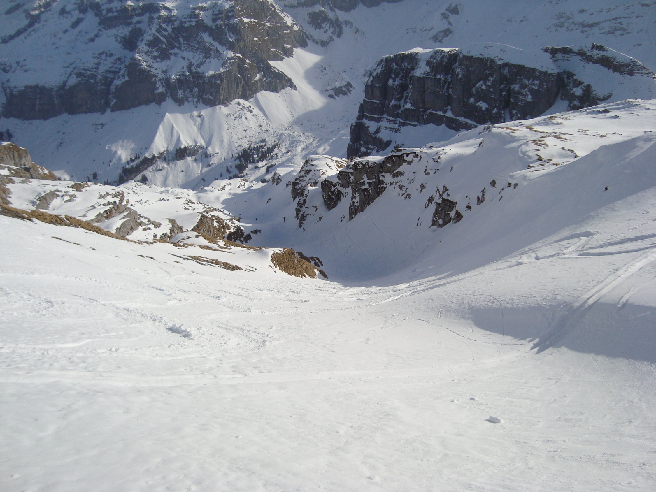 Wie die Luzerner, wählte ich die steile SO-Abfahrt am Alpler Stock vorbei und Waldi/Hinterste Hütte nach Vorläubli/Eggen. Die Rinnen und Hänge dieser Abfahrtvariante waren grösstenteils mit Pulver bestückt, ab und an in den Sonnensektoren leicht gedeckelt. Alles war sehr gut zu fahren, eine wahre Freude.