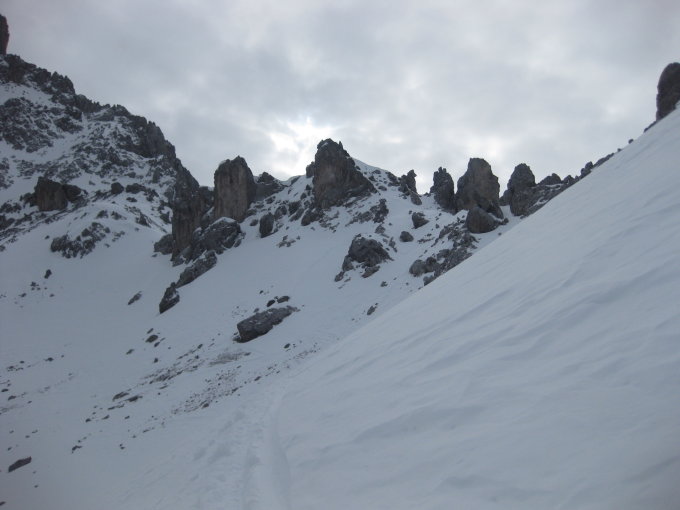 Abfahrt ohne Neuschnee wohl anspruchsvoller. Dafür bleiben Aufstiegsspuren gut.