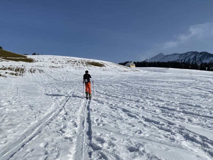 Sind von oberhalb Ruob, unterhalb Tschellisboden gestartet (PP in Kurve). Wenig Schnee aber ok.