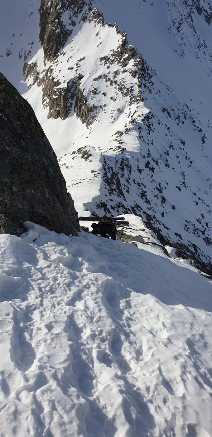 Pulver traffen wir nur noch in windgeschützten Mulden an. Ansonsten windgepressert Bruchharsch, teils tragend oder verdrängbar in der Abfahrt. Für geschlossene Skiführung reichte es mir nicht. Daher breitbeinig, dafür ohne Sturz;-). Schlussquerung rüber zur Dammkrone hart aber tiptop fahrbar. Weitere Abfahrt auf der Strasse bis Gwüscht tiptop. Ab Gwüscht lieber die alte Strasse/weg nehmen. Lohnt sich, da Fahrstrasse mit Kies bearbeitet ist. Wer Pulverschnee sucht, muss diese Tour jetzt nicht machen! Lohnende lange Tour mit viel Sonne im Aufstieg. Ab Winterlücke ohne Steigeisen und Pickeleinsatz zum Gipfel hoch. Harscheisen am Schlusshang zur Winterlücke hilfreich aber nicht zwindend um die Mittagszeit.
