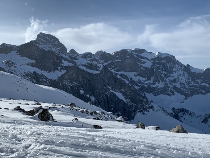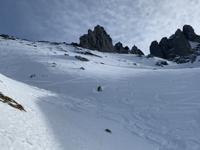 Abgefahren sind wir in einem der steileren und etwas mehr eingeschneiten Couloirs Richtung Hasenstock. Dort hat’s genug Schnee, aber hauptsächlich schwerer ungebundener Pulver auf harter Unterfläche.