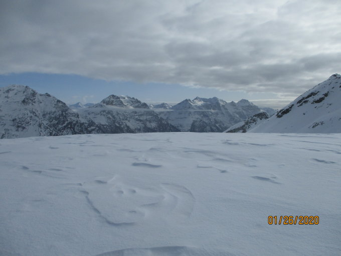 Sehr ruhig war´s heute im Gebiet. Nur wenige Tourengeher waren entfernt im Gebiet der Alp de Confin auszumachen, auf dem Berg selbst trafen wir im Abstieg auf dem Grat noch einen zum Gipfel steigenden Schneeschuhtourengeher.