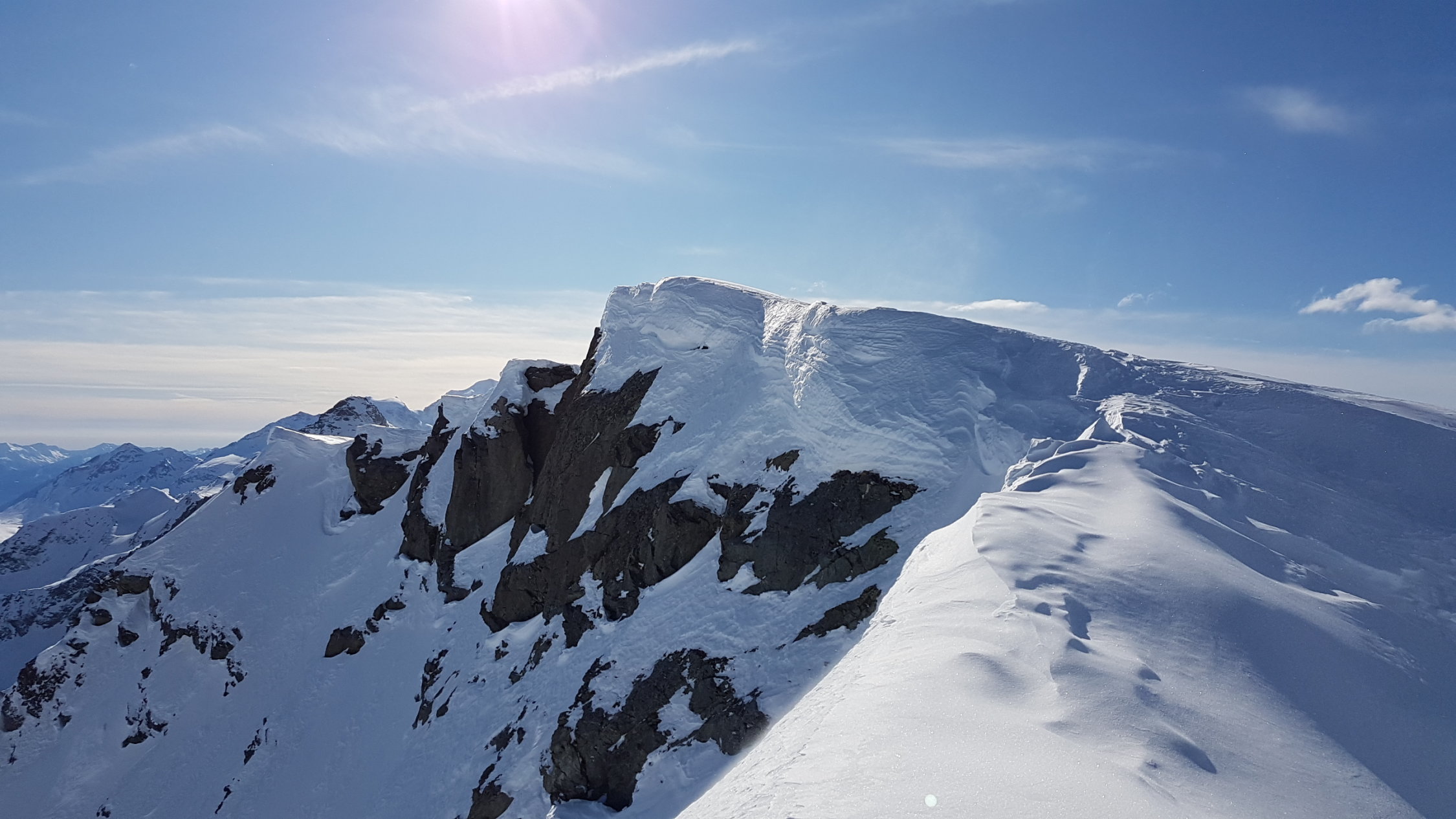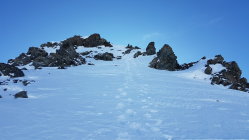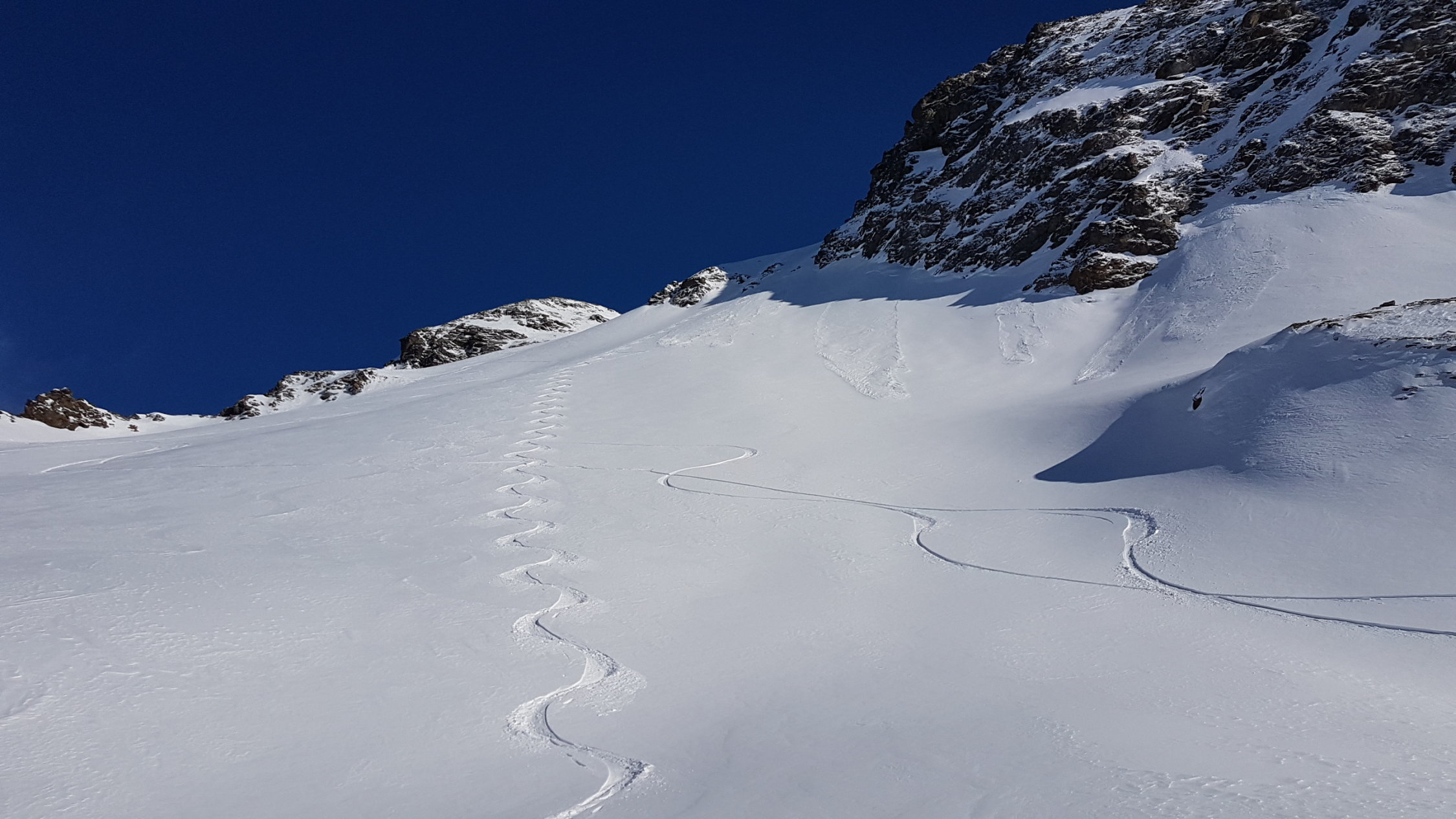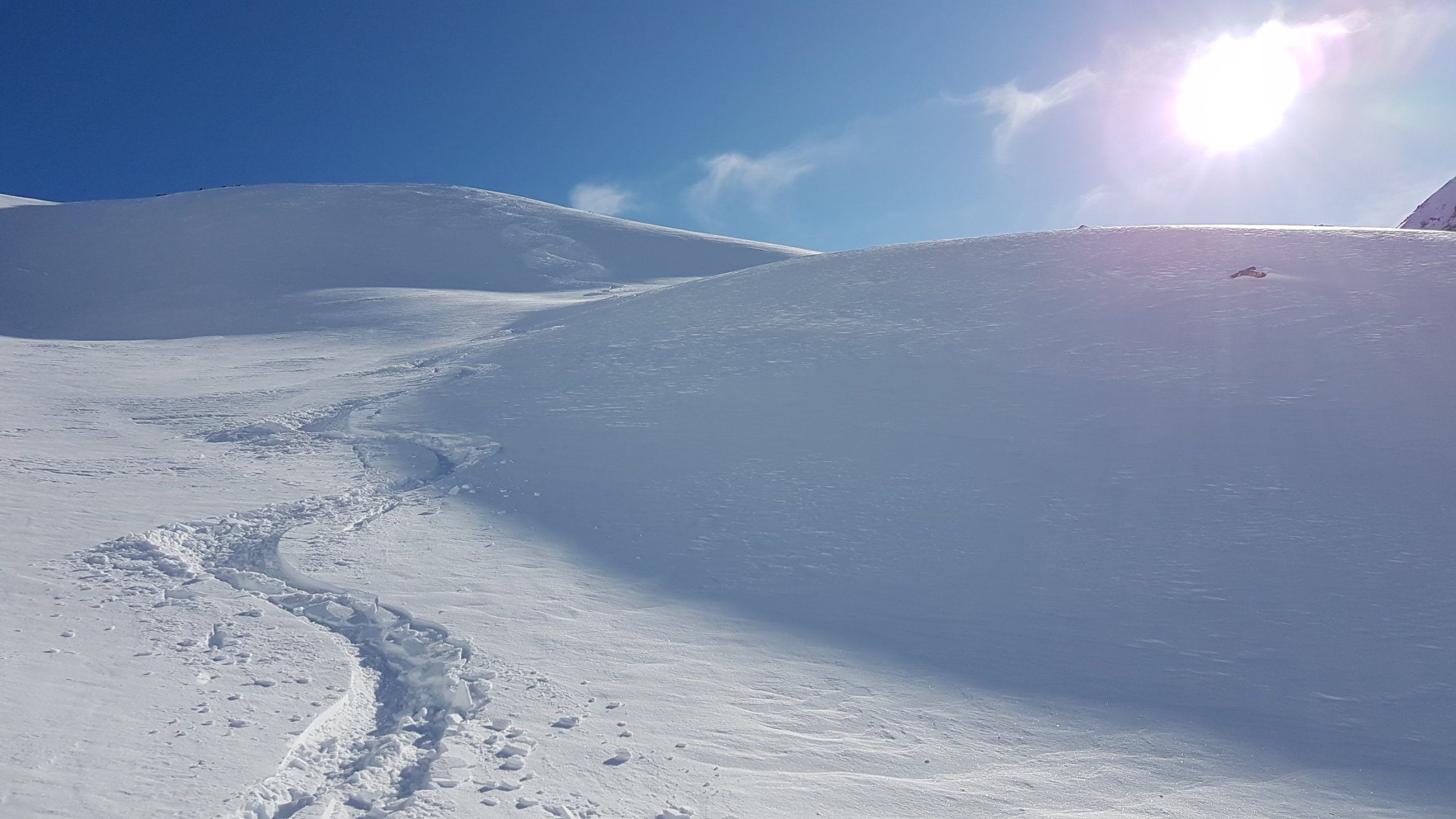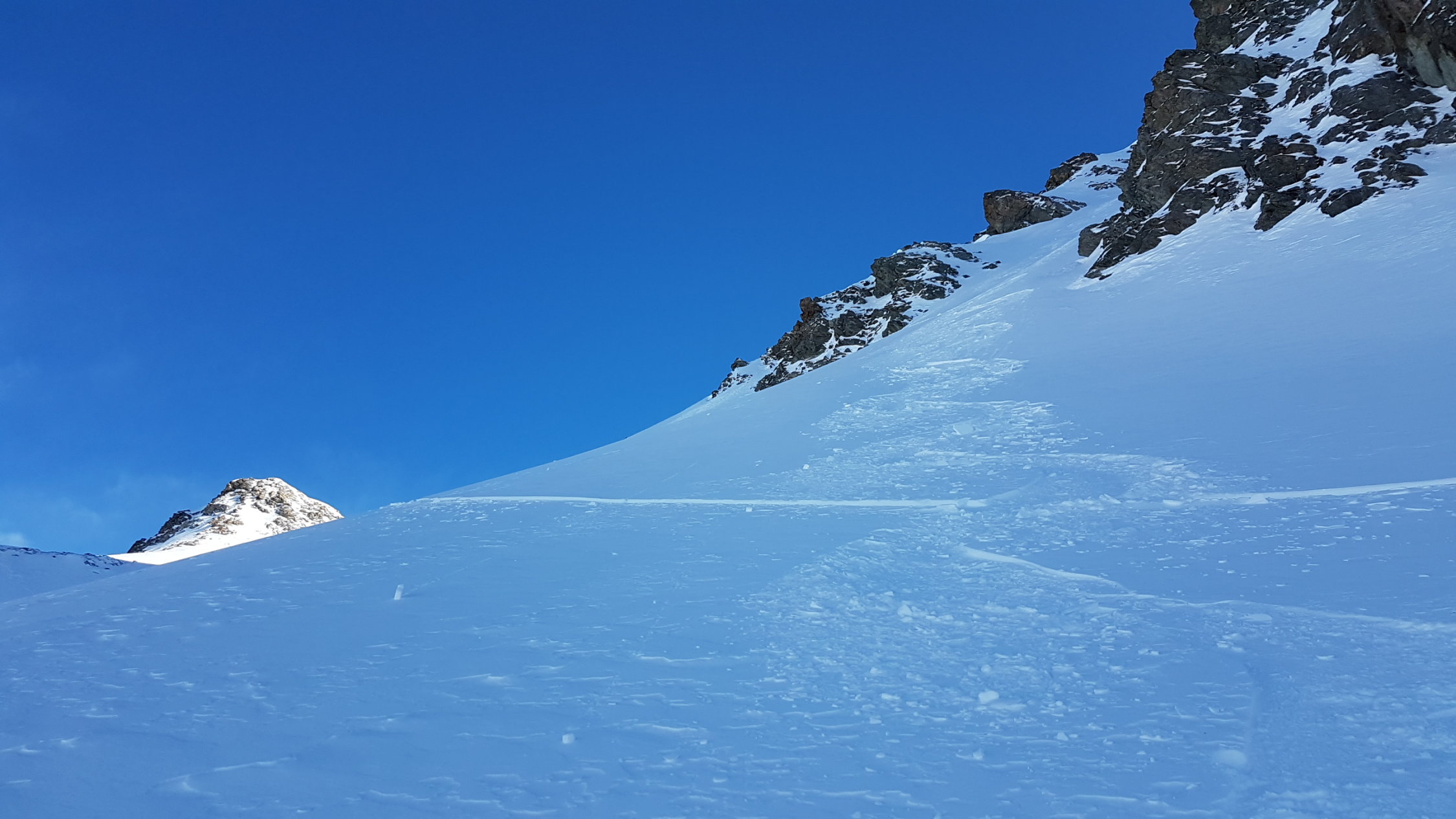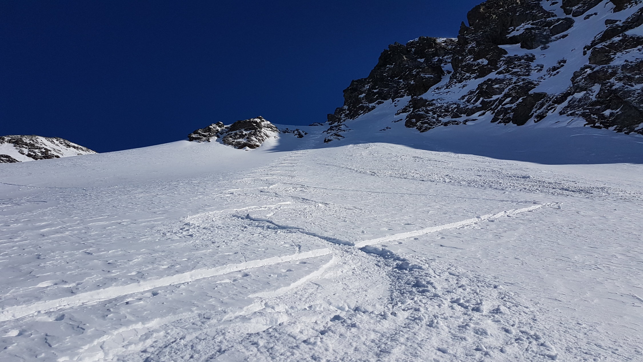 Das Couloir vom Gipfel runter ist zu steinig, deshalb nicht mit den Skis bis auf den Gipfel. Habe zuerst unter das Couloir gequert, dann von dort runter gefahren, weiter unten zwischen zwei Felsköpfen hindurch. Im oberen Teil gut fahrbar, unter den Felsköpfen Pulver. Je weiter man nach Margun kam, um so mehr machte sich die harte, unruhige Unterlage bemerkbar. Dies wurde noch stärker, je weiter man nach unten kam.