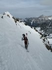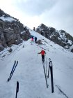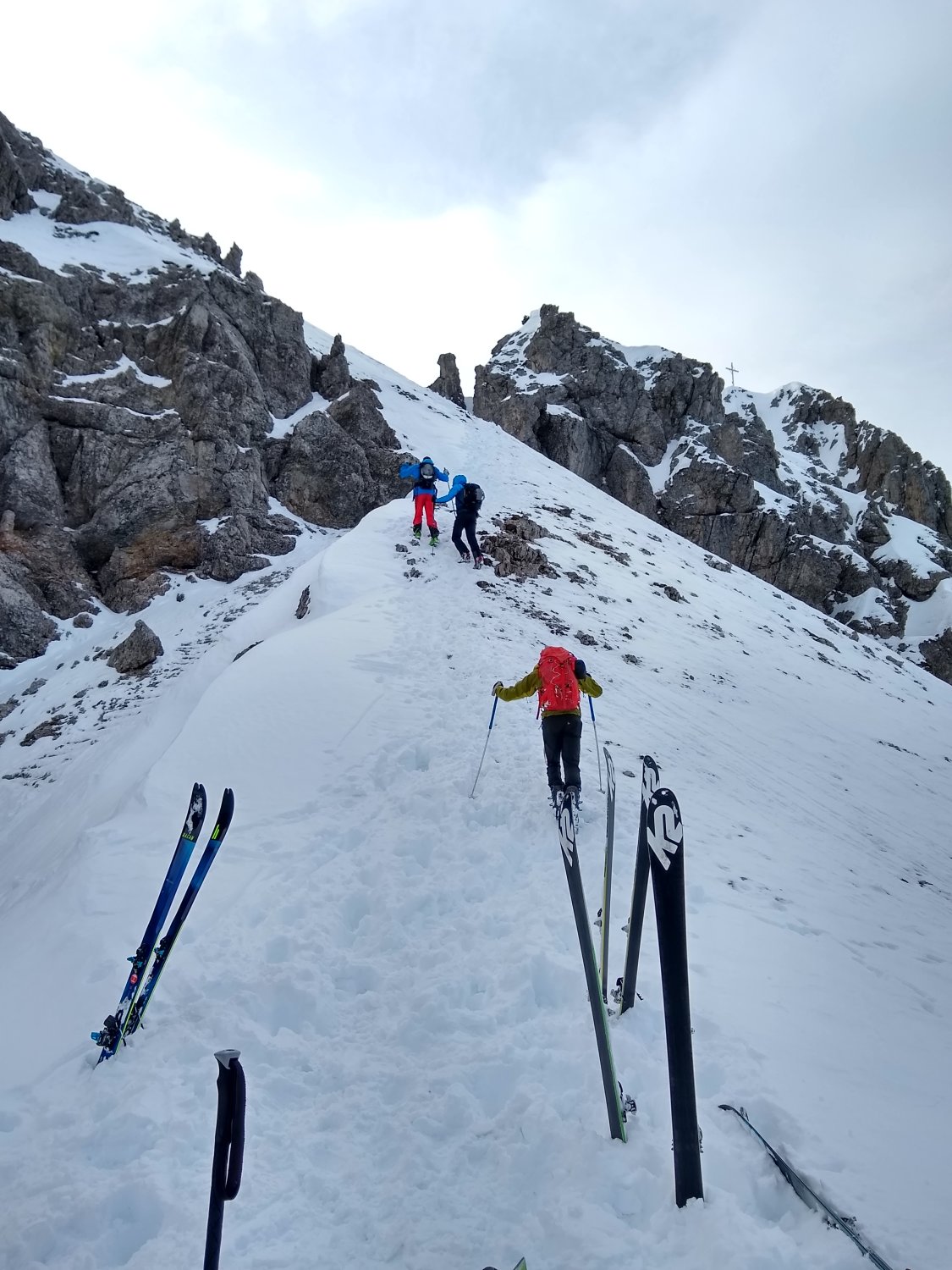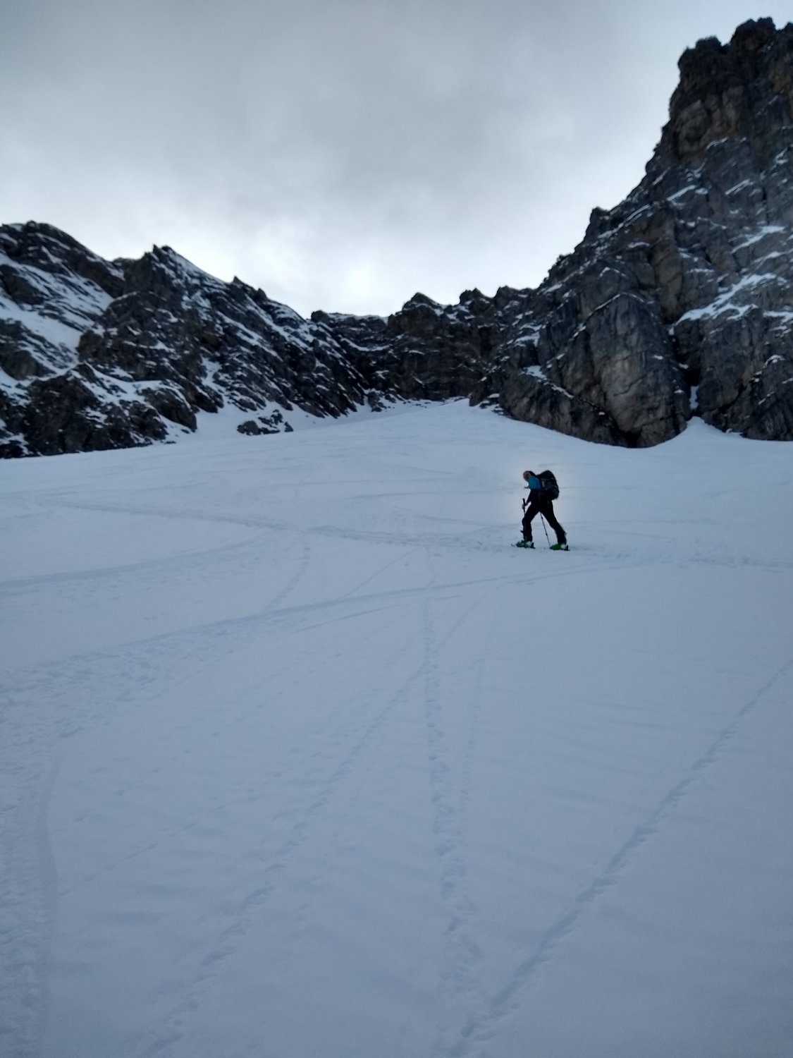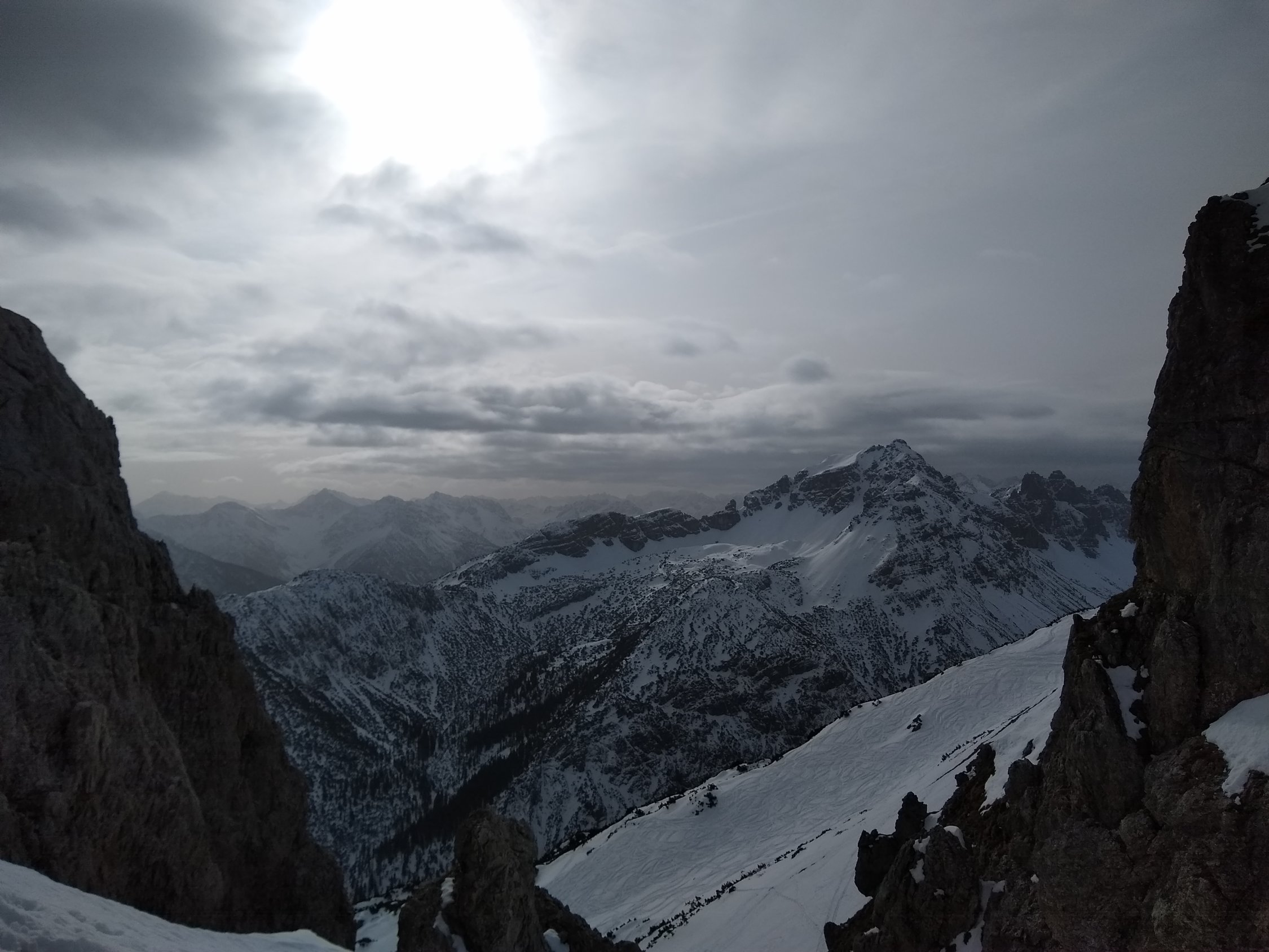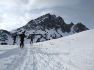 Der Nordhang im oberen, engen Bereich kommplet eingefahren, weiter unten findet man noch freie Möglichkeiten in shon etwas schwererem Neuschnee (Frühjahrspulver)...sind noch einmal in ein kleine Scharte aufgestiegen, dort noch wenig Spuren. aufstieg zur Krinnenspitze verharscht und wenig Schnee. Abfahrt von der Krinne zuerst in westl. Richtung, dann über die Nordhänge zum Skigebiet. Noch viele Latschen und auch schon recht zerfahren, aber man findet seine Wege und der Schnee ist auch noch gut. Keinen Steinkontakt