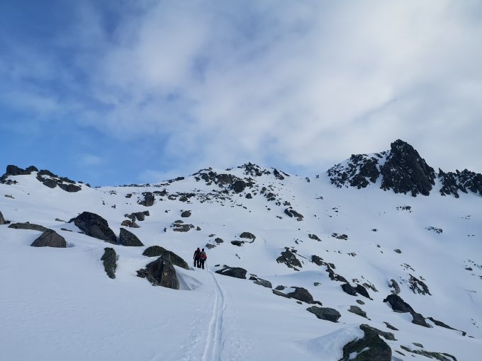 Aufstieg von Etzlihütte Dank früher gestarteter Gruppe angenehm. Diese Gruppe musste jedoch einen unangenehm dicken Harschdeckel aufbrechen. Danke für's Spuren!