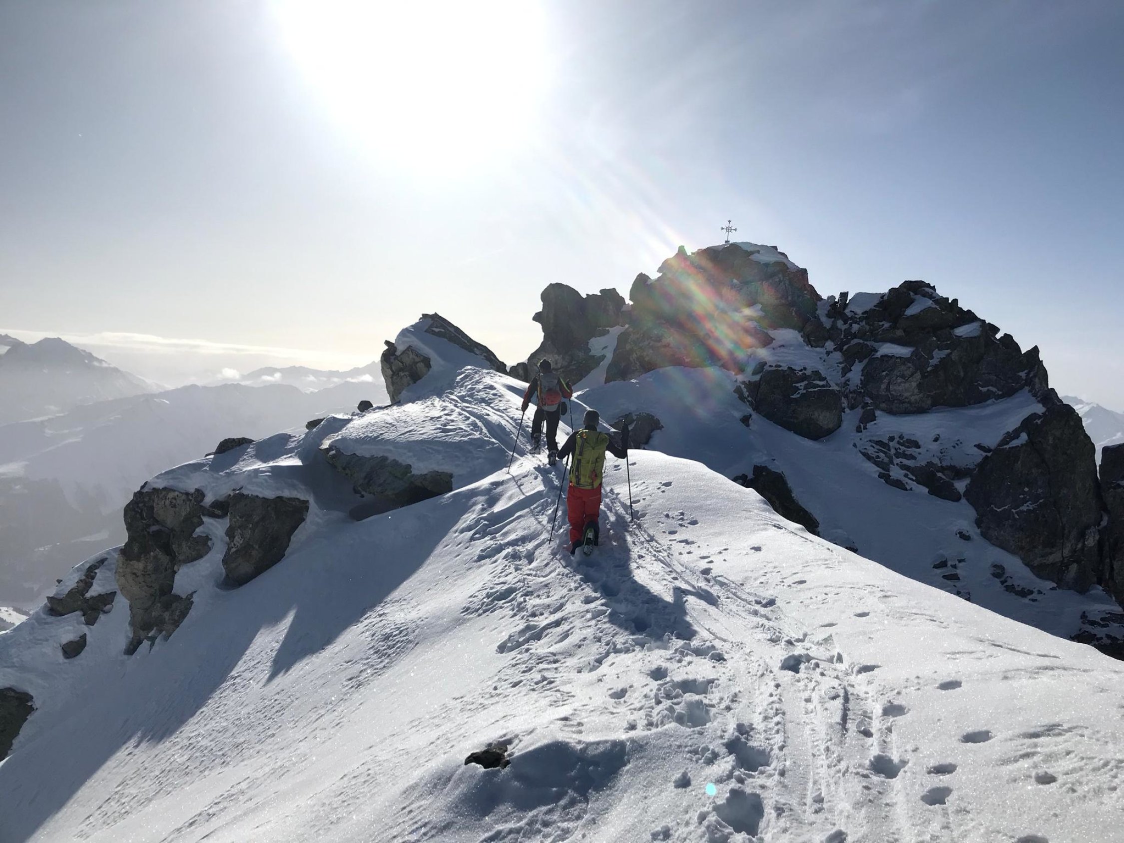 Traverse und Aufstieg zum Chrüzlistock in gutem Schnee und guten Bedingungen. Vom Skidepot in gutem Schnee bis zum Felsaufbau und mithilfe der freien Kette einfach zum Gipfel.