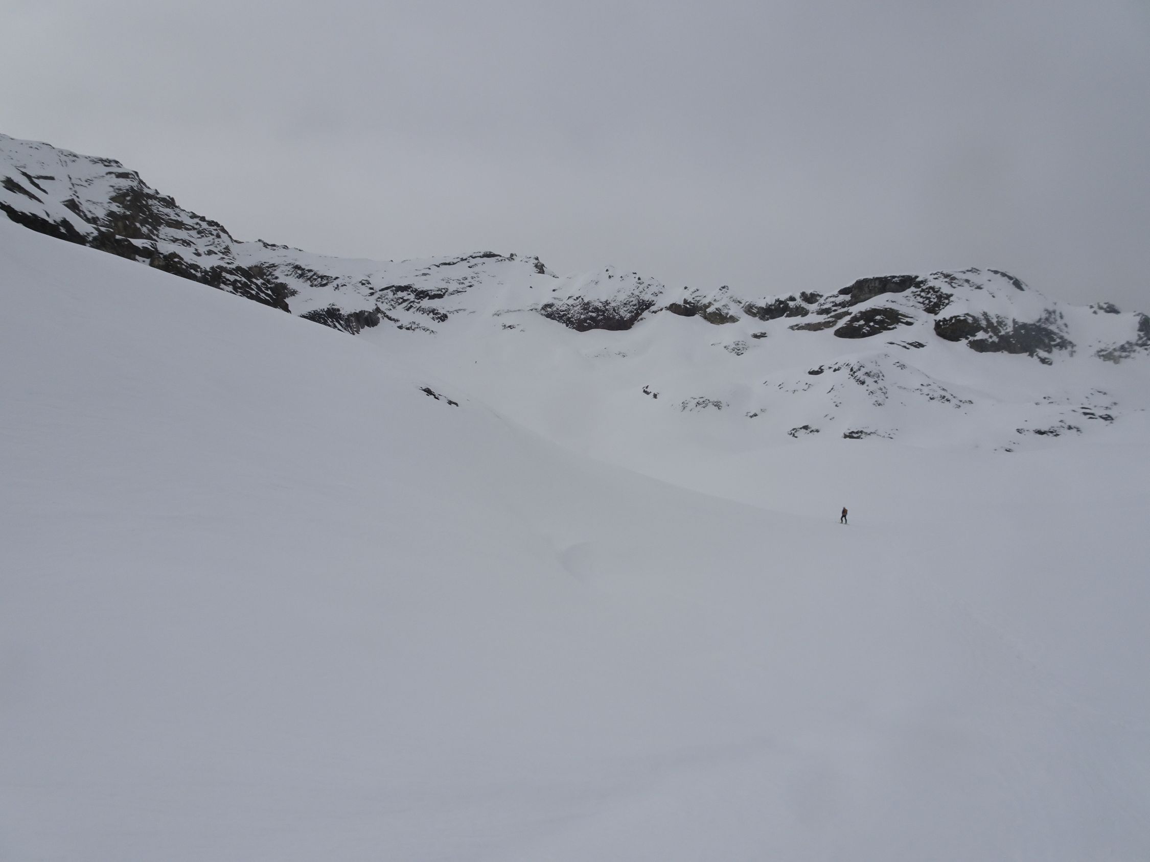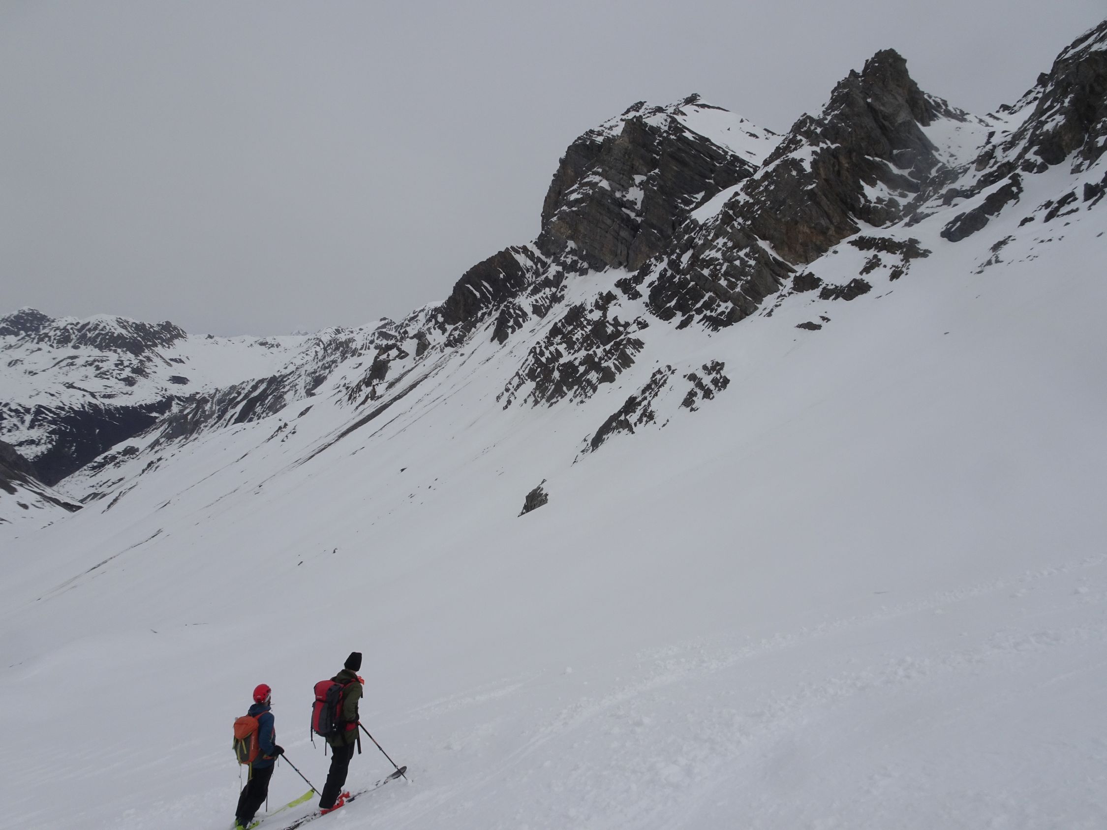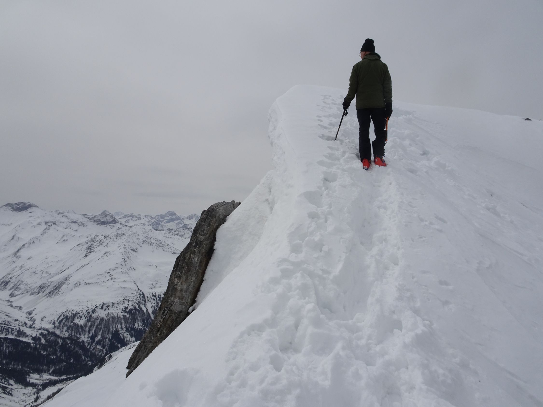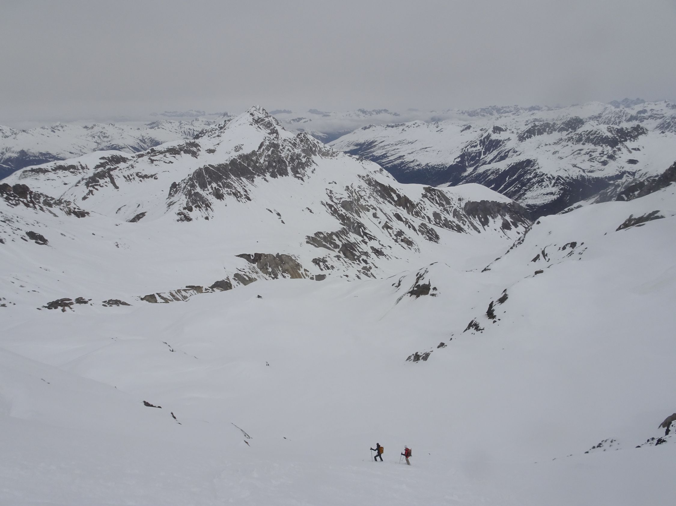 Im Ducan-Tal bis und mit Gletscher sind die Bedingungen sehr gut. Wir haben Glück gehabt, dass zwei andere Tourengänger schneller waren und sich somit der mühseligen Spurarbeit am Schlusshang angenommen haben. An 3-4 Stellen müssen kleinere Felsbänder überwindet werden. Blöderweise liegen immer dort die Gries-Schnee-Nester, die den Aufstieg sehr beschwerlich machen. Die Schlusstraverse auf den Gipfel ist aktuell wegen Wechte auf der einen Seite und Gries-Schnee auf der anderen Seite nicht zu empfehlen.