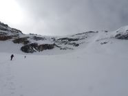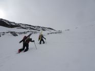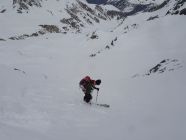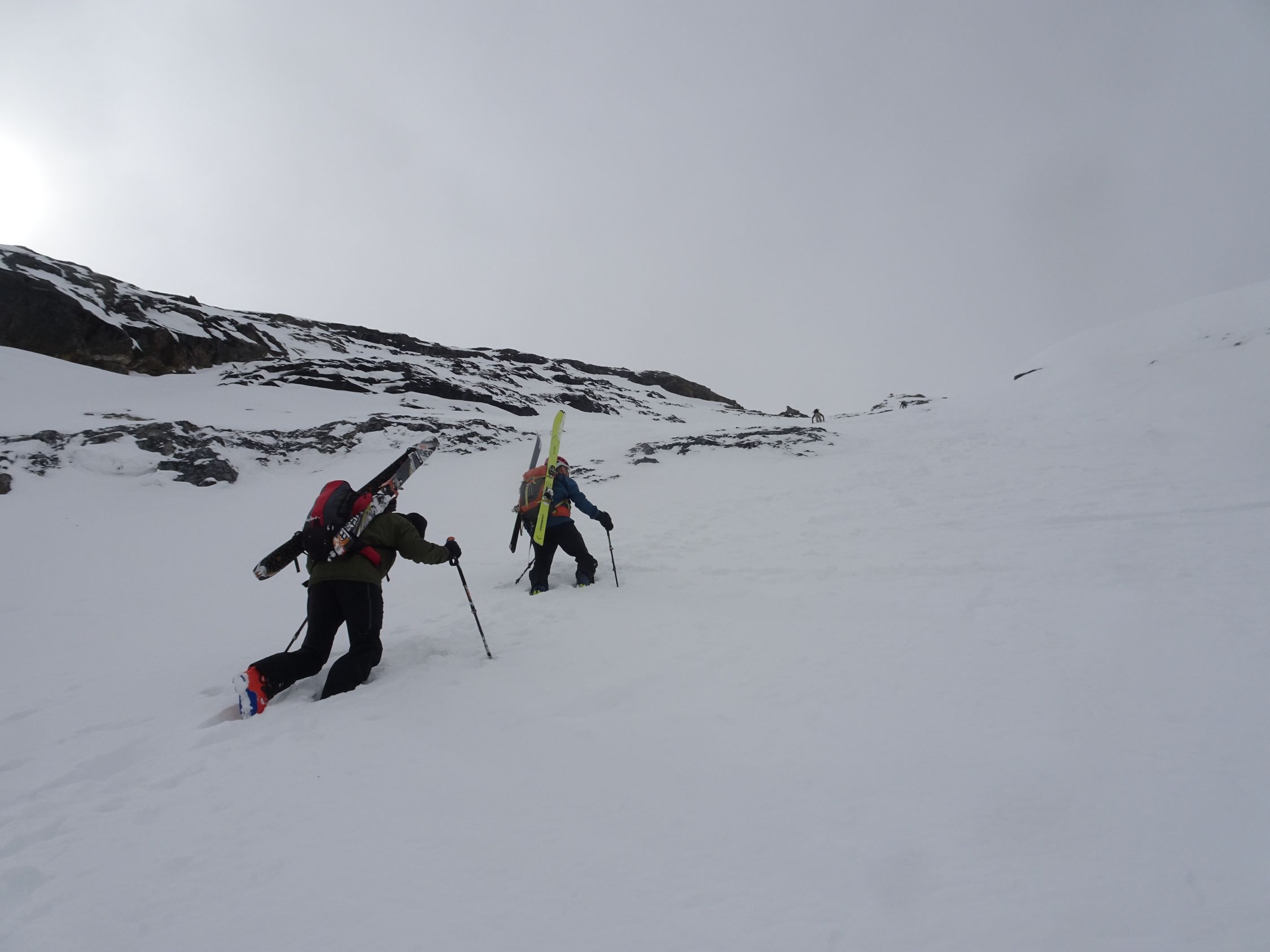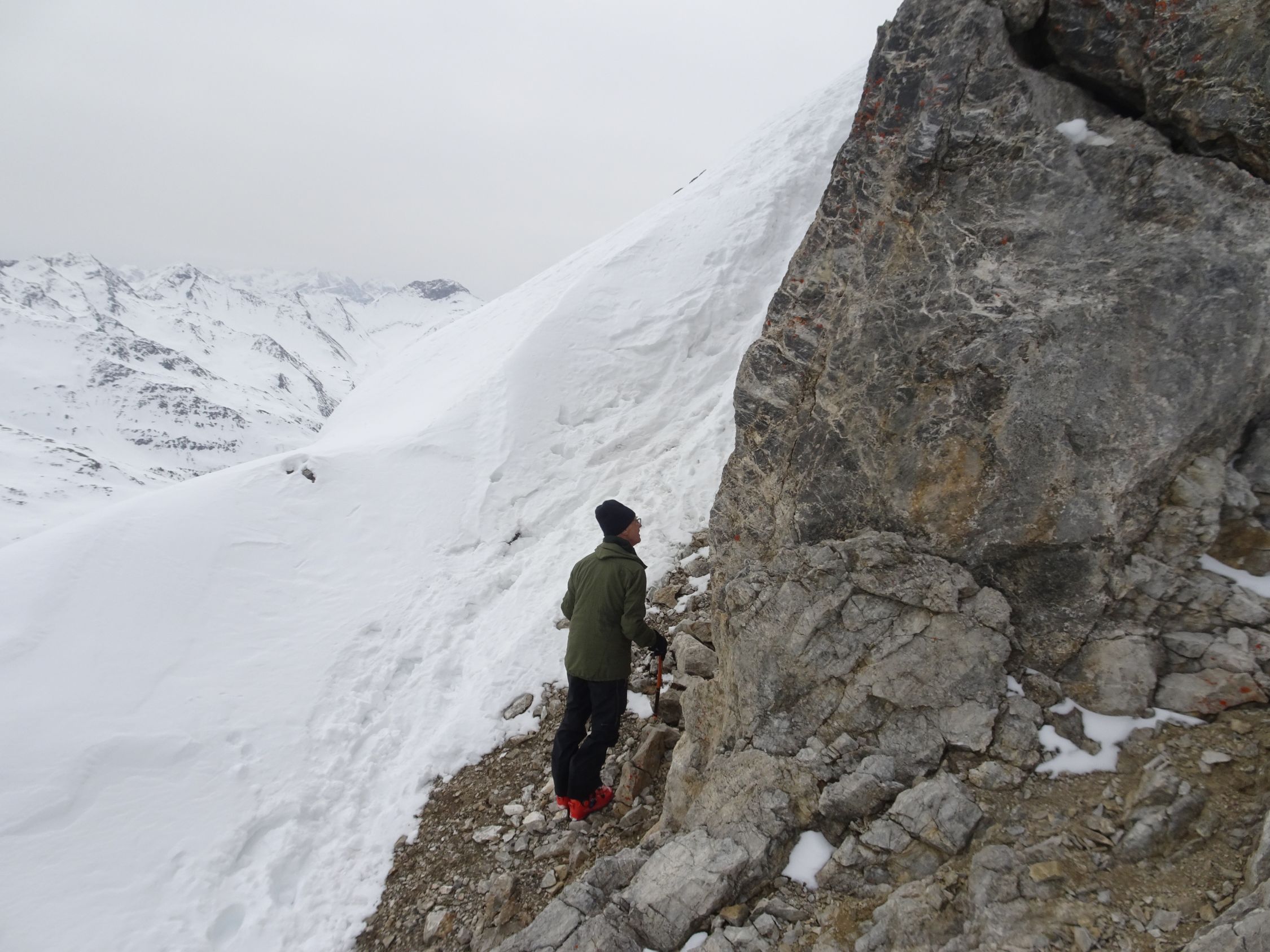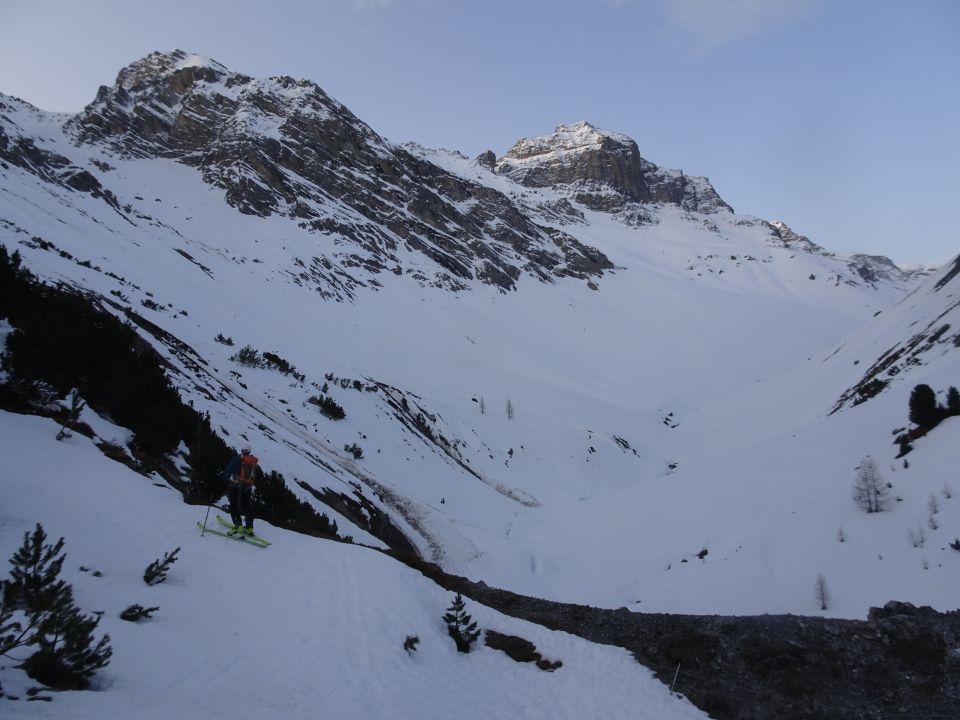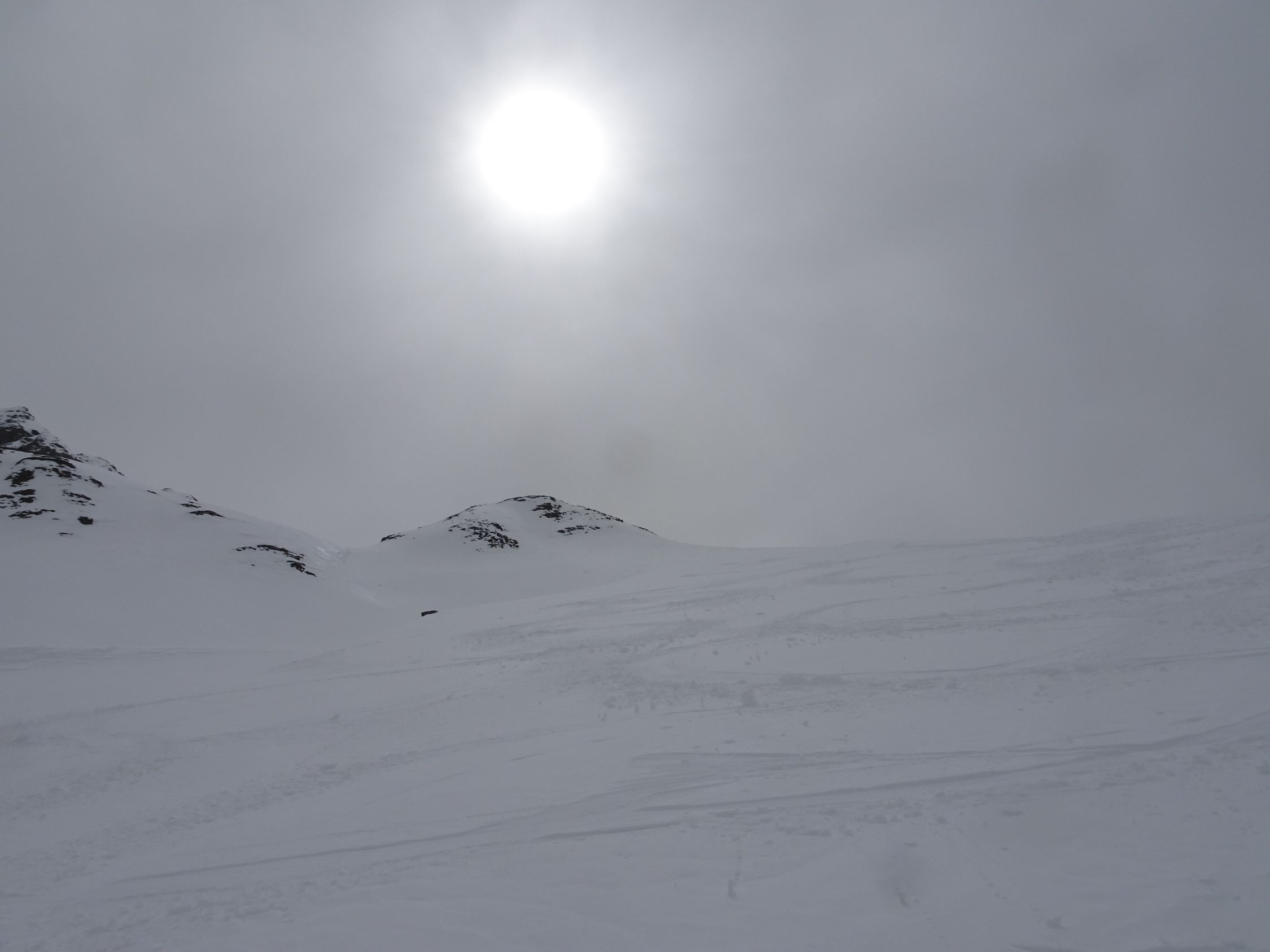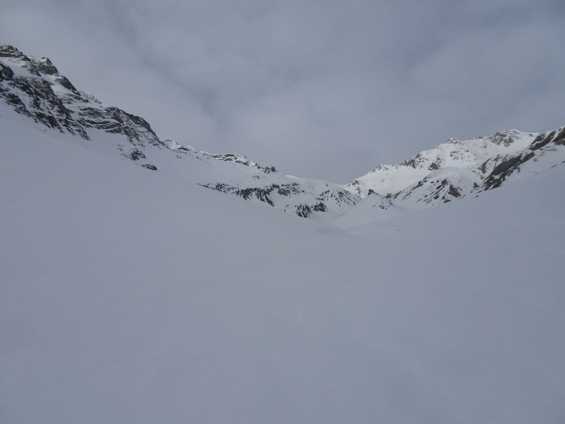 Im Ducan-Tal bis und mit Gletscher sind die Bedingungen sehr gut. Wir haben Glück gehabt, dass zwei andere Tourengänger schneller waren und sich somit der mühseligen Spurarbeit am Schlusshang angenommen haben. An 3-4 Stellen müssen kleinere Felsbänder überwindet werden. Blöderweise liegen immer dort die Gries-Schnee-Nester, die den Aufstieg sehr beschwerlich machen. Die Schlusstraverse auf den Gipfel ist aktuell wegen Wechte auf der einen Seite und Gries-Schnee auf der anderen Seite nicht zu empfehlen.