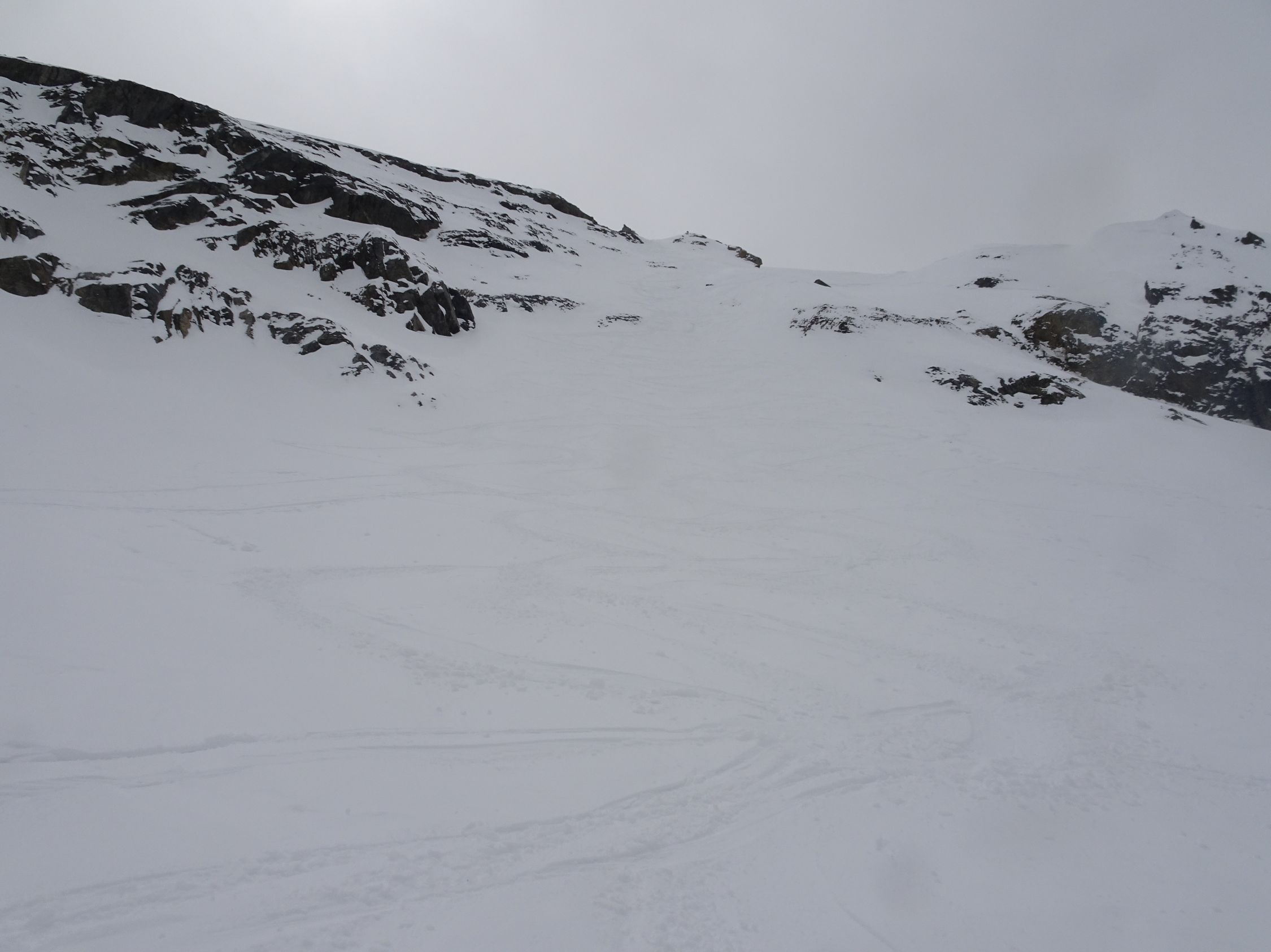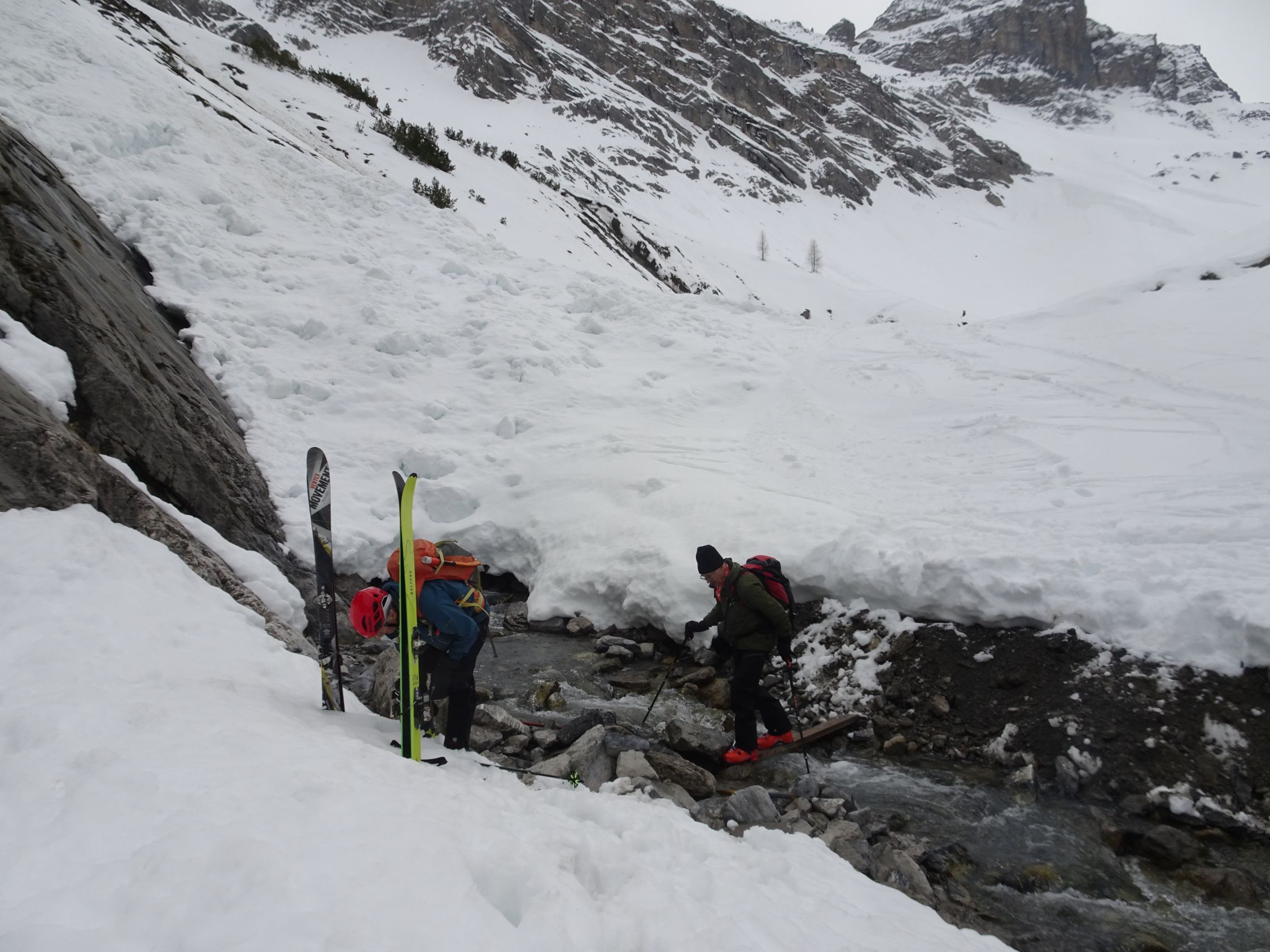 Es hat Schnee ab dem Strässchen unten. Die steilen Hänge bei der Wegtraverse sind grösstenteils entladen (soweit erkennbar). Wir haben das Glück gehabt, dass in den Vortagen schon der ein oder anderer Rutsch auch bei in den Cheeren runtergekommen ist und dass es gestern den ganzen Tag über bedeckt war, so dass kein weiterer Energie-Eintrag in die Hänge stattgefunden hat. Das Queren der Nassschnee-Rutsche verlangt etwas Zeit.
