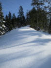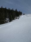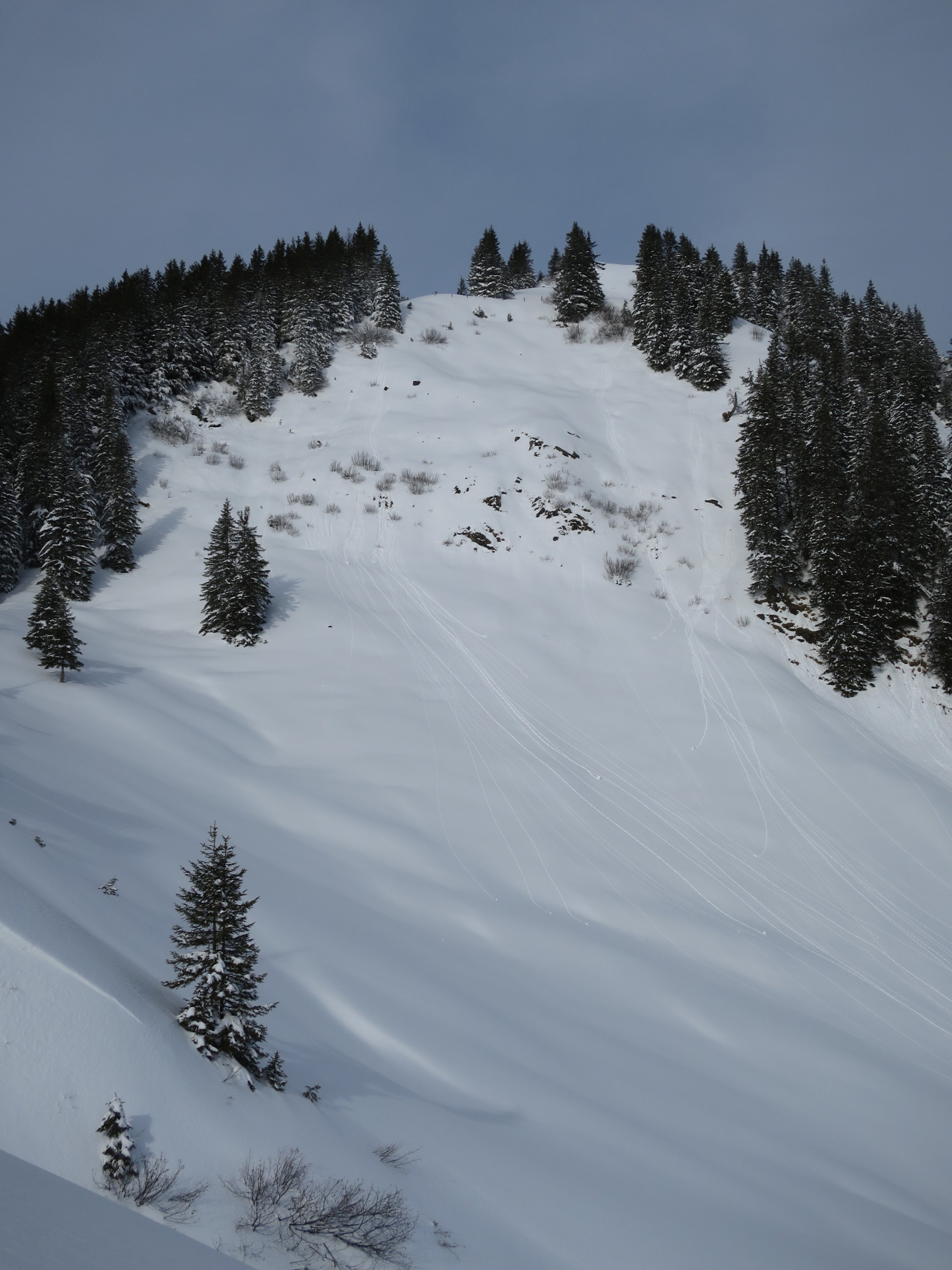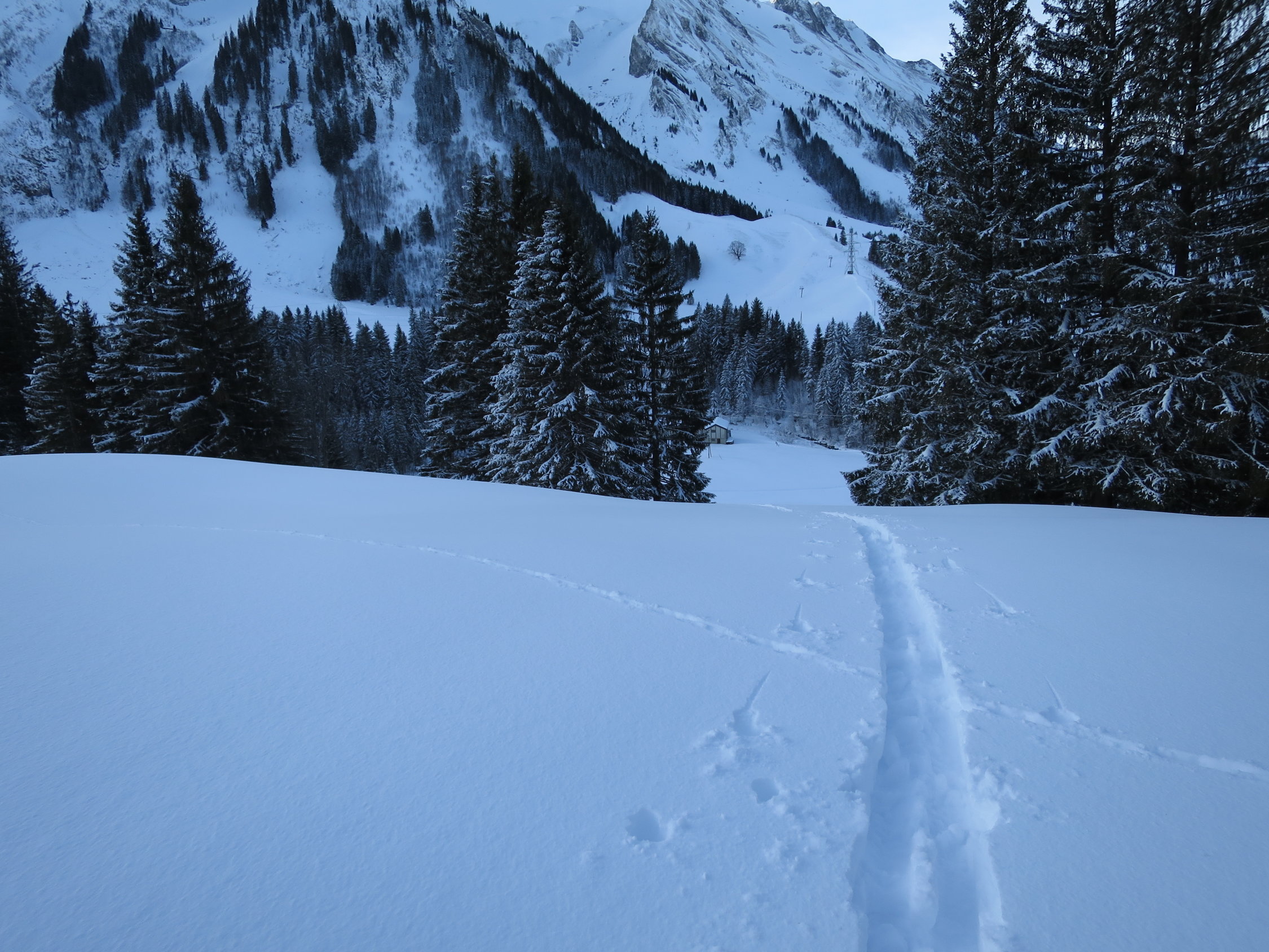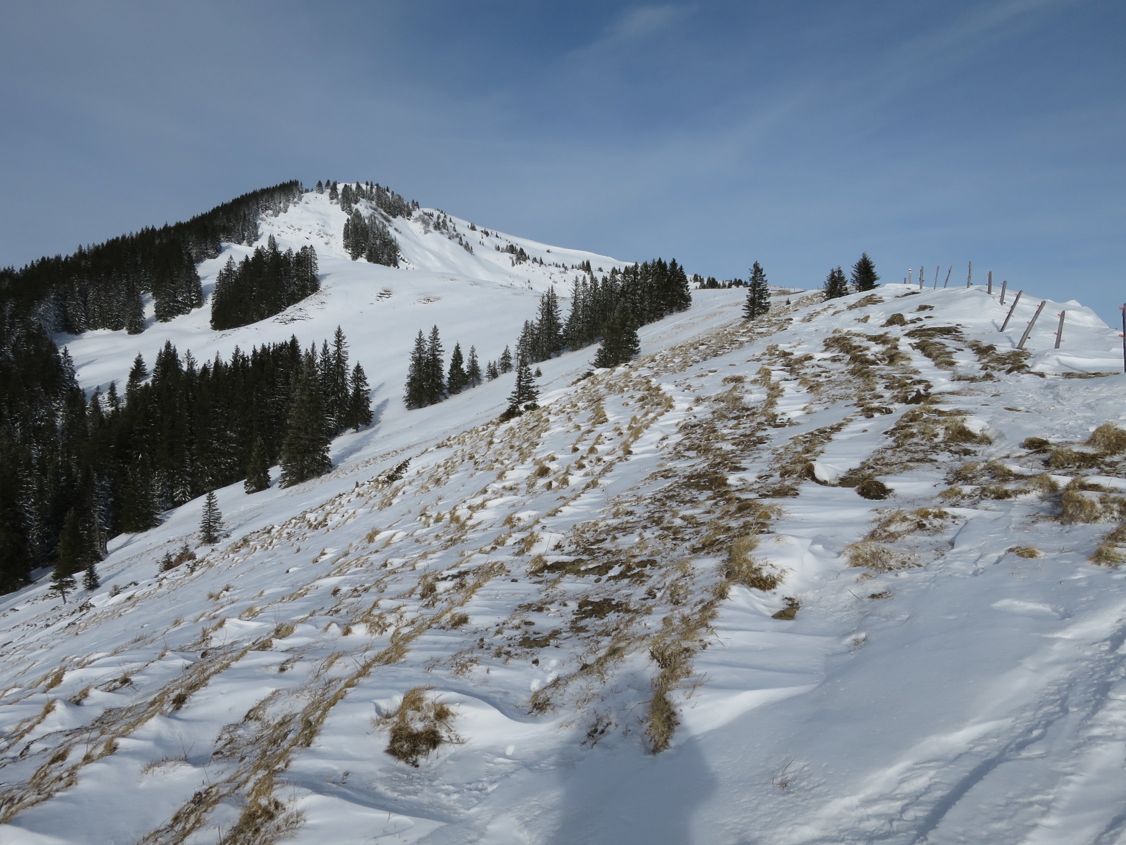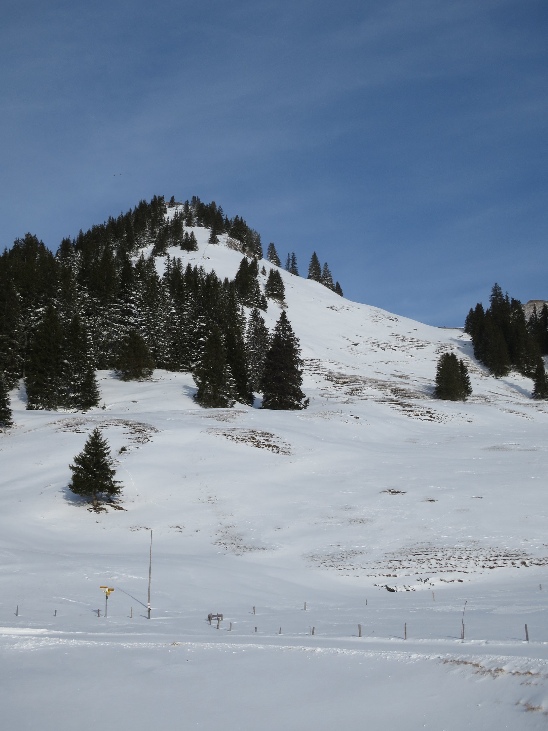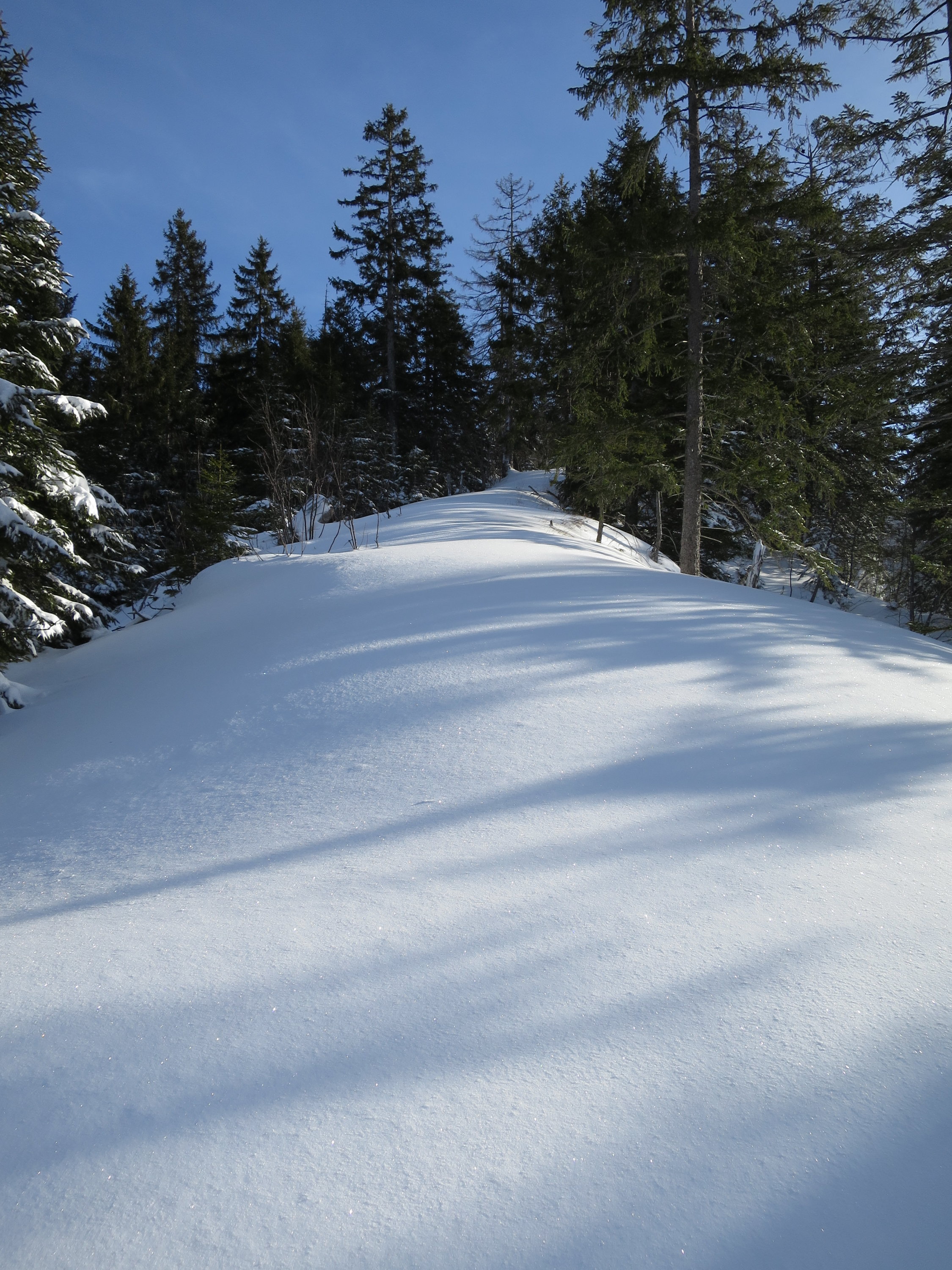 Im Wald und am Waldrand hat es 20-40 cm Neuschnee auf einer guten Unterlage. Doch offene Wiesen und Grate sind sehr stark verblasen - sogar ganz unten im Dorf. Der Schnee ist fast überall vom Wind verarbeitet, ist aber im Wald und in Waldnähe sehr schön zum Fahren. Ich habe mich wegen der Lawinengefahr entschieden, auf den Gipfel zu verzichten. Bin die direkte Abfahrt vom Pkt. 1767 gefahren - im mittleren Teil (Osthang) war der Schnee wegen dem Sonnenschein schon schwer, sonst ist es bis zur Strasse sehr gut gegangen.