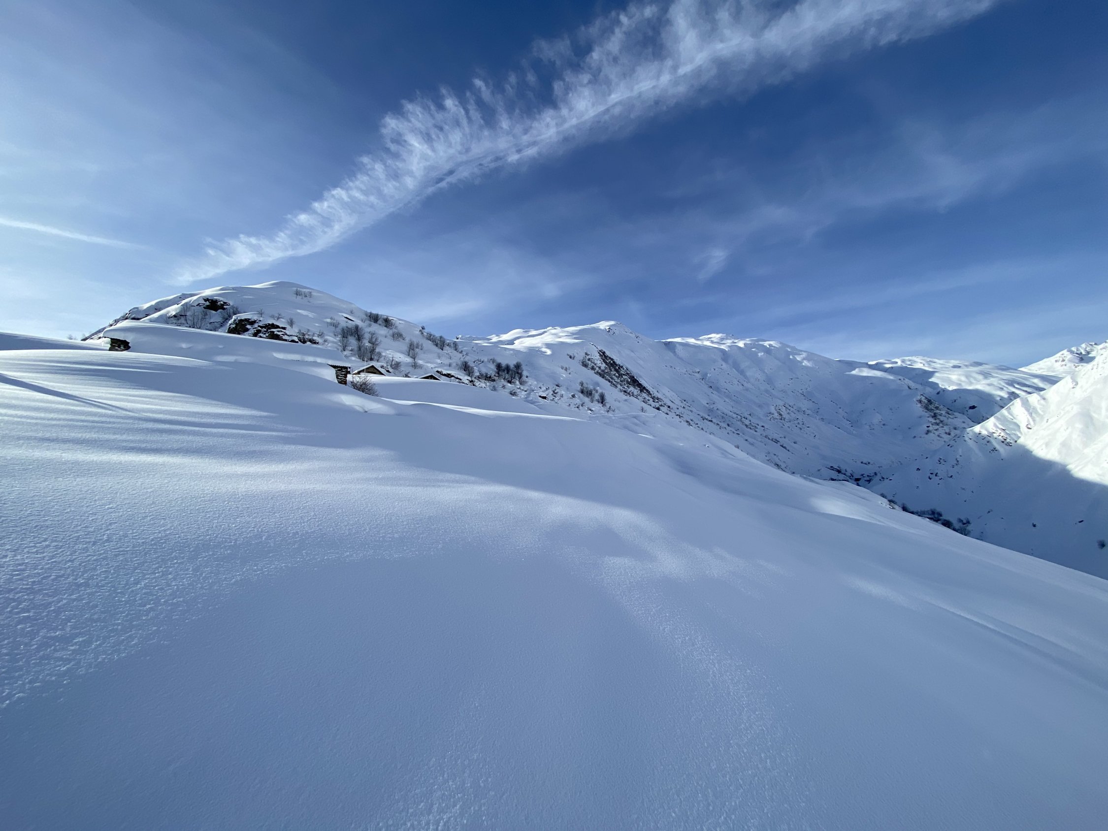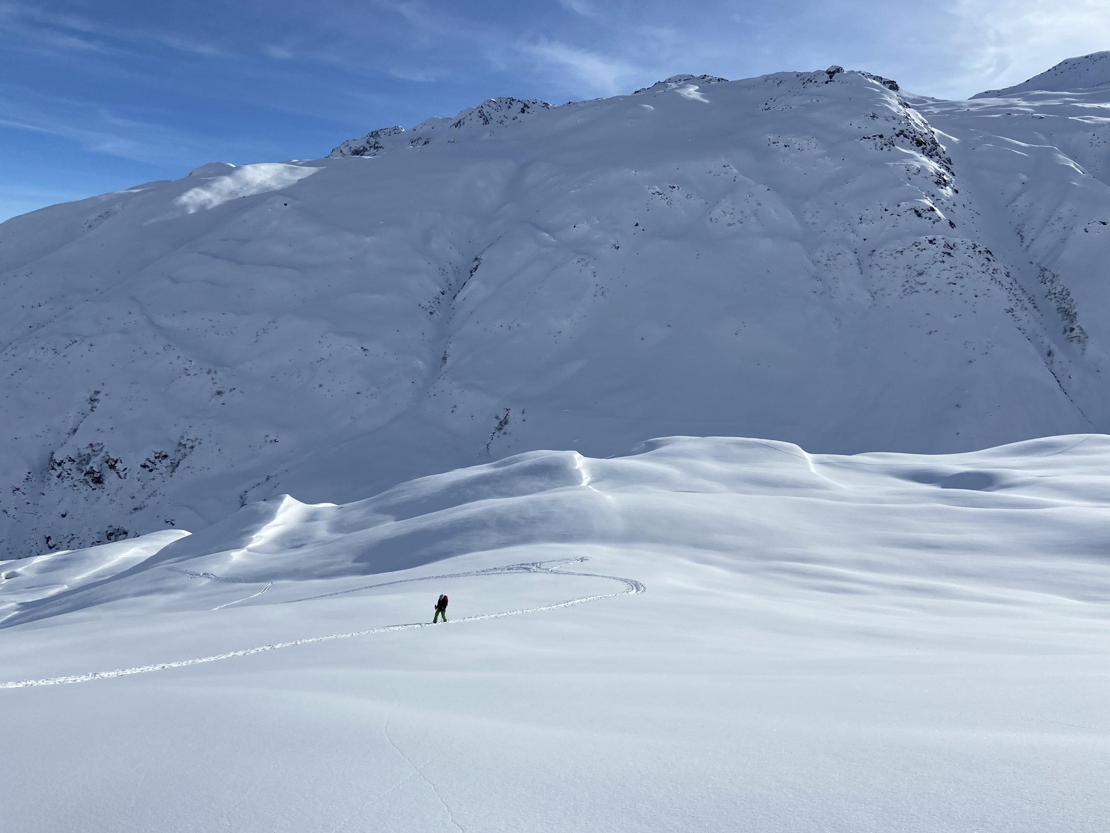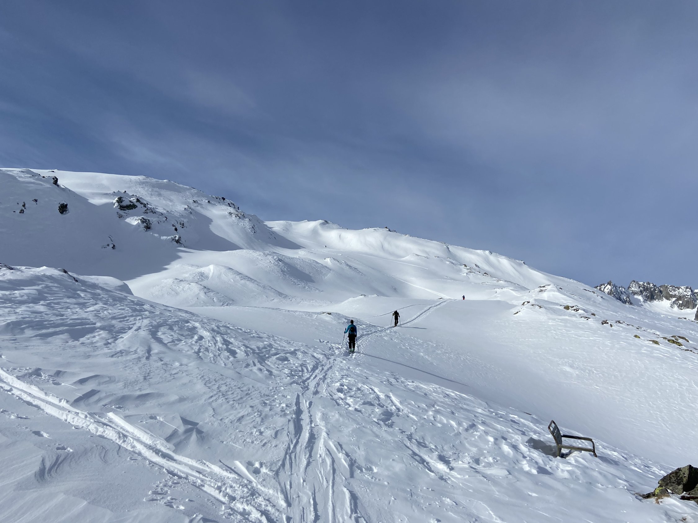 Endlich wieder Schnee. Unten davon sicher 30 cm. Danke an den Spurer! Es dürfte für die Abfahrt trotz Andrang auch noch etwas Platz haben. Oben in den Mulden war der Schnee leider windgepresst und am Grat sogar ganz abgeweht. Eine (kleine) Spontanlawine in Gratnähe. Sonst nur wieder Gleitschneerutsche in den Südhängen.