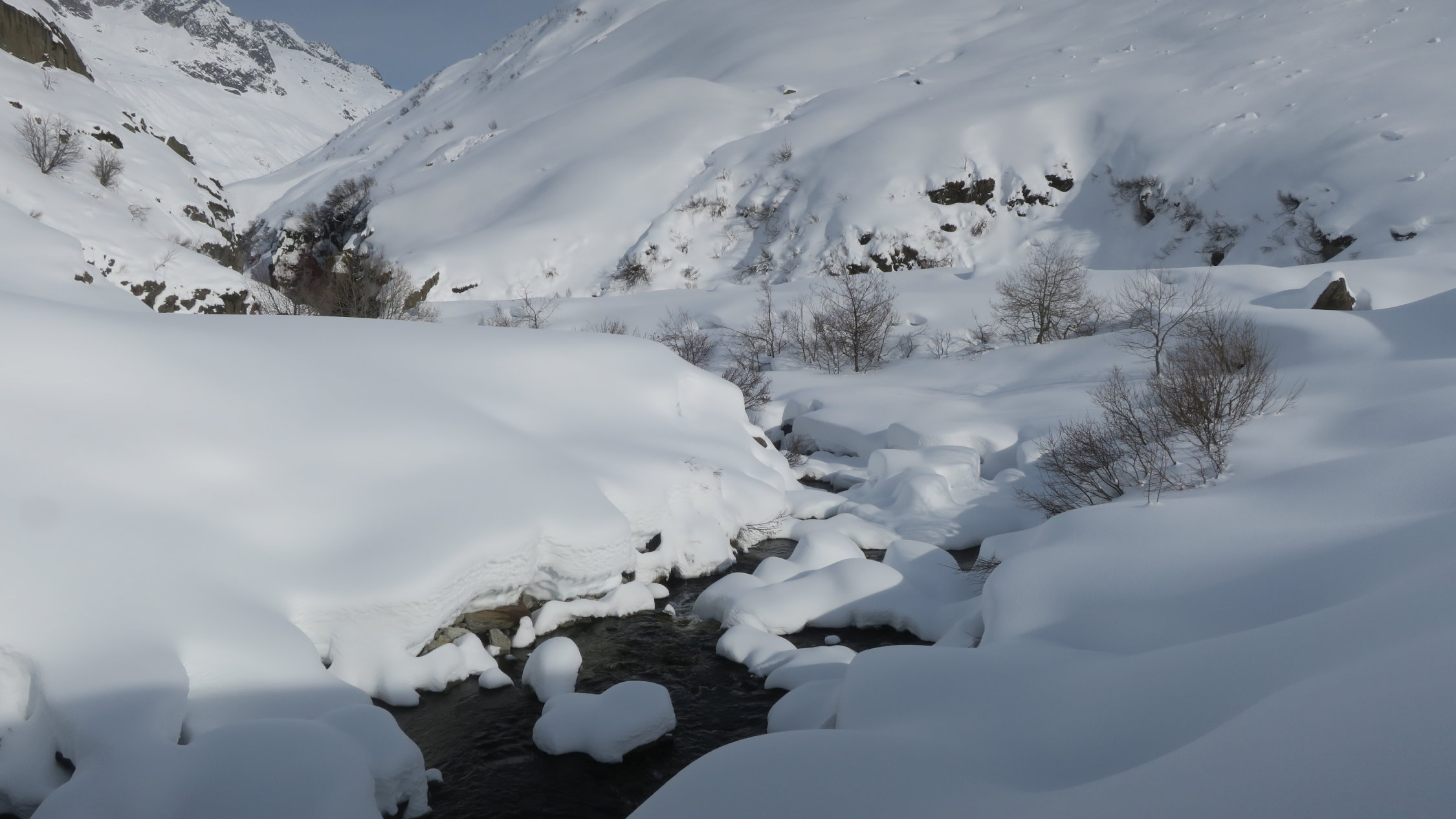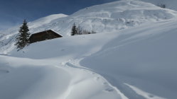 Mach ich halt noch einen zweiten Aufstieg, diesmal mit Spur, dachte ich. Doch ein Snowboarder mit Schneeschuhen hat meine Spur demoliert, so dass mir die Lust darauf vergangen ist. Dafür gab's einen Zusatzausflug ins Witenwasserental, wo eine halb zugeschneite Spur und die perfekt im Tal stehende Sonne zu einem sehr angenehmen und windstillen Mittagsspaziergang lockten. Und bei Oberchäseren fand ich dann doch noch einen hübschen Platz für eine gemütliche Pause.