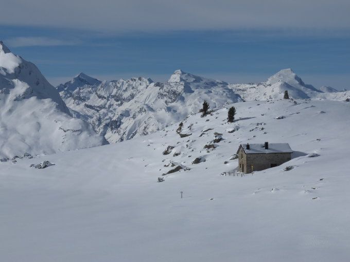 ganze Tour wunderschön eingeschneit. Die Aufstiegspur liess sich im oberen Teil bei der angespannten Lawinensituation durch relativ flaches Gelände anlegen.