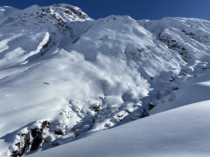 Durch die Temperaturen und den Regen in der Nacht ist der Schnee bis über 2000 recht durchweicht und schwer (zum fahren aber heute gut) - Start war mit 10.30 Uhr aber eher spät, dafür Sonne satt. Unten wird es am nächsten Morgen wohl etwas harschig werden. Darüber aber noch schöner Powder. Allerdings weniger als erwartet nach dem gestrigen Ausflug auf den Stotzigen. An diesem waren heute übrigens geschätzt über 40 Leute unterwegs.