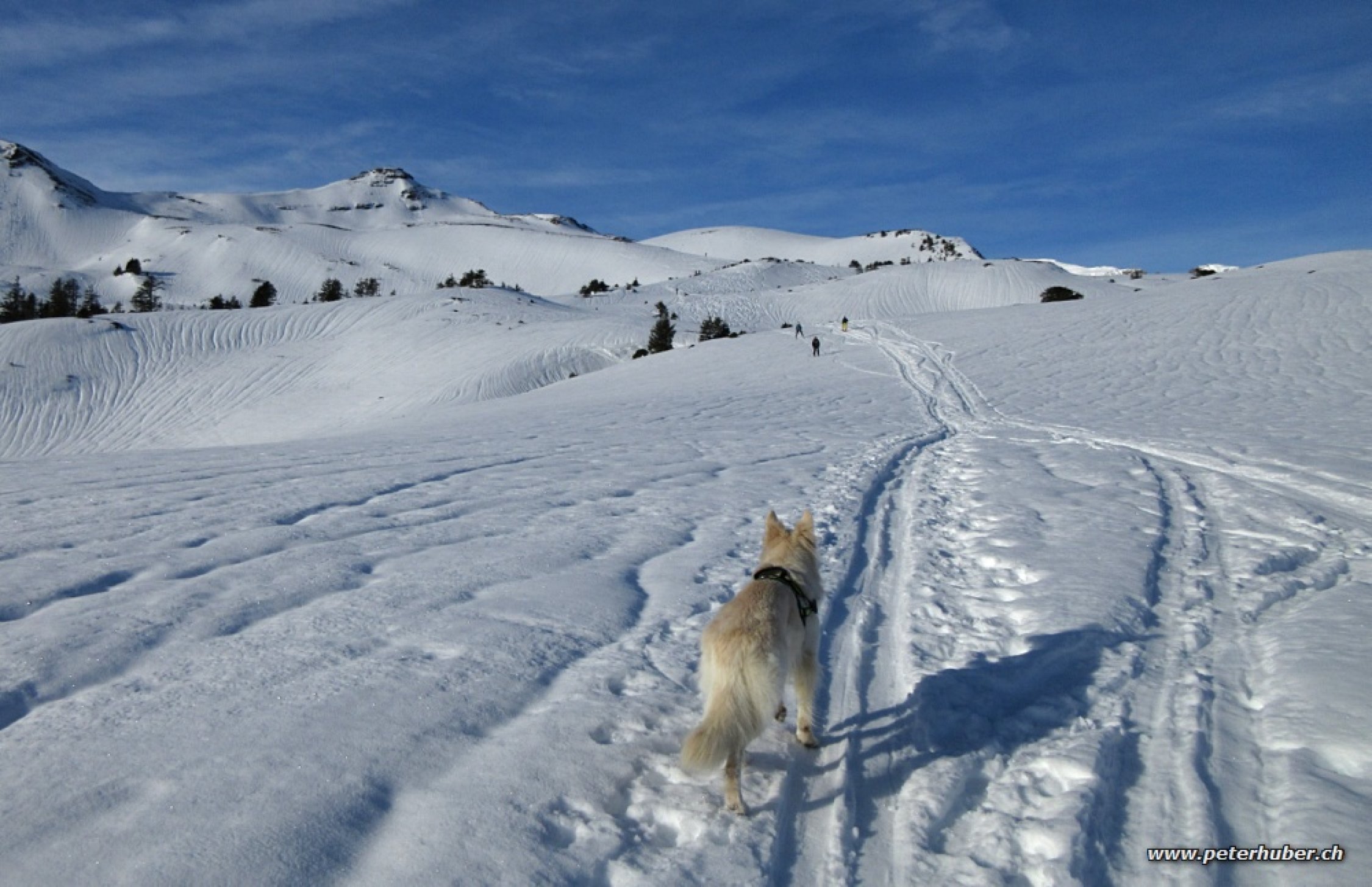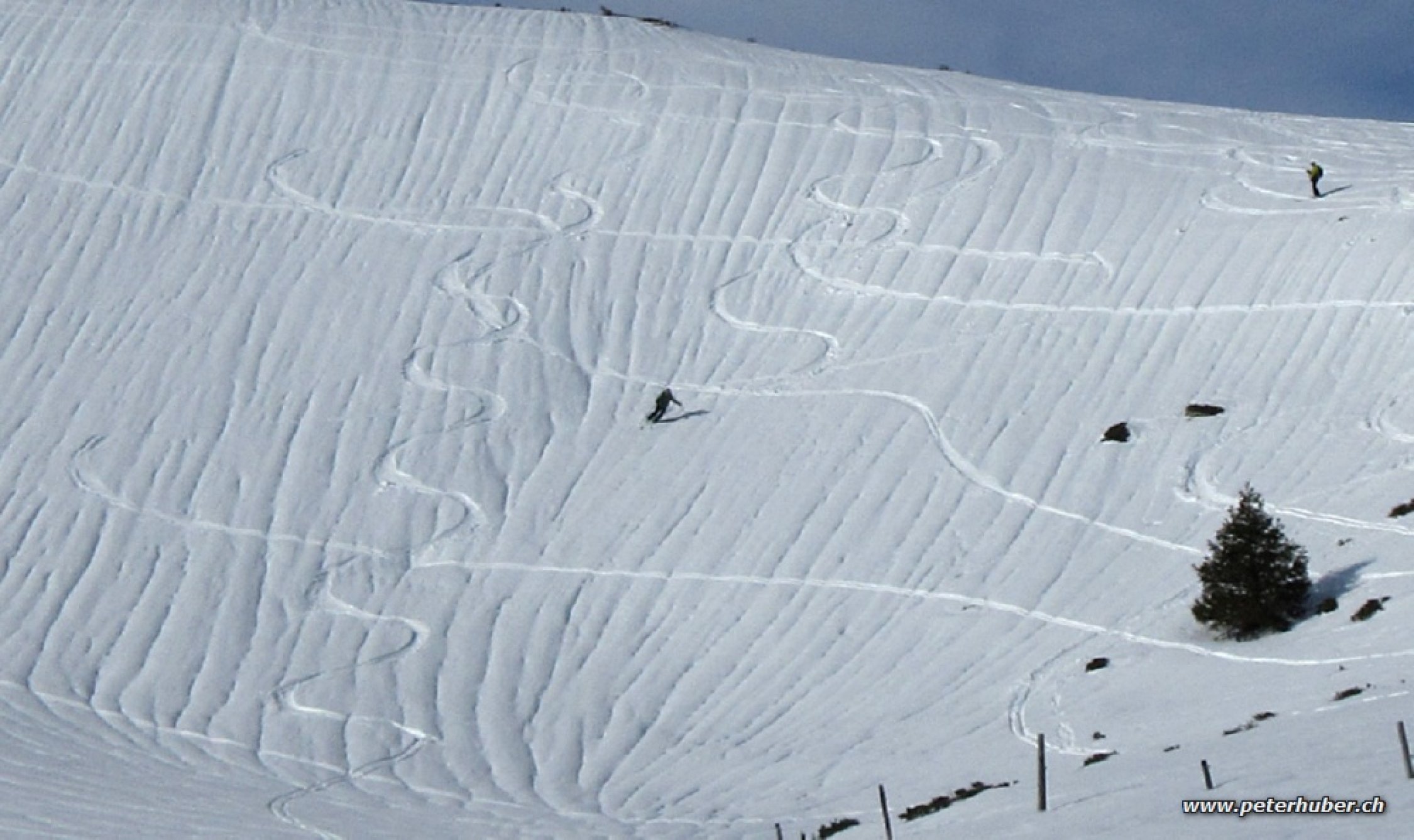 Die Abfahrt war besser als erwartet. In den Sonnenhängen feuchter Schnee, gut zu fahren. Im Wald wo noch keine Sonne drauf gekommen ist deckelig. Mit Kraft auch fahrbar. Unter 1500 m dann eine schmale Piste vom heutigen Skirennen des SC Vermol. Die Teilnehmer mussten zu Fuss zum Start aufsteigen! Wir genossen die Piste um den weniger guten Schnee zu umgehen.