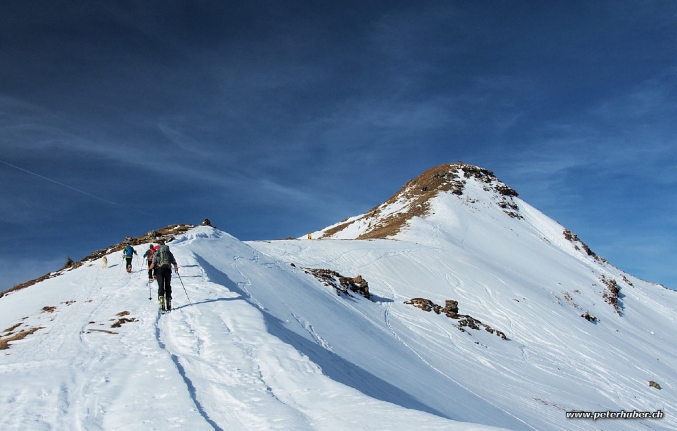 Früh gestartet. Um 7:30 war der Parkplatz schon fast voll. Morgens strahlend blauer Himmel. Die Wolken kamen erst später. Am Start hat es zirka 20 cm gesetzten Schnee, der am Morgen gerade noch gefroren war. Die ersten 500 Hm Deckel und darunter 20 - 30 cm Lockerschnee. Stellenweise eisige Spur. Die letzten 100 m zum Gipfel sind schneefrei.