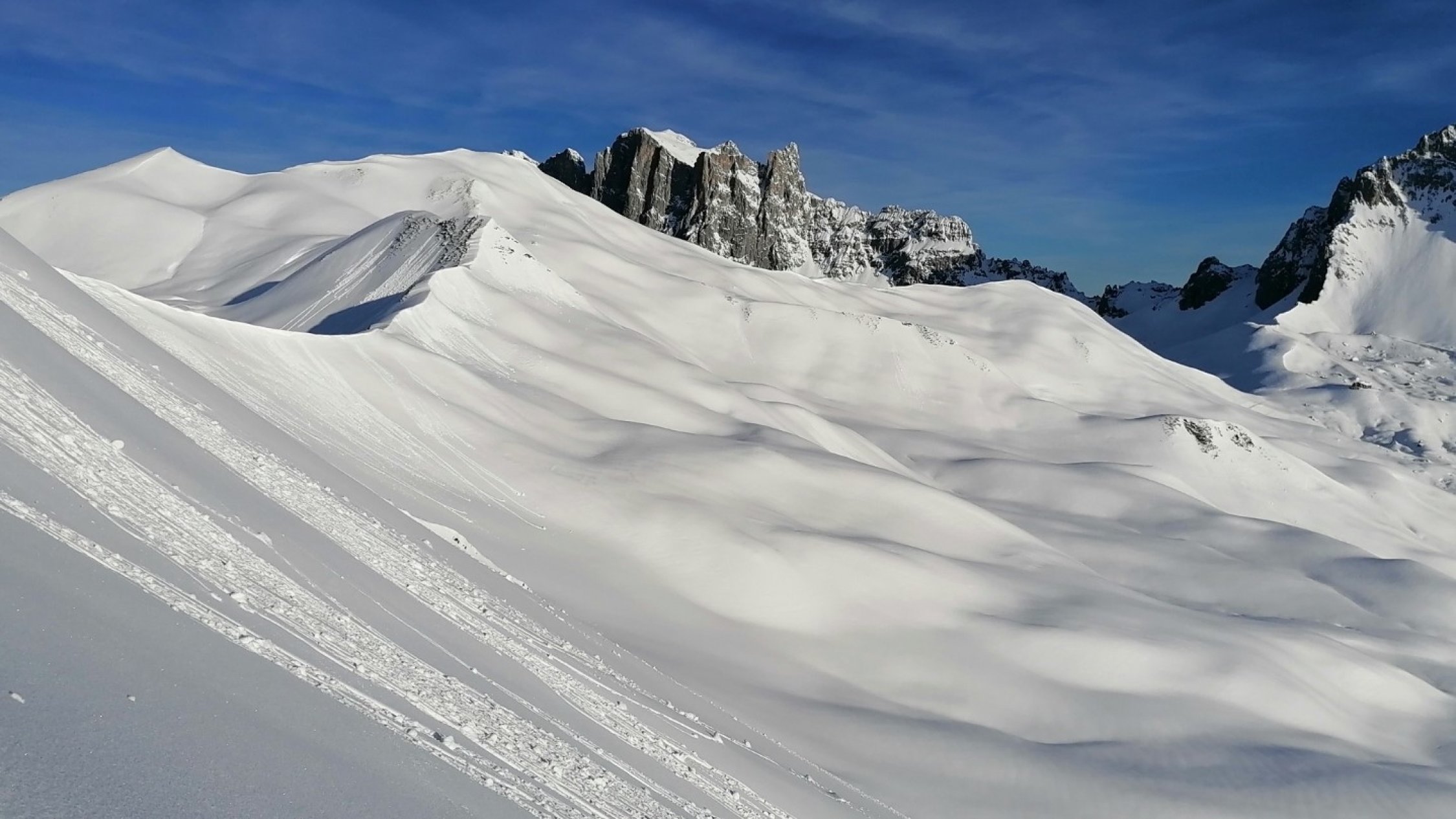 Sehr schöner Tourentag mit genügend Schnee. Pulverschnee leider unterm Deckel ( etwas schwierig zum befahren)