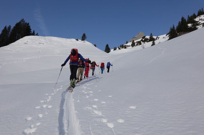 Bei der Führungstour der Naturfreunde Hard und Vorarlberg beschlossen wir, Steigeisen und Pickel als Sicherheitsmaßnahme mitzunehmen. Es wäre auch ohne gegangen. Die anspruchsvollen und steilen Passagen ließen sich mit Steigeisen und Pickel komfortabel und sicher bewerkstelligen. Es hat sich gezeigt, dass bei der Spitzkehrentechnik und auch bei der Abfahrt im harten Schnee und sehr steilen Hang noch verbesserungspotential besteht. Sicheres und sturzfreies Aufsteigen und Abfahren sind auf Touren wie dieser mit diesen Verhältnissen ein Muss. Alles in allem hatten wir eine schöne, reizvolle und auch spannende Skitour auf die Hochkünzelspitze gehabt. Das besiegelten wir noch beim gemütlichen Hock in der Uralp. Toll Gsi :-) Uf http://www.spaceglider.at/touren/bsm.htm sind no a paar Fötile …