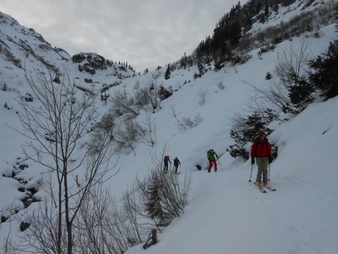 Es hatte die ganze Woche vorher strahlendes Wetter. Am Tourentag traf genau eine schwache Störung ein, was den Himmel trübte. Trotz des wenigen Schnees konnten wir von der Brücke weg auf Skier gehen. Die steile Flanke beim Giglturm und den Gipfelanstieg gingen wir mit Steigeisen und Pickel. Schon im Aufstieg zeigte sich die unterschiedliche Schneequalität: Pulverschnee, Schmelzkruste , Harsch. Die Wolken waren hoch und die Sicht ausrechend gut. Auch der schöne Rundblick vom Gipfel bereitete Freunde. Anspruchsvoll ging es vom Skidepot den steilen und bockharten Südhang hinunter. In der Ostrinne links vom Giglturm fuhren wir im Pulverschnee weiter. Durch überlegte Geländeausnützung fanden sich immer wieder schöne Abfahrtspassagen mit gutem Schnee. Weiter unten auf dem Alpweg haben wir die Ski ein Stück getragen.