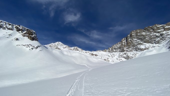 Bis auf etwa 2400m liegt eine Kruste auf den Schnee. Oberhalb noch recht guter Pulver.