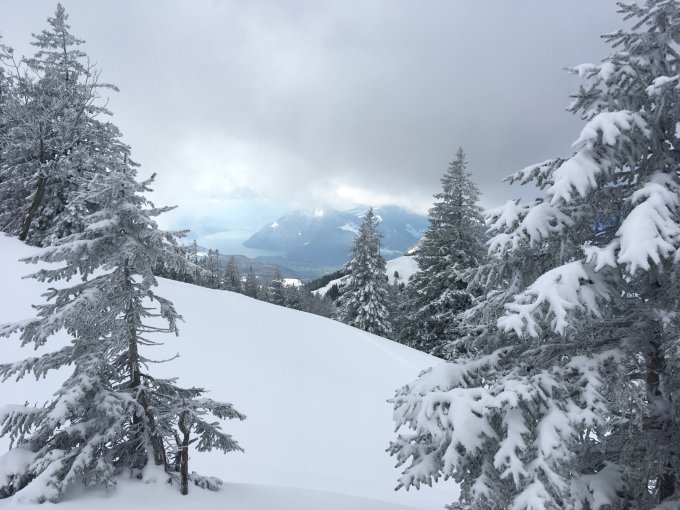 Frischer Pulverschnee, selbst im bewaldeten Teil genug, an ganz wenigen Stellen merkt man die mangelnde Unterlage.