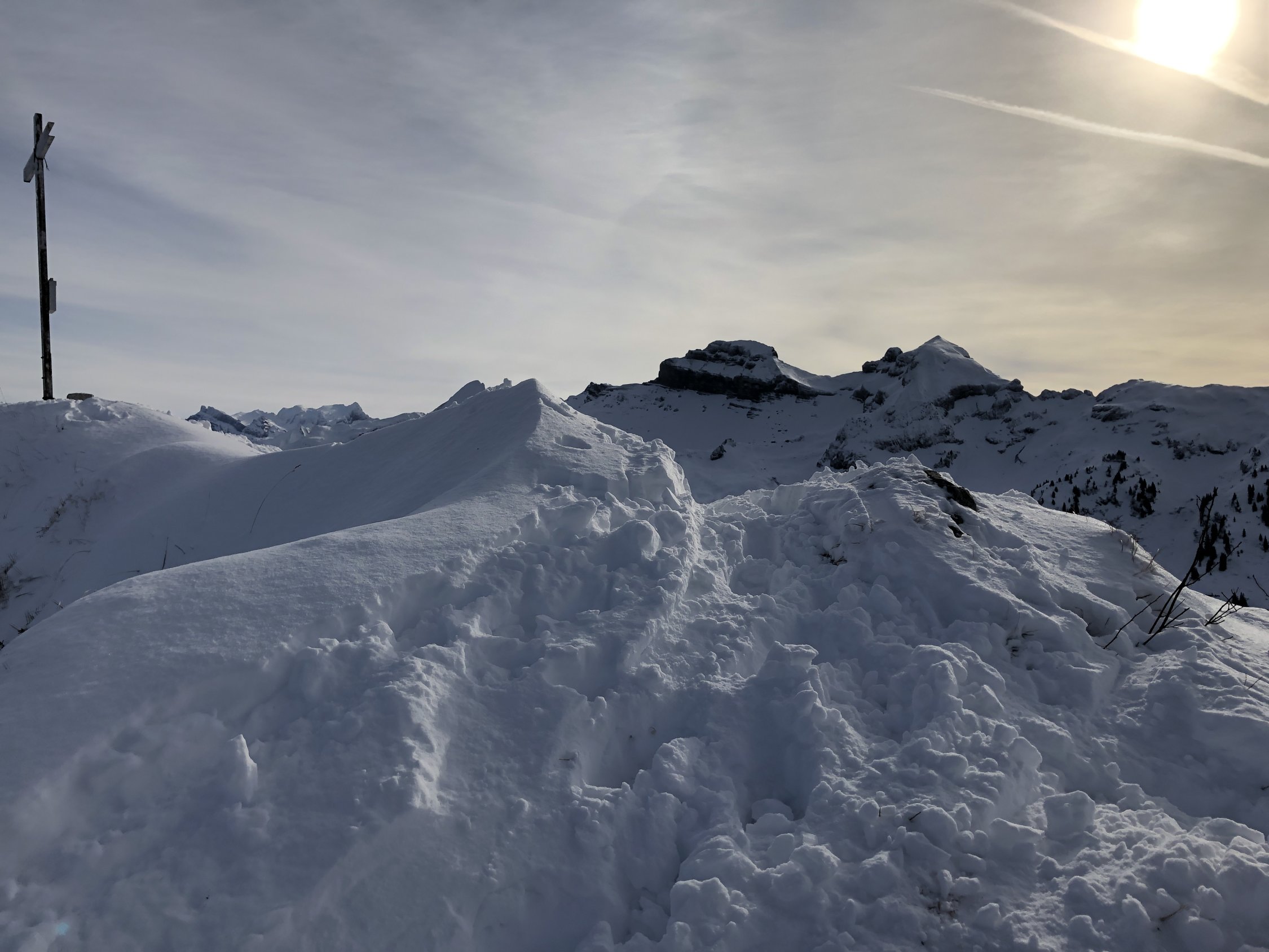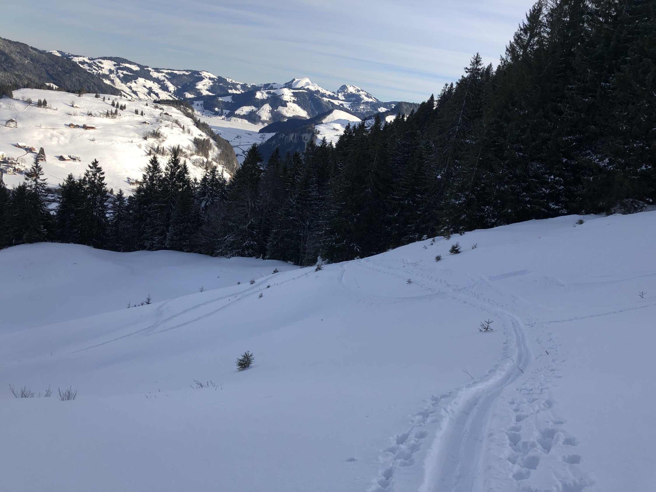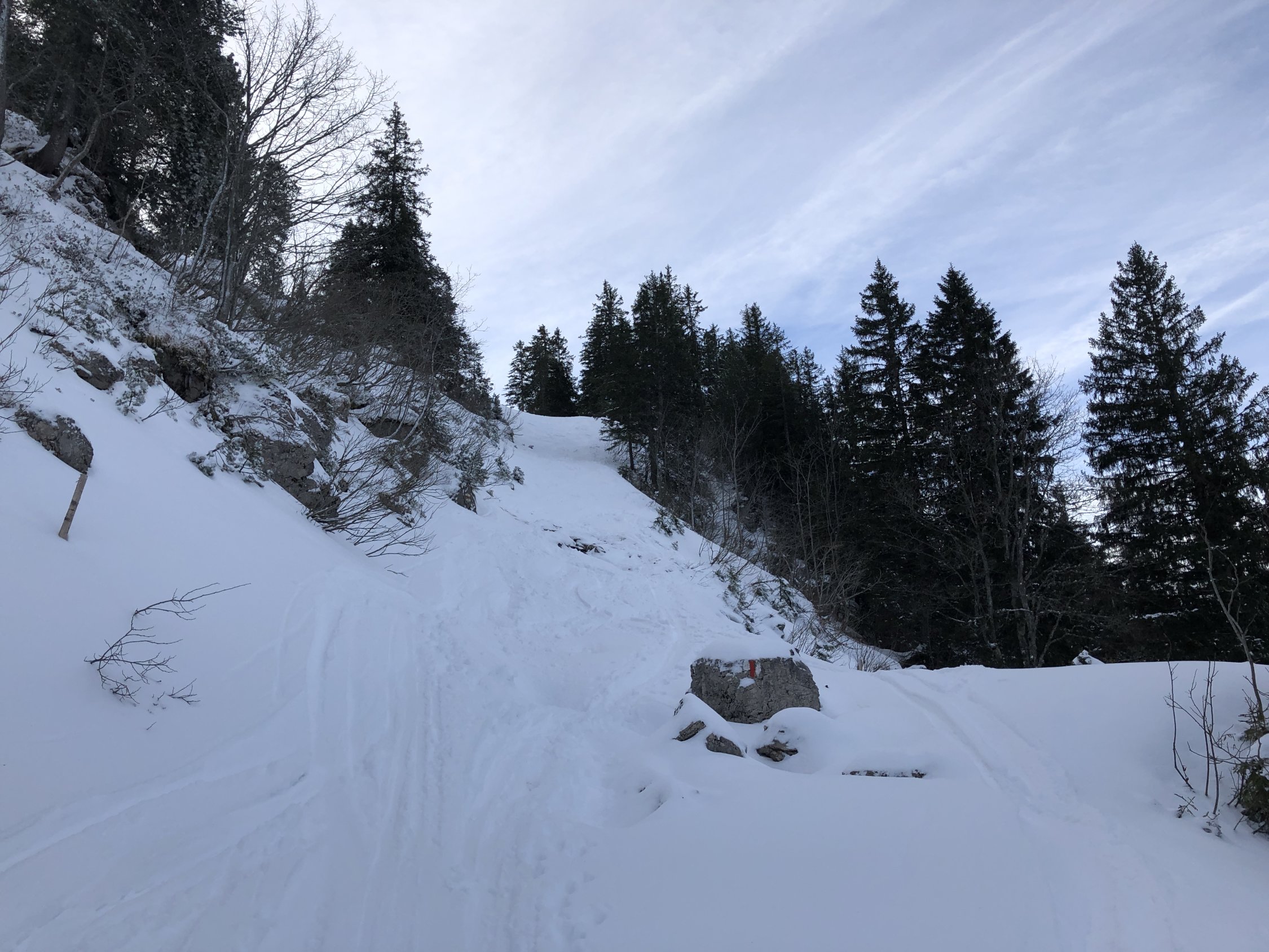Unten wie schon die ganze Saison knapp Schnee. Pulver auf der ganzen Route. Aber teilweise abgeblasene Stellen. Die kurze Steilstufe beim Wässerli lässt sich aber gut mit den Skis machen.