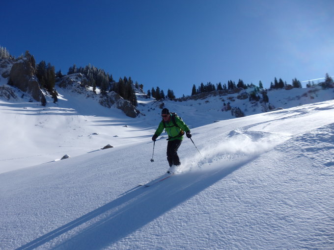 20-25 cm lockerer, ohne Windeinfluss gefallener Pulverschnee auf gefrorener Unterlage. Hervorragende Bedingungen auf allen Abfahrtsvarianten. Viele Tourengänger unterwegs.