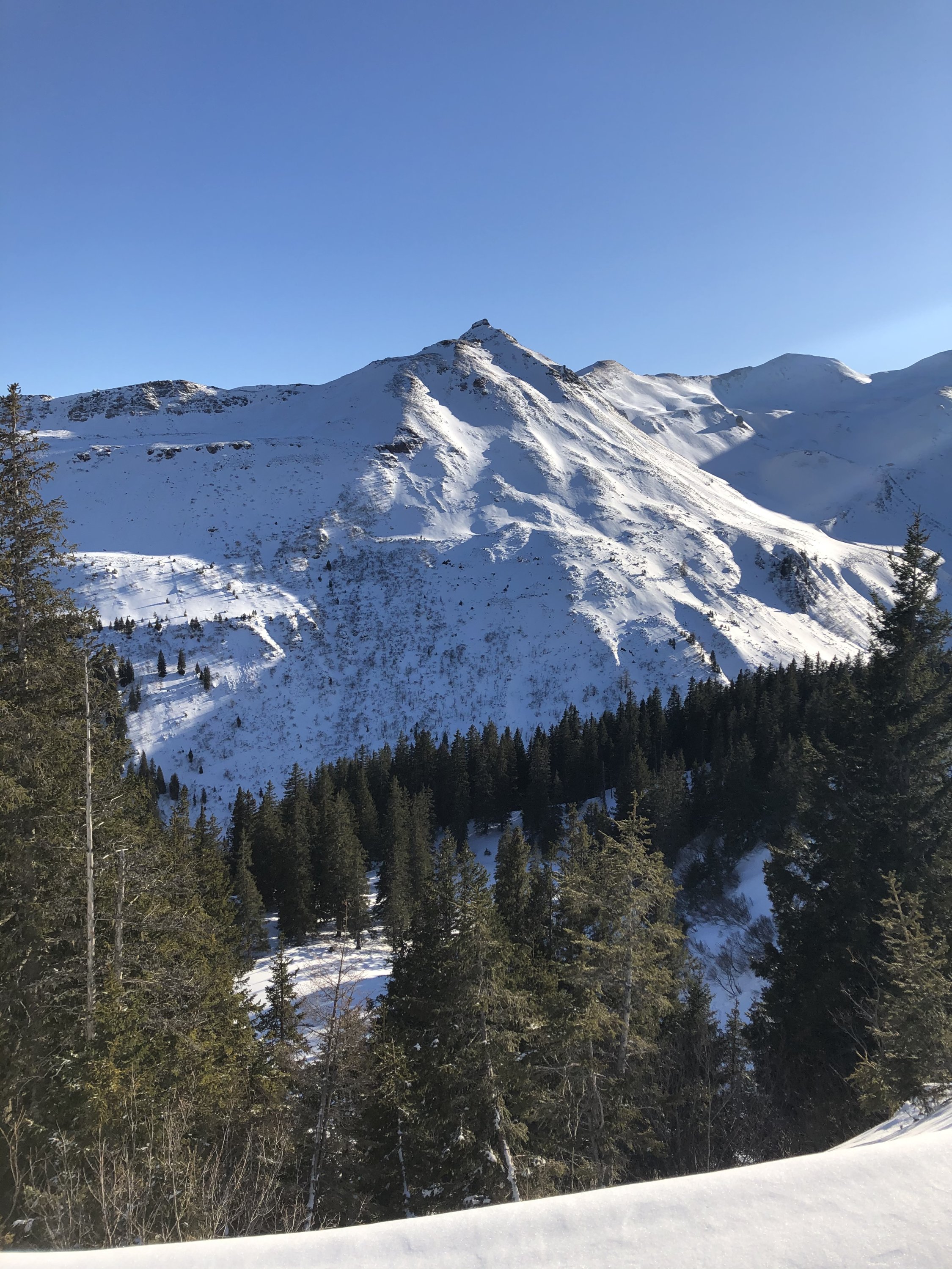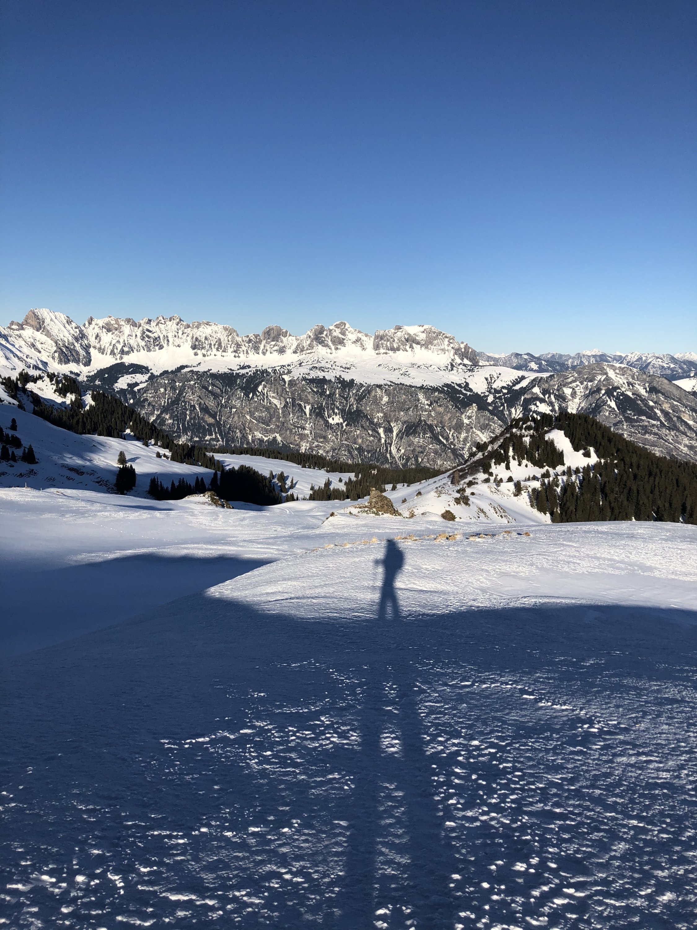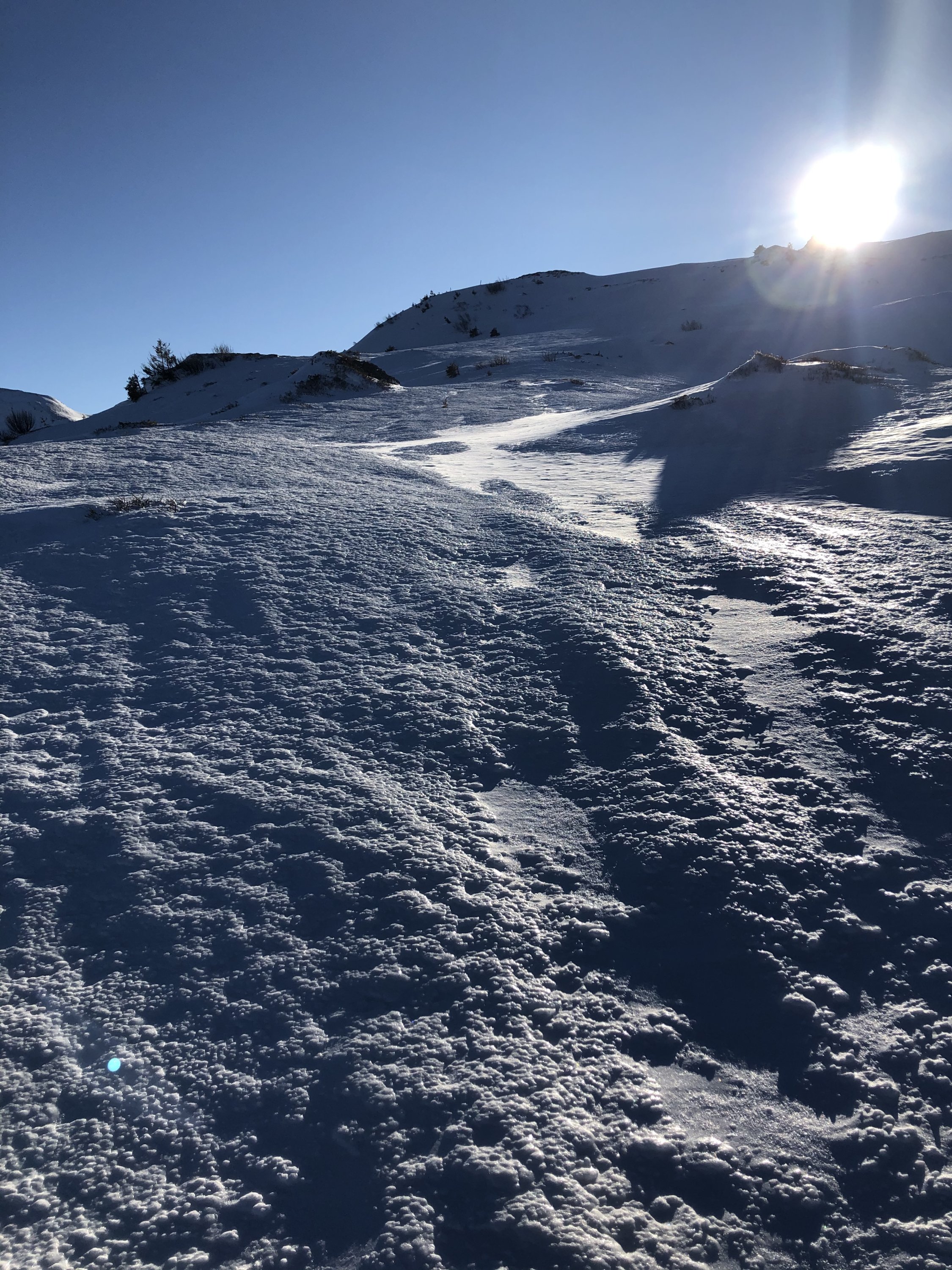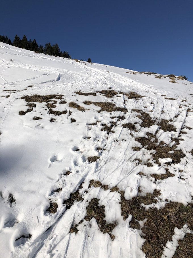 Ein Gipfel so spektakulär wie sein Name. Wäre die blaue Linie auf der Skitourenkarte hier nicht einfach fertig, man würd‘s nicht mal merken, dass man draufsteht. Schnee unten knapp, oben bis auf den pockenartigen Eispanzer abgeblasen. In der Abfahrt schön zwischen etwa 1800 und 1350MüM. Die letzten 50 Höhenmeter durch den Wald habe ich die Ski getragen.