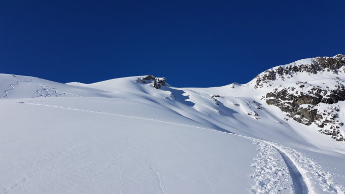 Bin vom Gipfel bin ich etwas westlich von der Aufstiegsspur den Hang runter und etwas weiter unten wieder in die Aufstiegsspur. Dann direkt den Osthang runter über eine kleine Krete mit wirklich super Pulverschnee. Dann wider in die Aufstiegsspur und zurück zum PP La Veduta