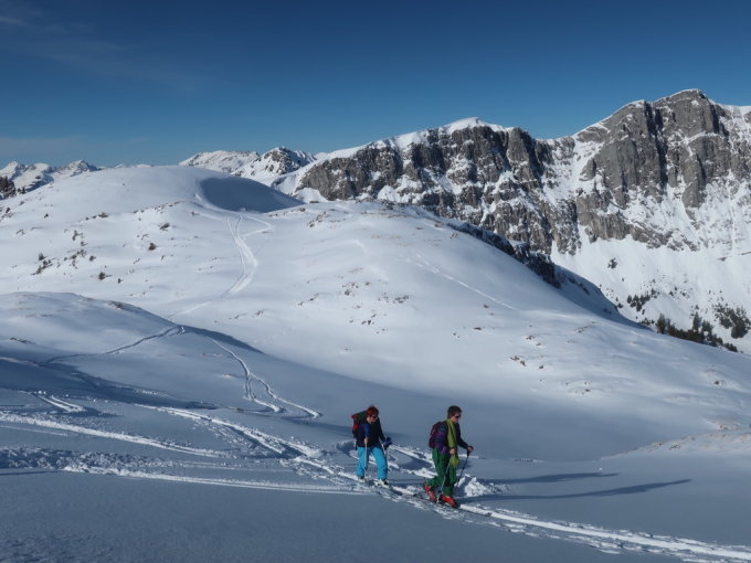 Weg gut eingeschneit, gute Spur bis auf den Gipfel. Abfahrt in 20cm Traumpulver, Auf dem Grat oberhalb der Alphütte (1792m) teilweise etwas abgeblasen. Wenn man in den Mulden fährt kann man Steikontakte weitgehend vermeiden. Sehr lohnend, bisher wenig Spuren. An der Sonne sehr warm.