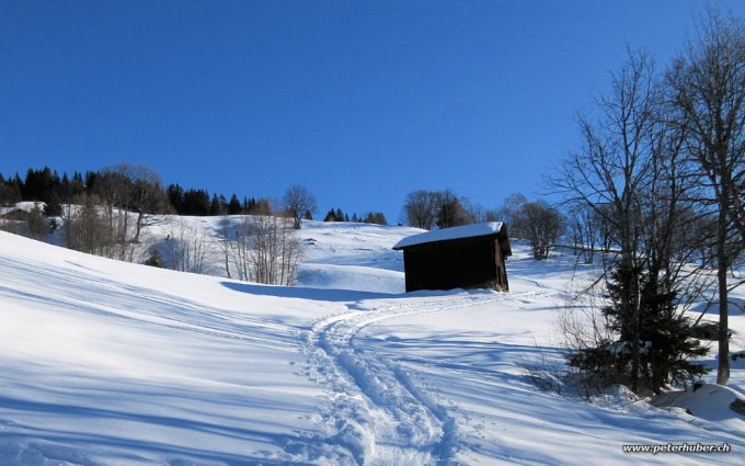 Für 1 - 2 Tage reicht der Schnee noch, auch in den Sonnenhängen. Ev. dann kurz der Strasse folgen. Morgens dürfte es einen Deckel haben. Doch mit der raschen Erwärmung sollte der wieder auftauen und dann als feuchter Schnee gut fahrbar sein.
